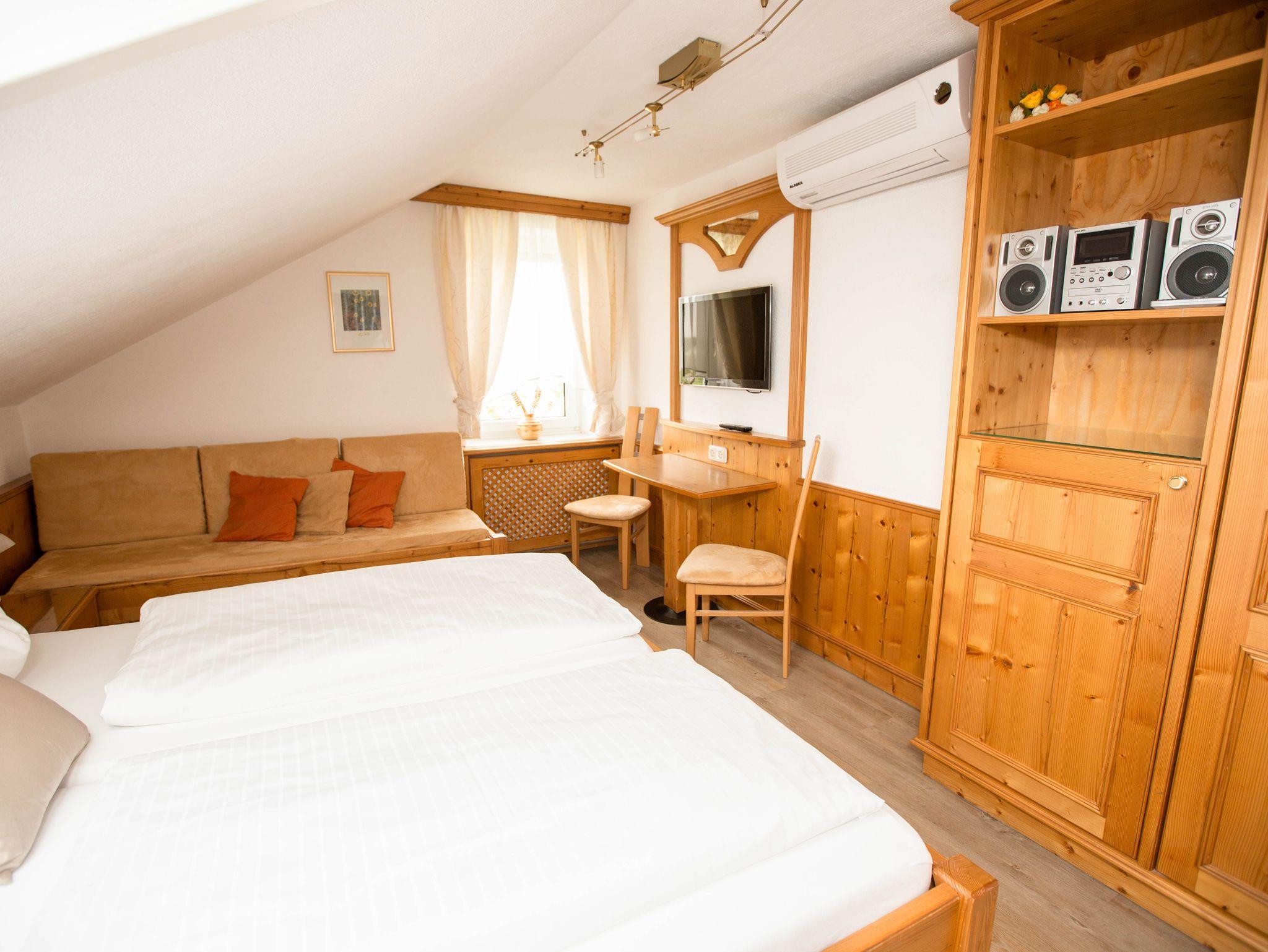 Unsere 4 de luxe Zimmer sind sehr stilvoll ausgestattet. Die Zimmer verfügen teilweise neben dem Doppelbett auch über eine gemütliche Sitzcouch zum Entspannen (als 3. Bett geeignet). Ein Flat-Screen oder Kabel-TV sowie W-Lan Anschluss und Klimaanlage runden das Angebot ab. Badezimmer mit DU, Waschbecken, WC und Fön.