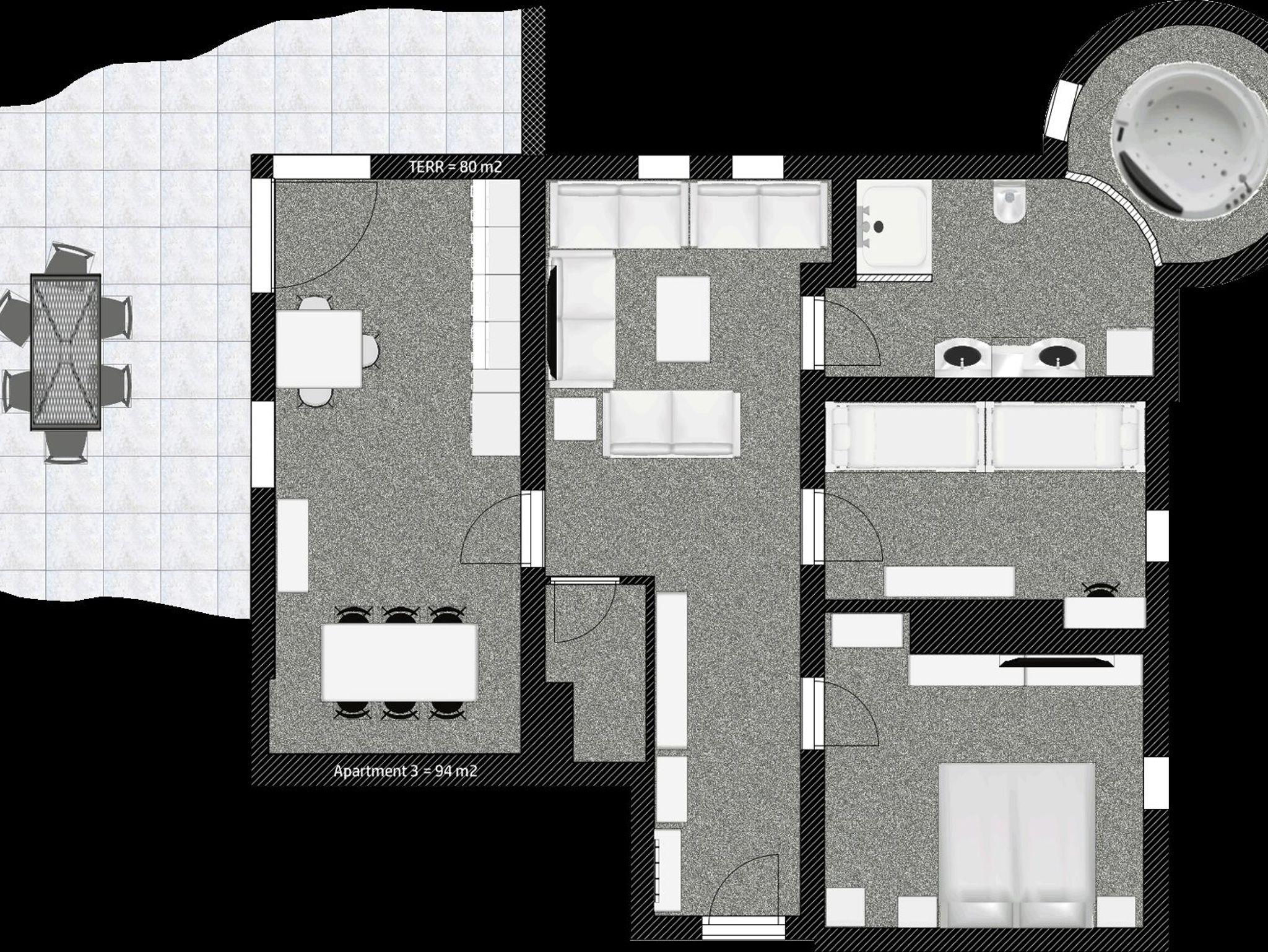 Dieses 94m² große Apartment bietet Platz für bis zu 6 Personen und verfügt über zwei Schlafzimmer – eines mit Doppelbett, das andere mit zwei Stockbetten. Die Couch mit Schlaffunktion bietet zusätzliche Schlafmöglichkeiten. Eine moderne Küche und eine große Terrasse laden zum Verweilen ein. Das Highlight: Ein Jacuzzi im Badezimmer, der für pure Entspannung sorgt. Perfekt für Familien oder Gruppen, die Komfort und Erholung suchen!