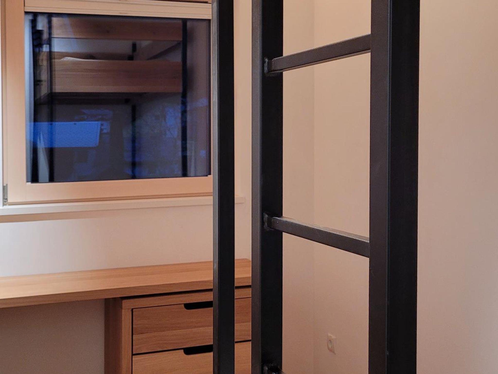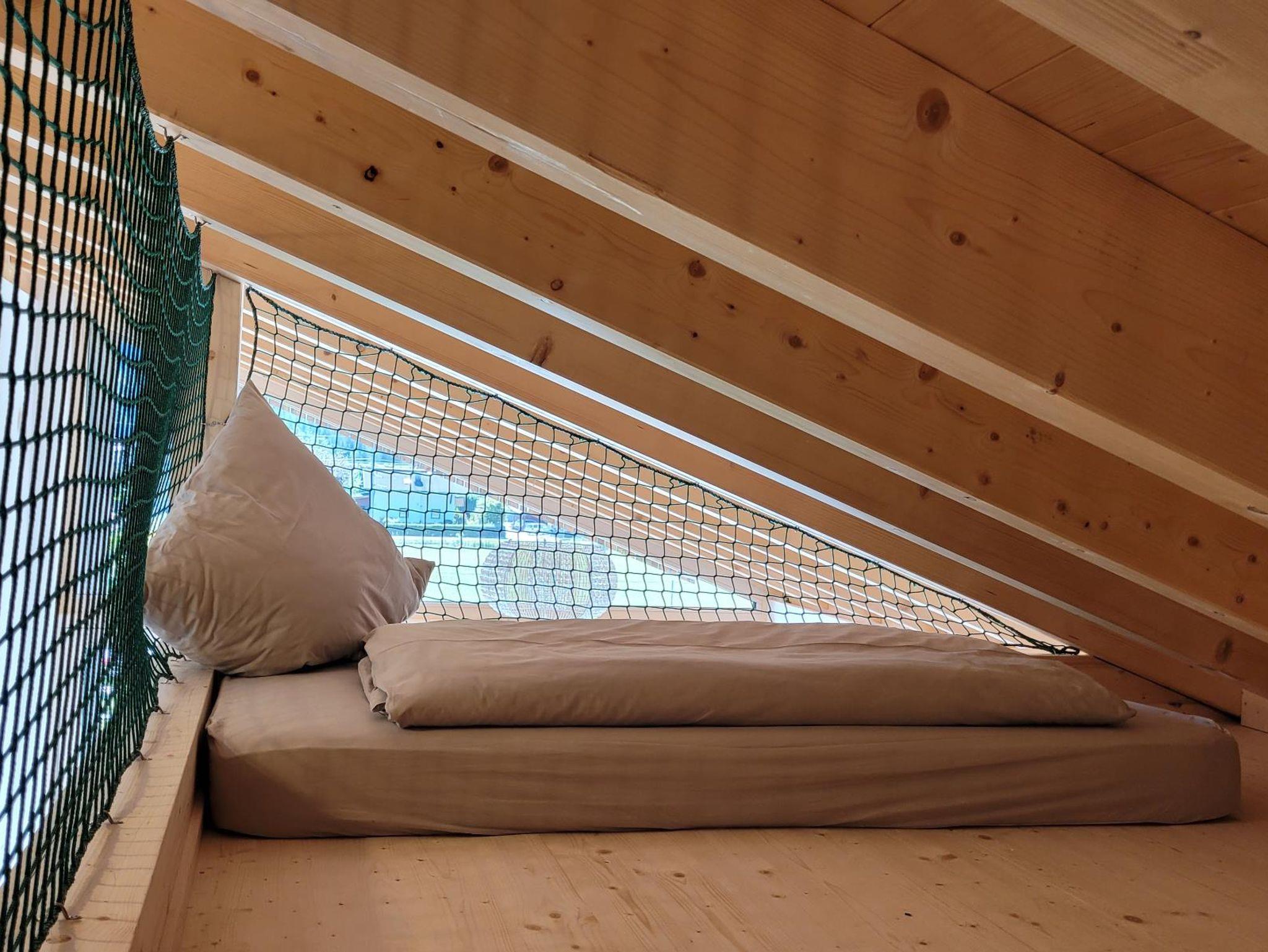 Im Obergeschoss liegen 2 weitere Schlafräume (1x Doppelbett, 1x Etagenbett) sowie 2 Badezimmer. 2 Zusatz-Schlafplätze befinden sich im offenen Matratzenlager unter dem Dachstuhl (niedrige Höhe).