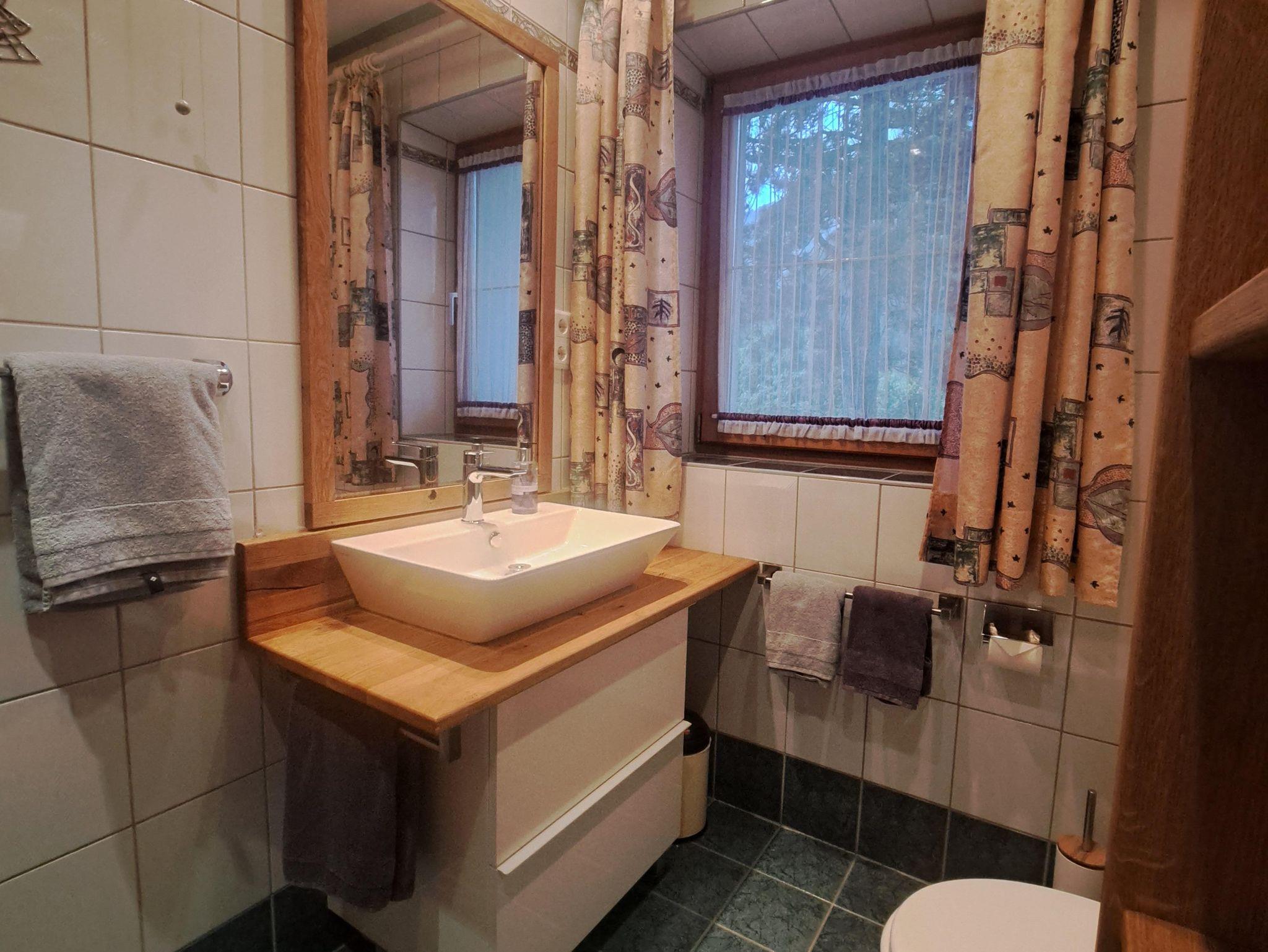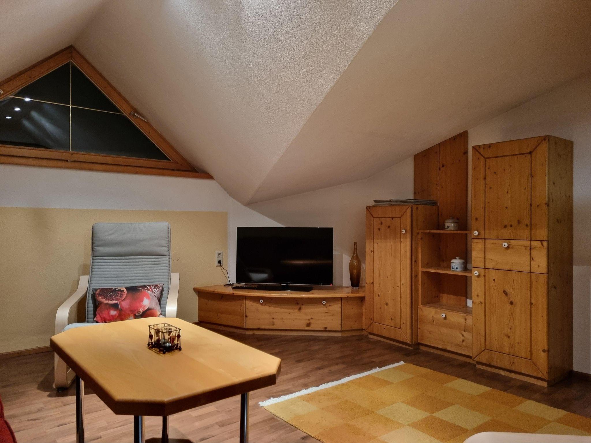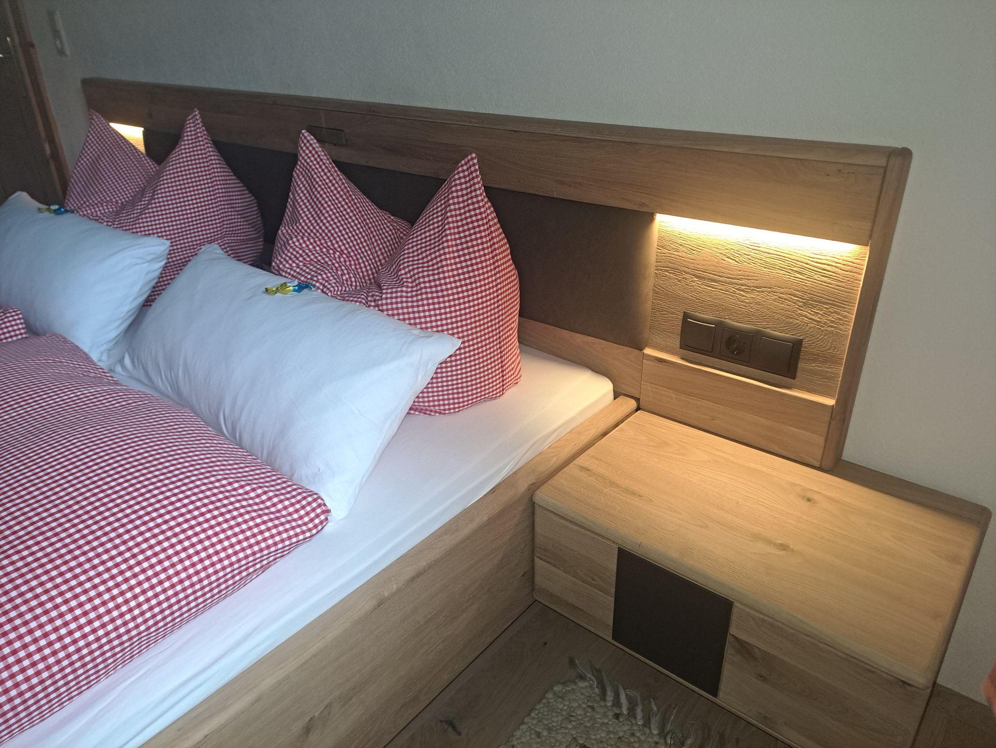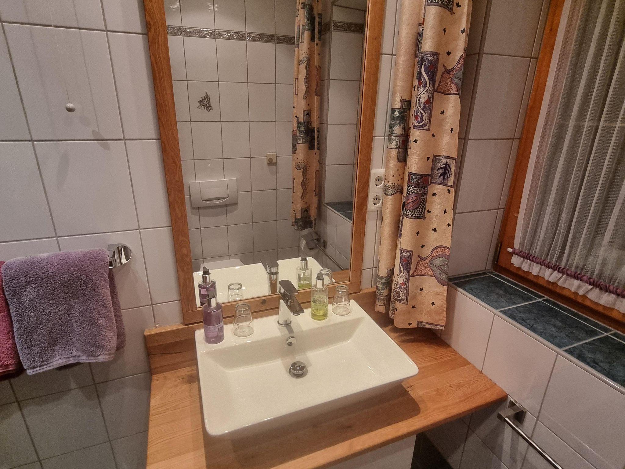 Unsere großzügige Ferienwohnung, ideal für 2-5 Personen, bietet 65 m² Wohlfühlfläche. Der kombinierte Wohn- und Schlafraum verfügt über eine ausziehbare Couch (2m x 1,8m), einen Landhausstil-Kleiderschrank und ein farbintensives Kabel-TV mit 20 Programmen. Die gut ausgestattete Einbauküche beinhaltet 4 Kochplatten, Backofen, Kühlschrank mit Gefrierfach, Toaster, Wasserkocher und Kaffeemaschine. Eine gemütliche Essecke lädt zum Verweilen ein.