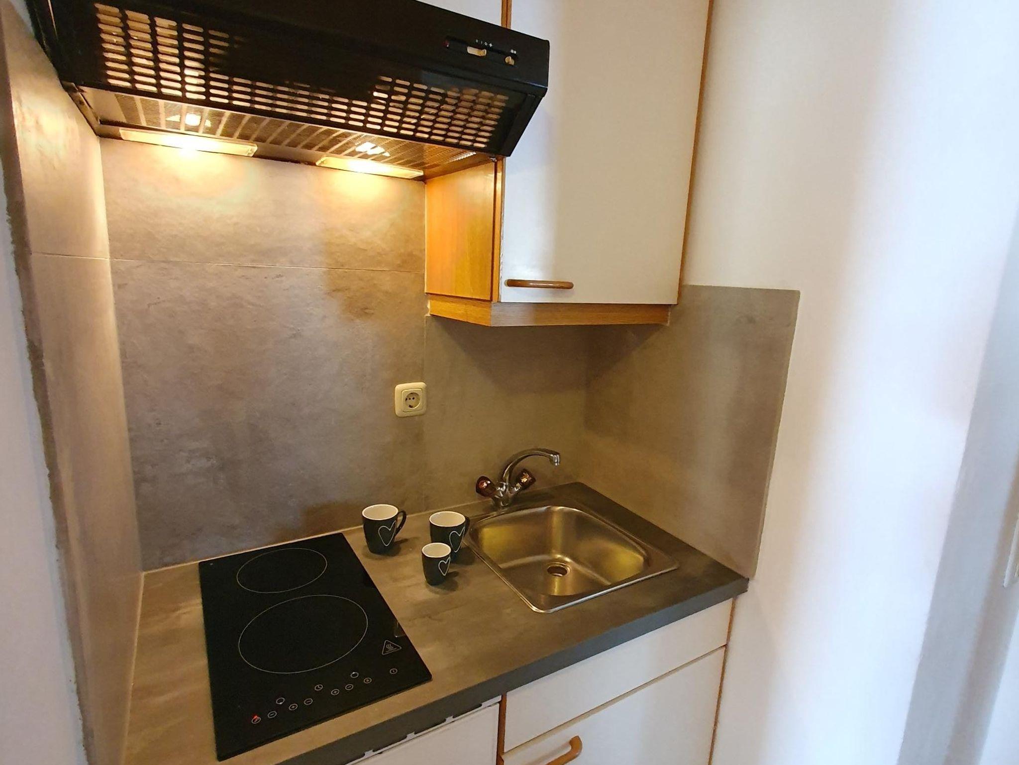 Eine gemütliche Ferienwohnung für 2 Personen mit Balkon, einer Kochmöglichkeit, Dusche/WC, einem geräumigen Wohn-Essbereich und einem separaten Schlafzimmer mit Doppelbett.