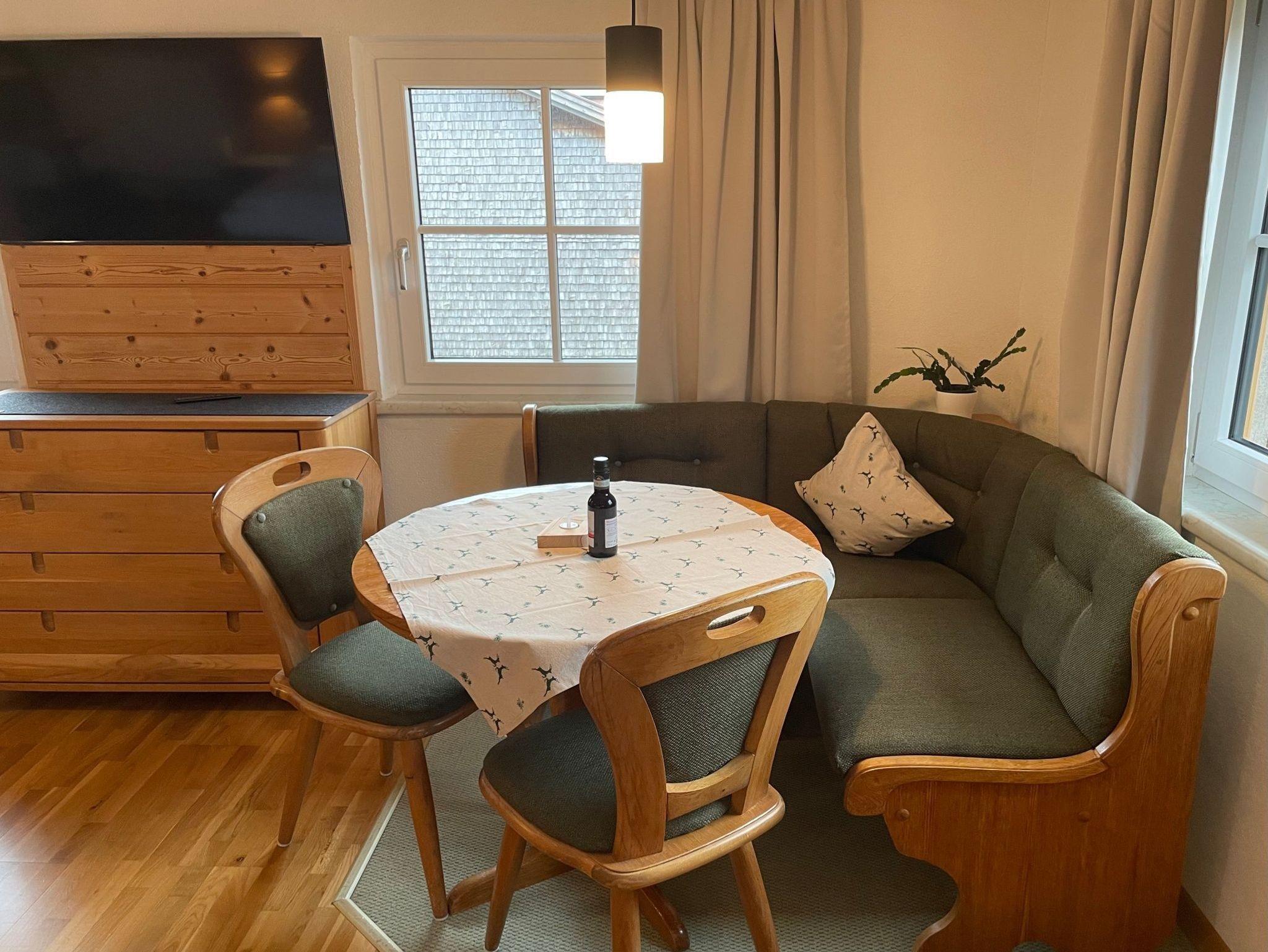 Unser großes Dreibettzimmer im 1. Stock, mit Blick auf das Wannenjoch, ist mit Dusche/WC, en Suite Waschbereich, Haartrockner, gemütlicher Sitzecke und SAT/Smart-TV ausgestattet. Frische Bettwäsche und Handtücher sind selbstverständlich vorhanden und werden nach Bedarf ausgetauscht.
