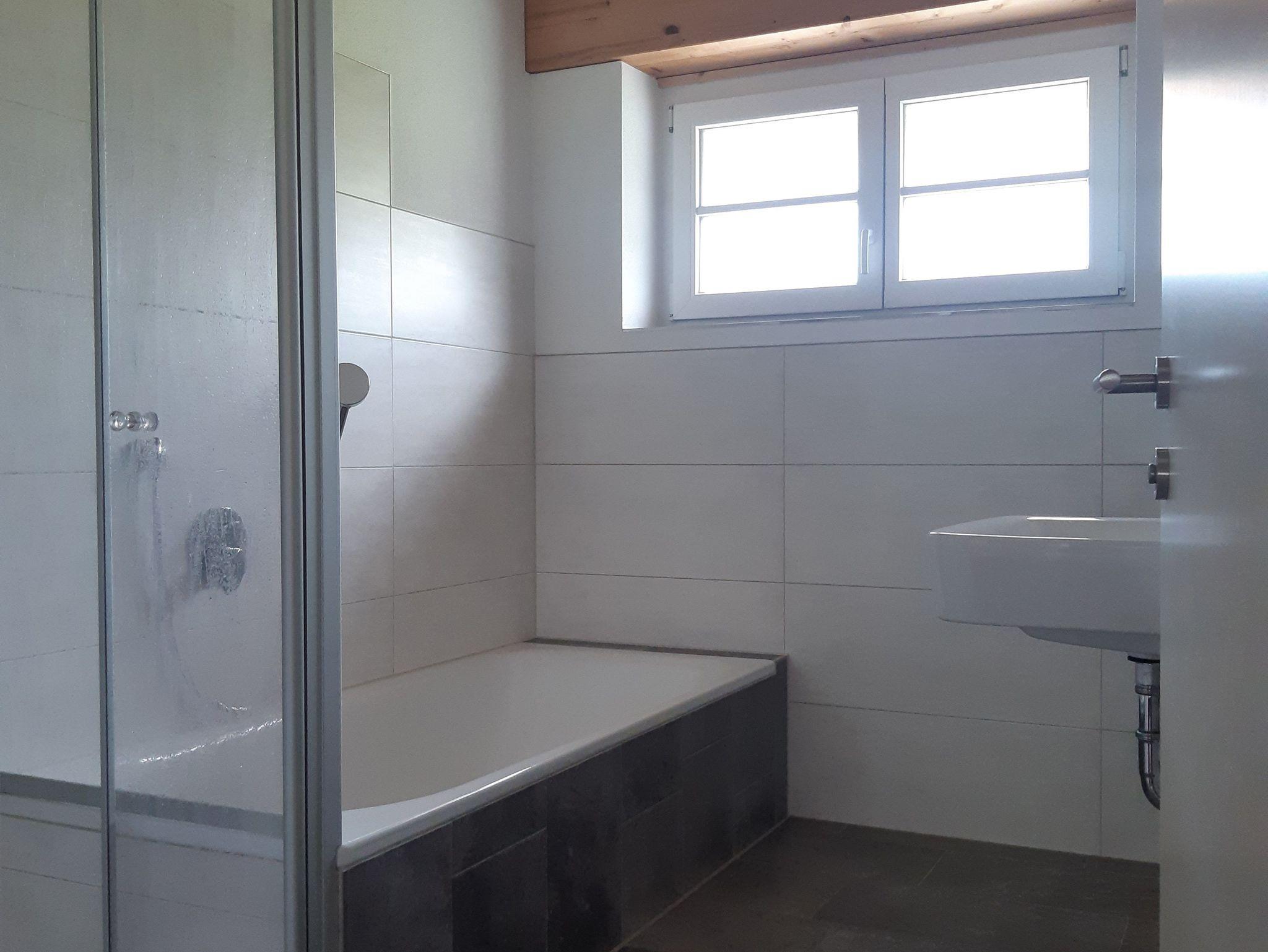 Bad mit Wanne, Dusche, Waschbecken und Fenster,