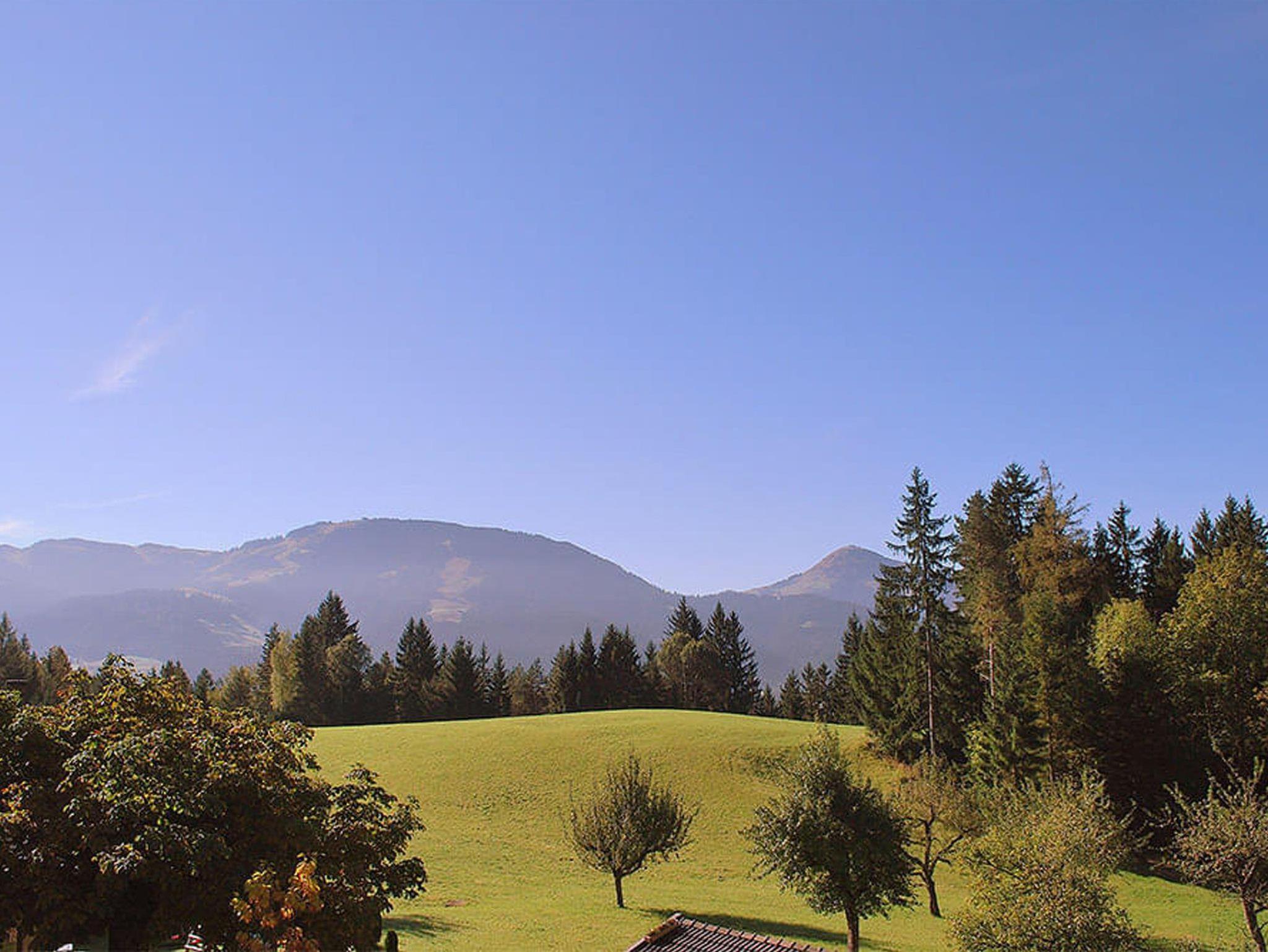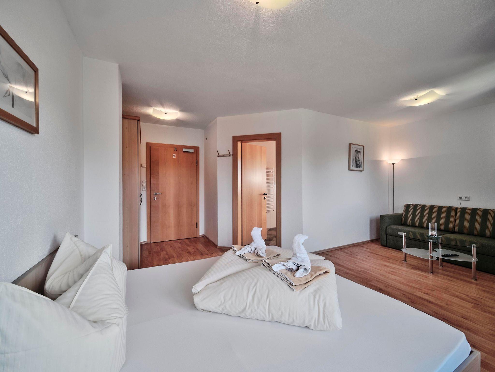 Studio mit Doppelbett, 1 Einzelbett und 1 Doppelcouch ca. 54 m², Bettwäsche, Sitzgruppe und Wohnlandschaft, Küchenzeile, Bettdecken & Polster für Allergiker, Flat-SAT-TV mit Radio, W-LAN, Laminatboden, Dusche/WC, Handtücher, Handtuchtrockner, Haartrockner, Toilettenartikel, Kosmetikspiegel, Bodenheizung, Safe. Für 2-5 Gäste geeignet. Bergpanorama Wilder Kaiser, Südseite mit Terrasse.