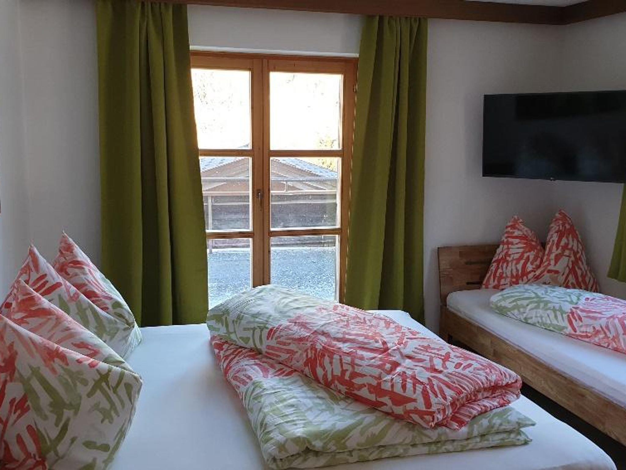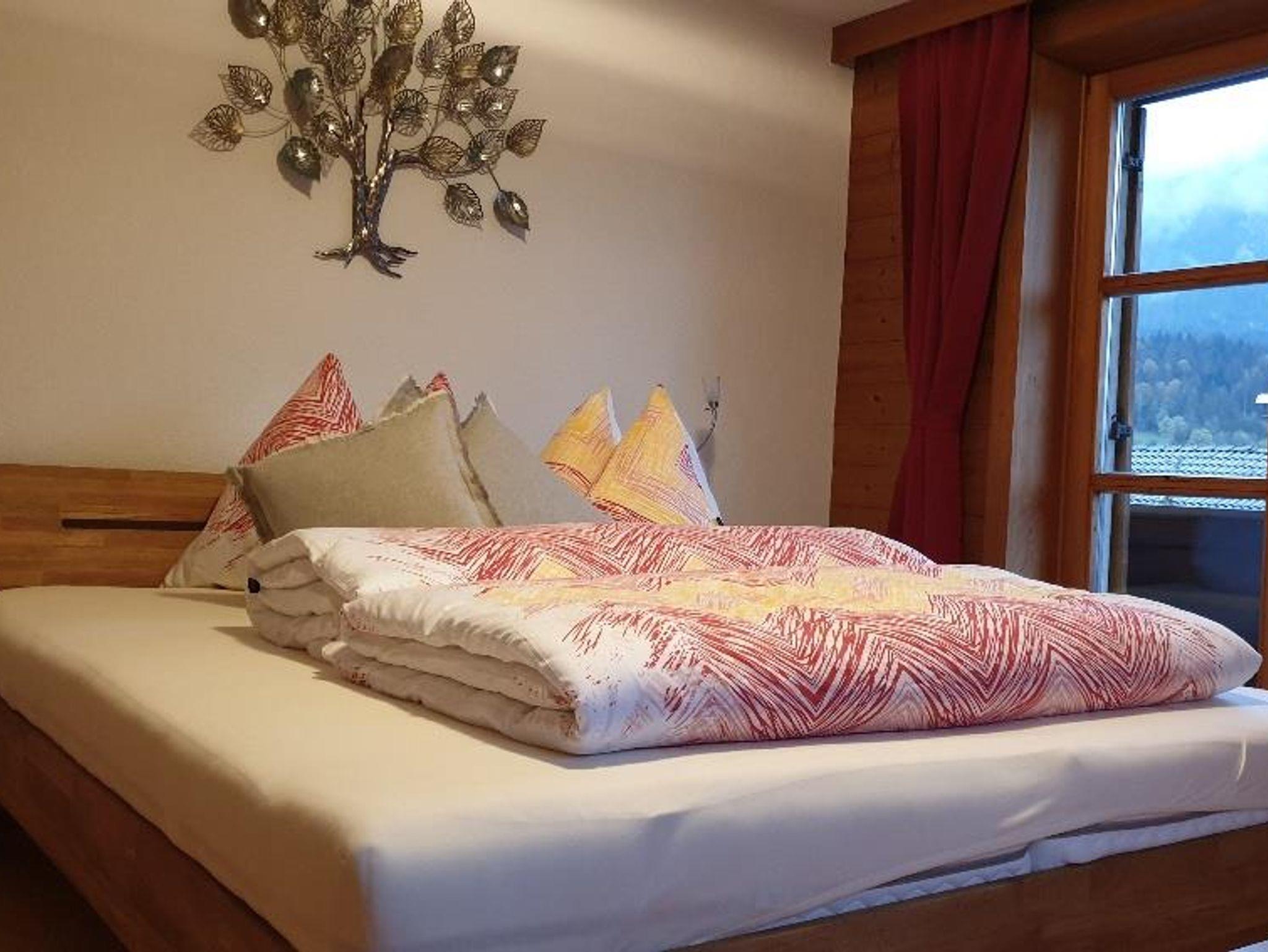 Unsere Ferienwohnung Wilder Kaiser verfügt über 60 m² mit zwei Schlafzimmern. Ein Schlafzimmer hat ein Doppelbett und ein Einzelbett. Das andere Schlafzimmer hat ein Doppelbett mit Waschbecken im Zimmer. Das Appartement hat ein Bad mit Dusche und ein separates WC. Die Wohnküche mit Eckbank und Couch zum Ausziehen ist voll ausgestattet. Auf dem Balkon kann man den Blick zum Wilden Kaiser genießen. Im Sommer gibt es auch noch einen extra Gartenplatz mit Blick zum Brandstadl. Beide Schalfzimmer und das Wphnzimmer verfügen über einen TV.