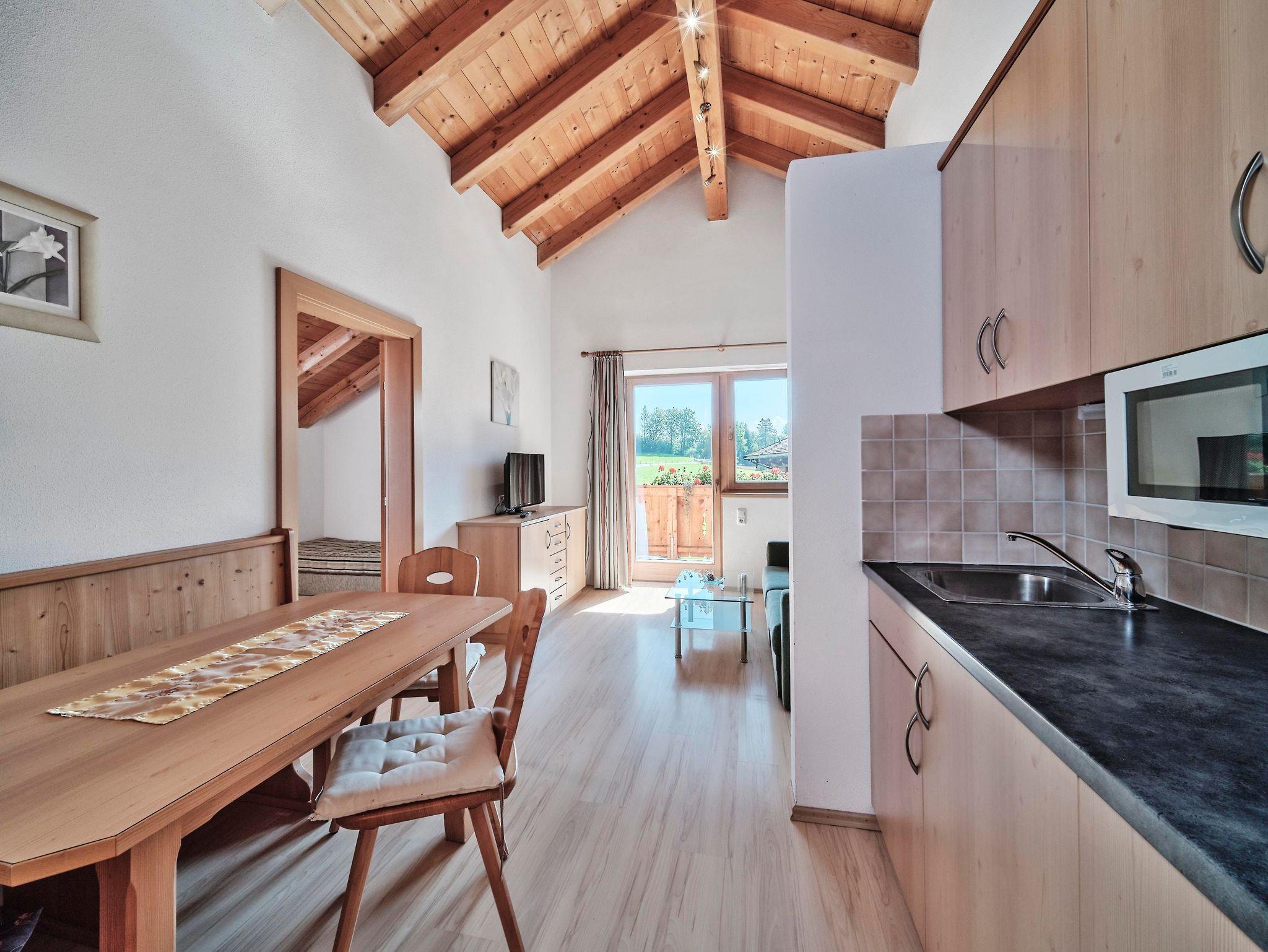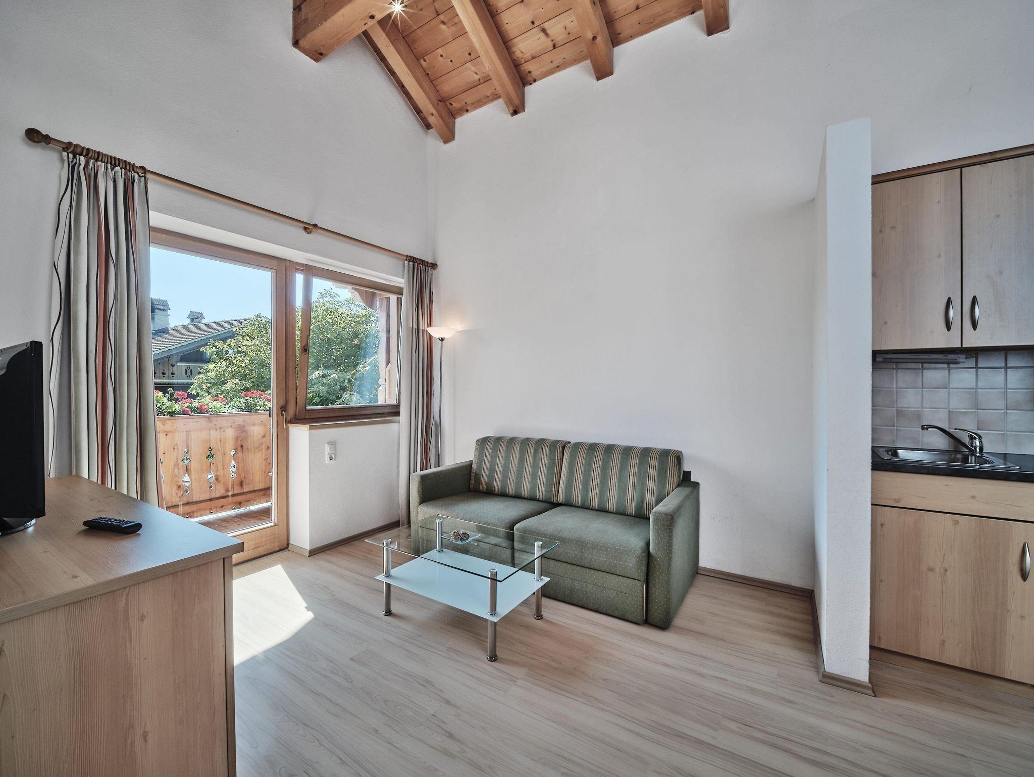 Studio mit Doppelbett, 1 Einzelbett und 1 Doppelcouch ca. 54 m², Bettwäsche, Sitzgruppe und Wohnlandschaft, Küchenzeile, Bettdecken & Polster für Allergiker, Flat-SAT-TV mit Radio, W-LAN, Laminatboden, Dusche/WC, Handtücher, Handtuchtrockner, Haartrockner, Toilettenartikel, Kosmetikspiegel, Bodenheizung, Safe. Für 2-5 Gäste geeignet. Bergpanorama Wilder Kaiser, Südseite mit Terrasse.