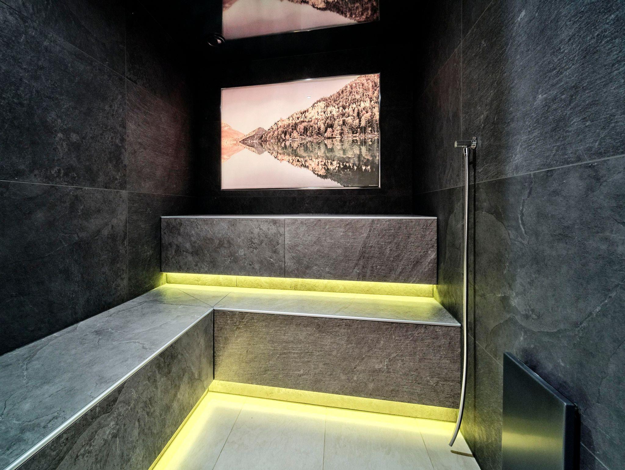 Saunalandschaft mit Almsauna, Kristalldampfbad, Infrarotlounge, Erlebnisduschen, Ruheraum und Tee-Eck (täglich von 15:00 Uhr - 18:30 Uhr).