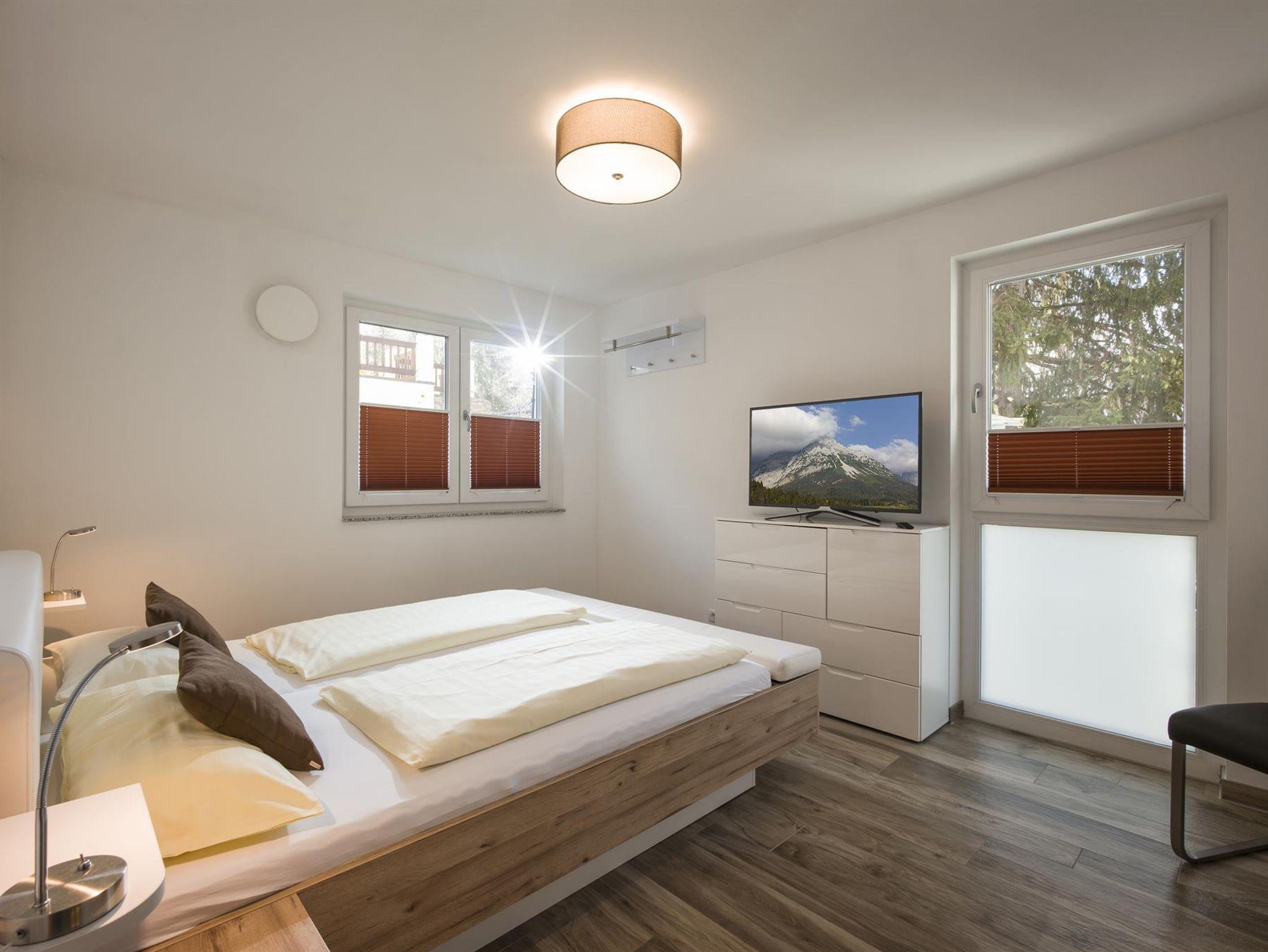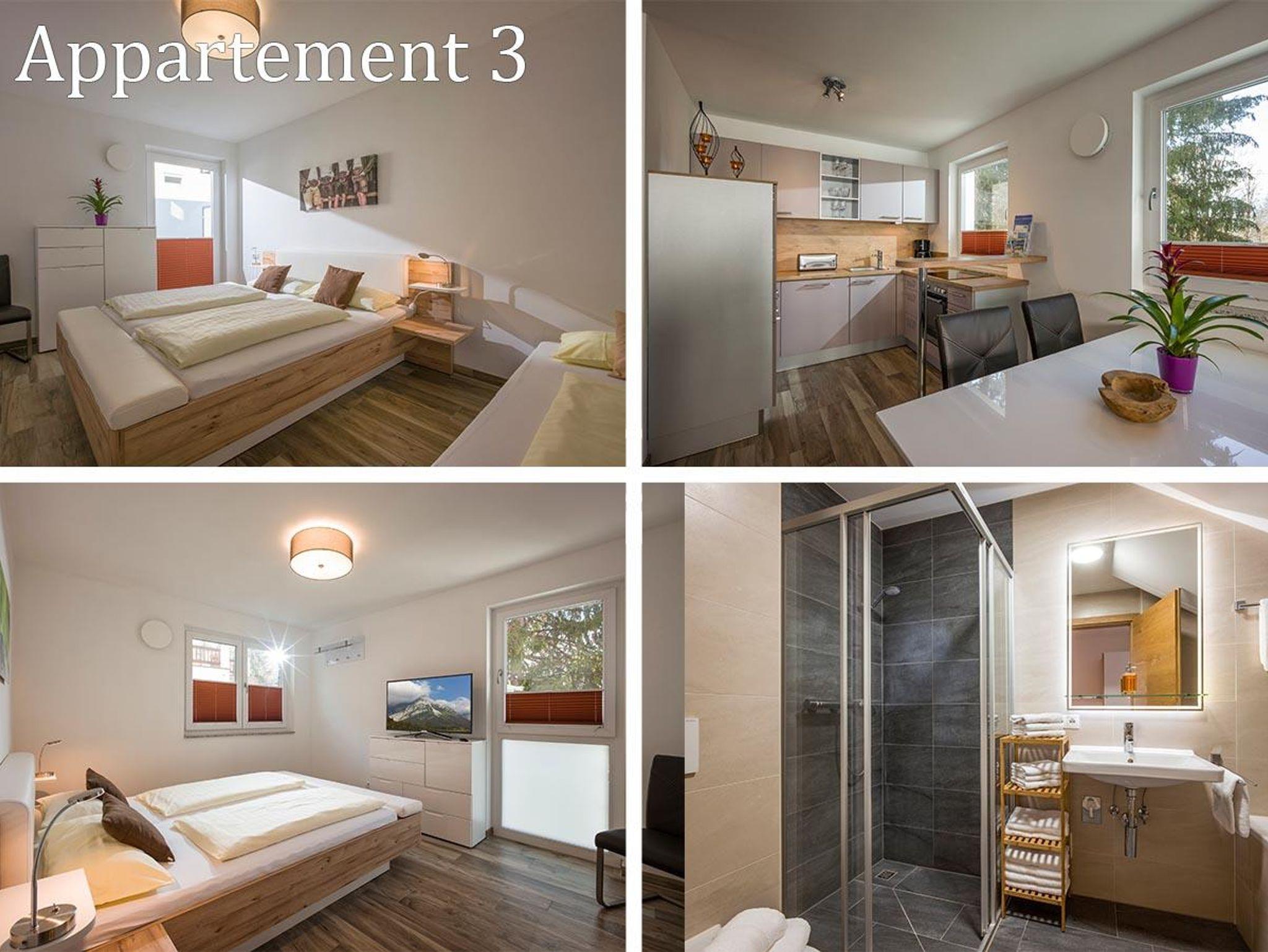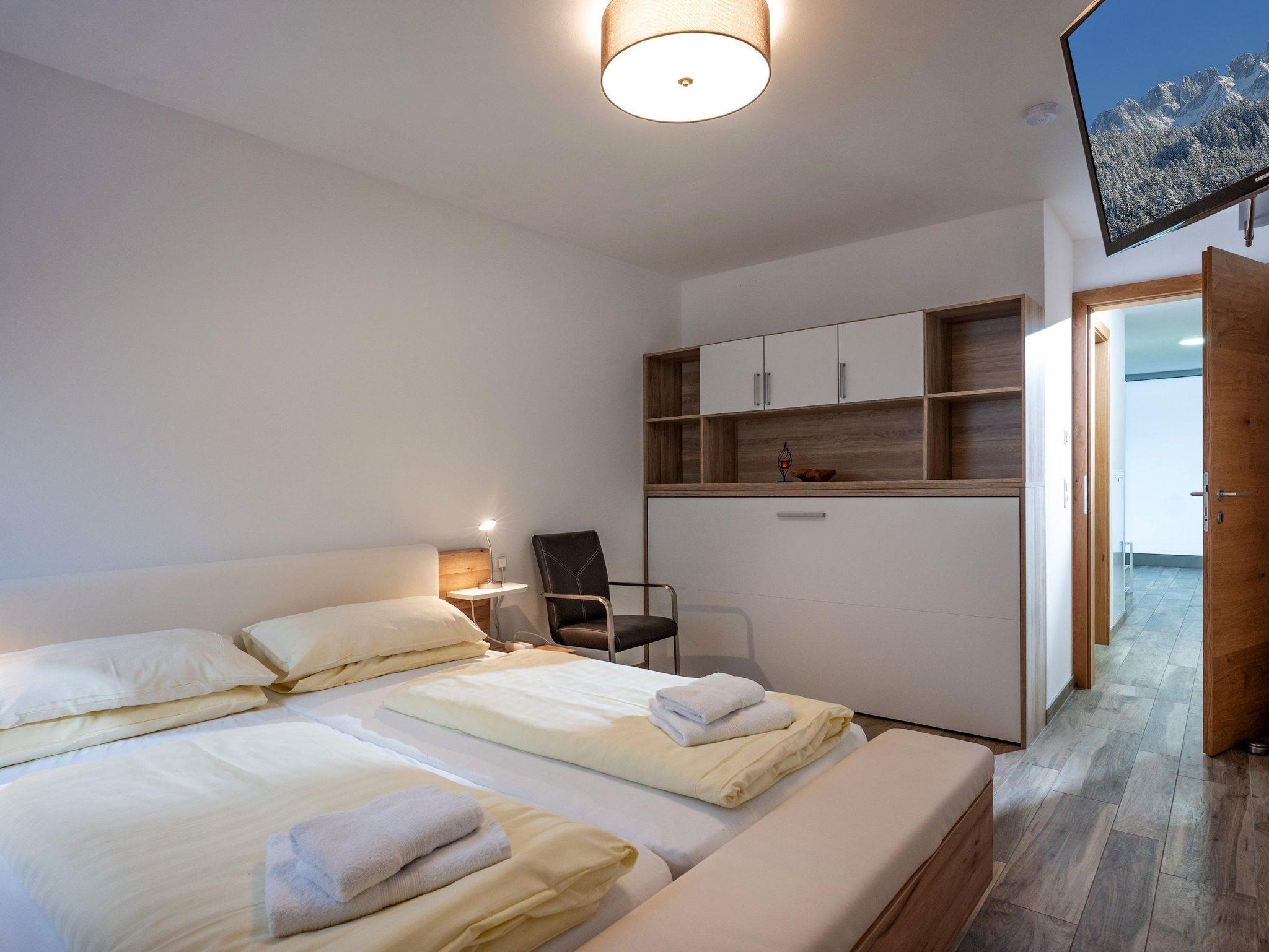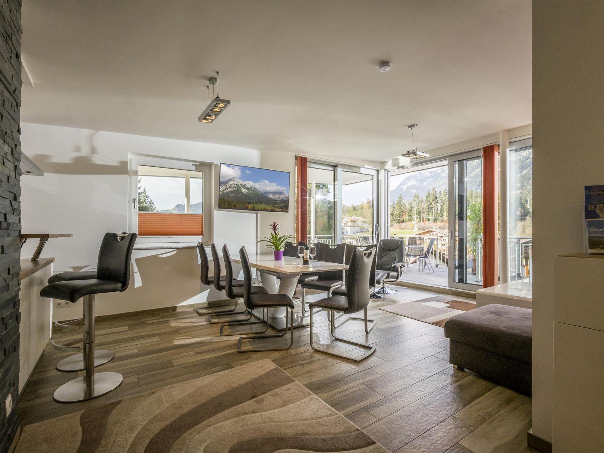 Moderne 3-Zimmer-Wohnung mit Balkon im Erdgeschoss für 2 bis maximal 8 Personen. Der große Wohnraum verfügt über eine moderne Einbauküche (u.a. mit Spülmaschine, Ess- und Kochgeschirr), Esstisch und eine hochwertige Schlafcouch (Liegefläche 170x200cm, mit Lattenrost). 2 Schlafzimmer mit je einem Doppelbett und nach Bedarf einem weiteren Einzelbett. Das Bad ist mit Badewanne, Dusche und WC ausgestattet. Balkon mit Blick zum Wilden Kaiser! 3 Satellitenfernseher und kostenloses W-LAN.