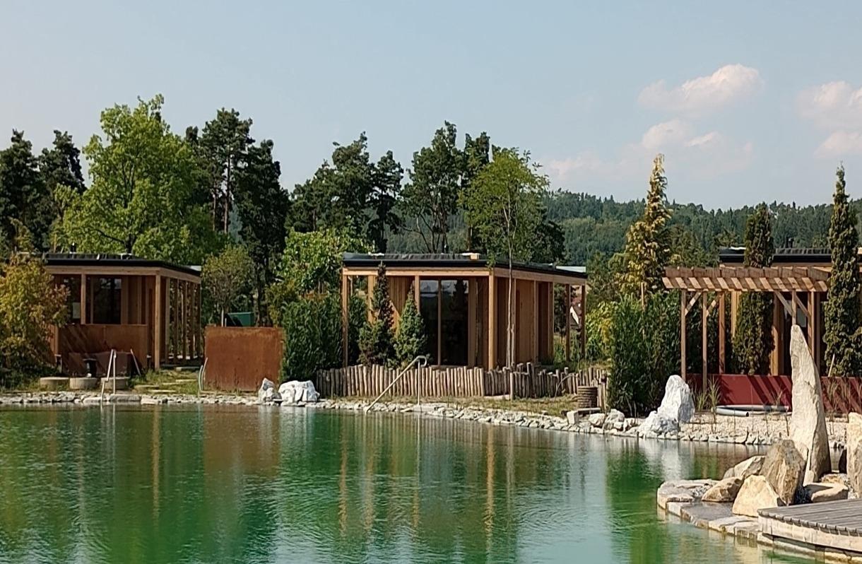 nachhaltige Holzriegelbauweise eingesetzt, welche ein besonders angenehmes Raumklima bietet. Das moderne Design des Hauses findet sich auch im Interieur wieder. Unsere Studios sind mit Klima-Anlage ausgestattet und verfügen über einen gemütlichen Wohnbereich mit 43 Zoll TV, ein Schlafzimmer mit Doppelbett, sowie ein Bad mit Regendusche und getrennter Toilette. In den Studios steht Ihnen eine Küche mit 2 flammigen Herd, Mikrowelle mit Heißluft und Grillfunktion, Kühlschrank samt Gefrierfach, Geschirrspüler, Kaffeemaschine, Wasserkocher, hochwertigem Geschirr, Weingläsern ausgestattet zur Verfügung. Von der Terrasse mit Tischgrill überblicken Sie den ganzen Gartensee und genießen Sie den Weitblick bis zum Ötscher. Der private Themengarten ist verträumt, romantisch und sehr harmonisch gestaltet, und bietet entweder eine Sauna oder eine Feuerwasserwanne unter freiem Himmel - genau das richtige um Zeit zu zweit zu genießen.