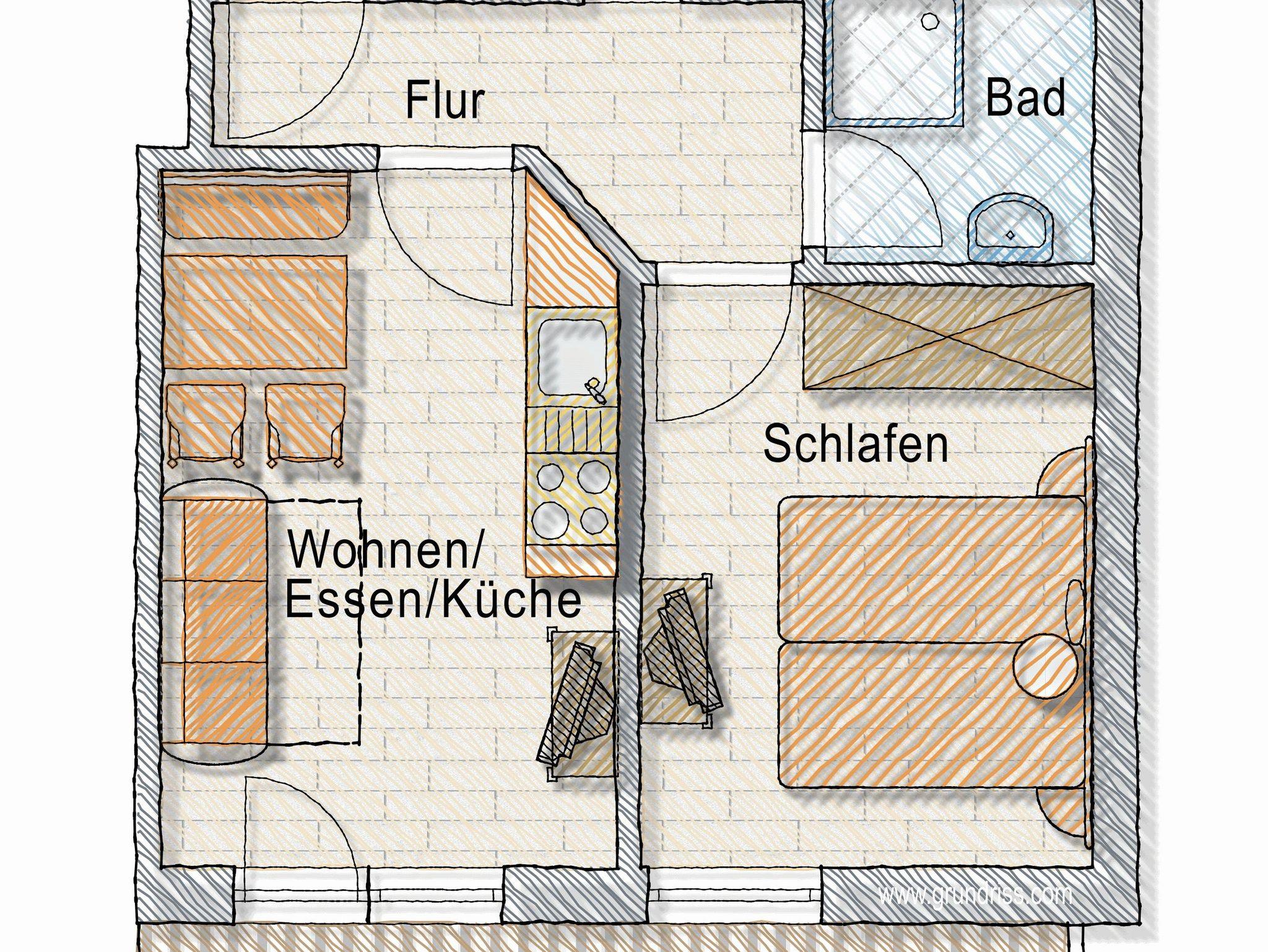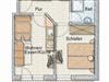 Appartement im Appartementhaus mit einem Doppelzimmer und einem Schlafsofa für zwei Personen in der Wohnküche. Der Balkon zeigt Richtung Dachsteinmassiv.