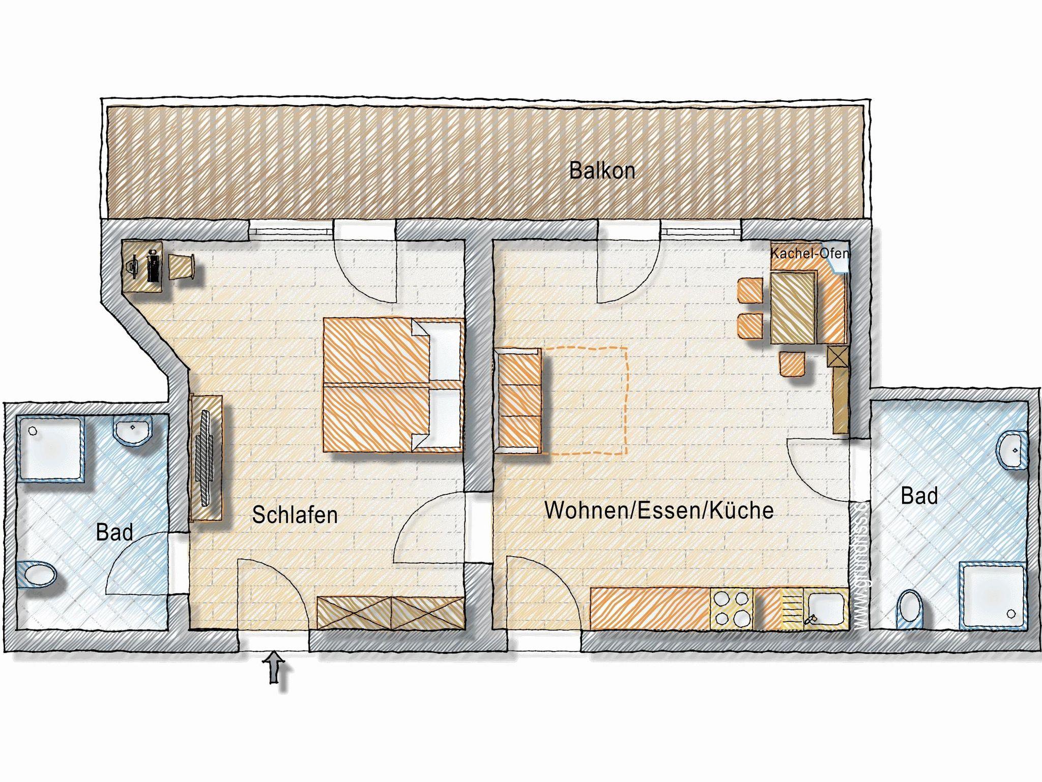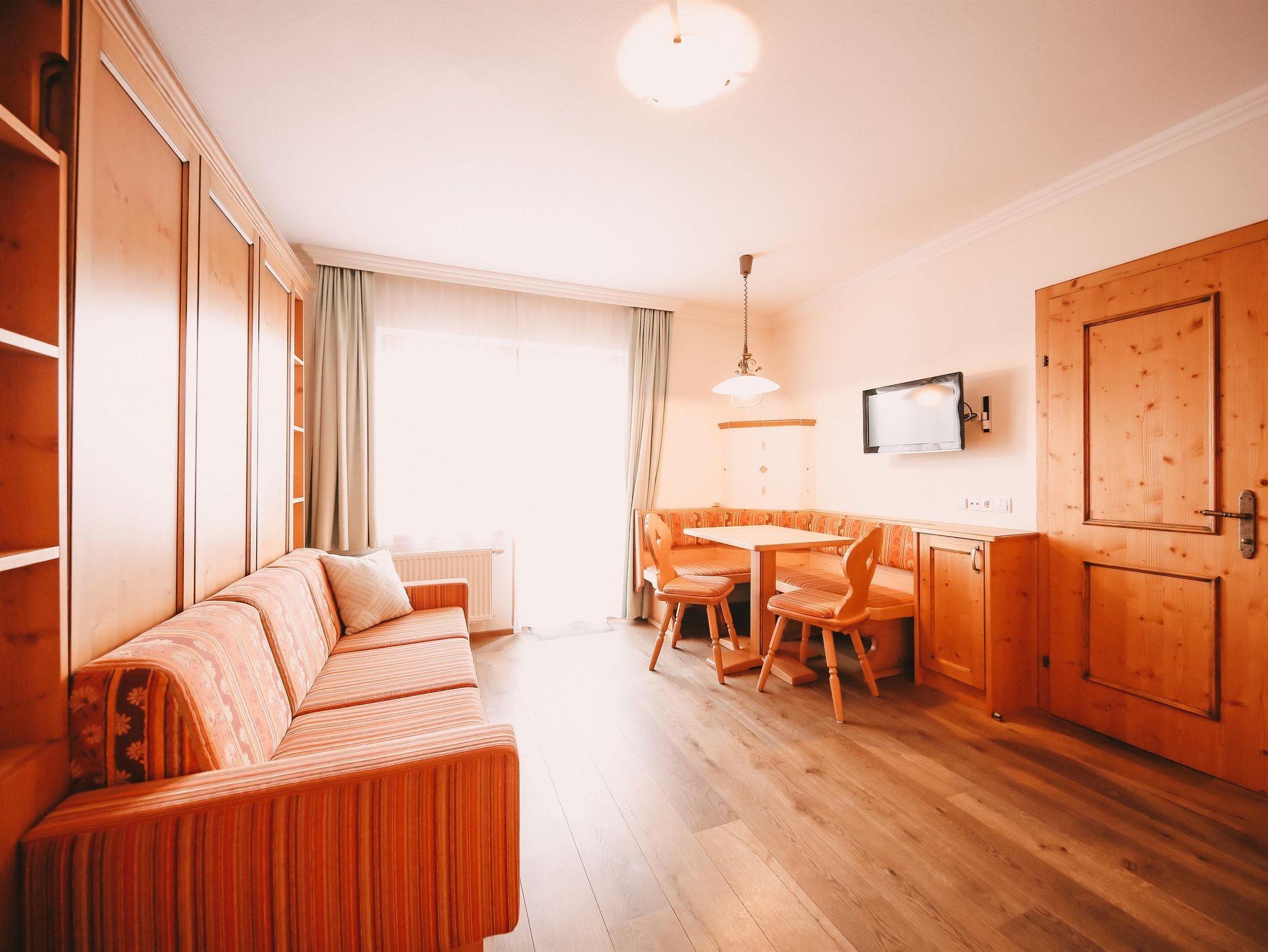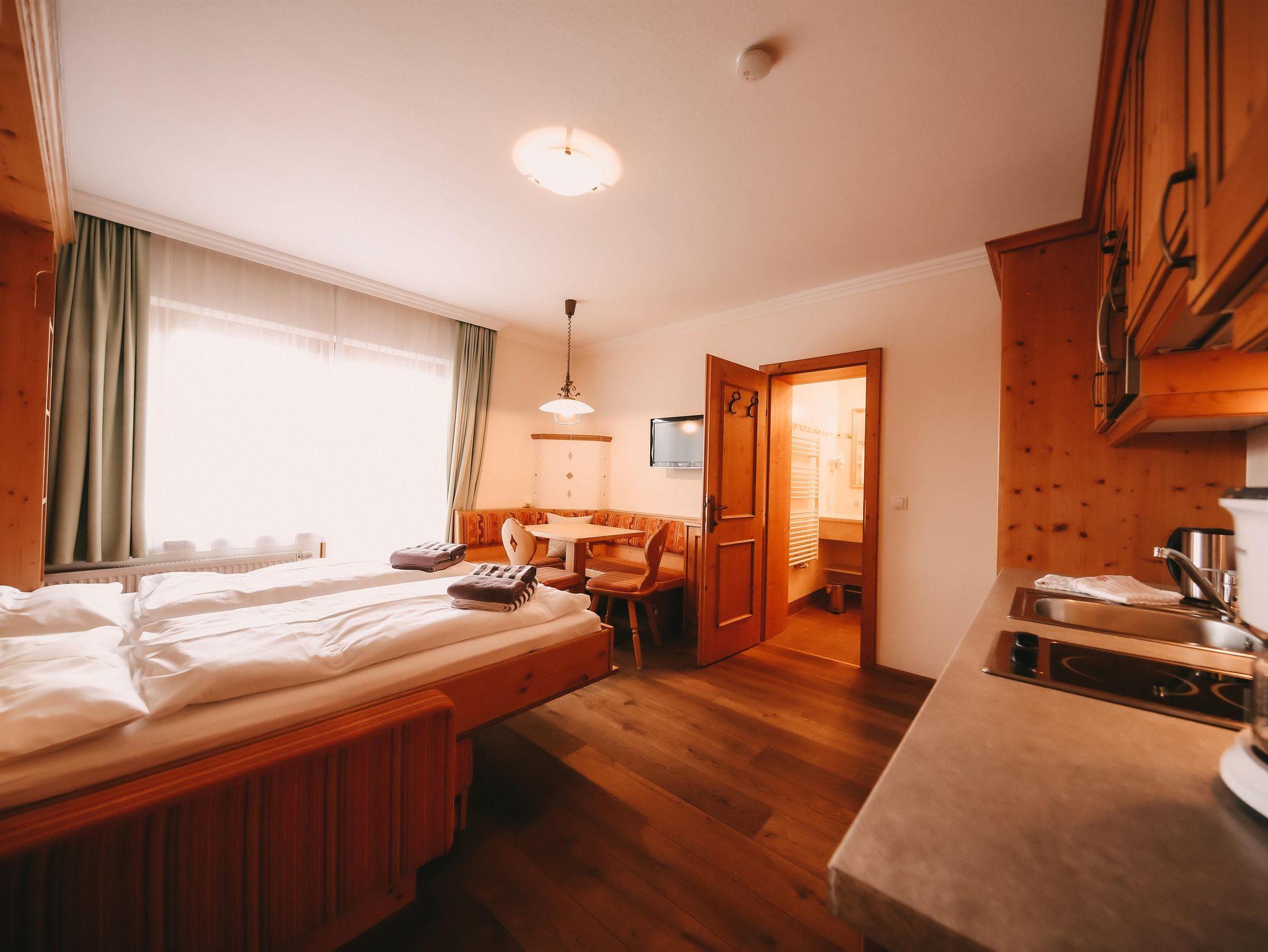 Appartement im Stammhaus mit einem Doppelzimmer und einem vollwertigem Klappbett für zwei Personen in der Wohnküche.