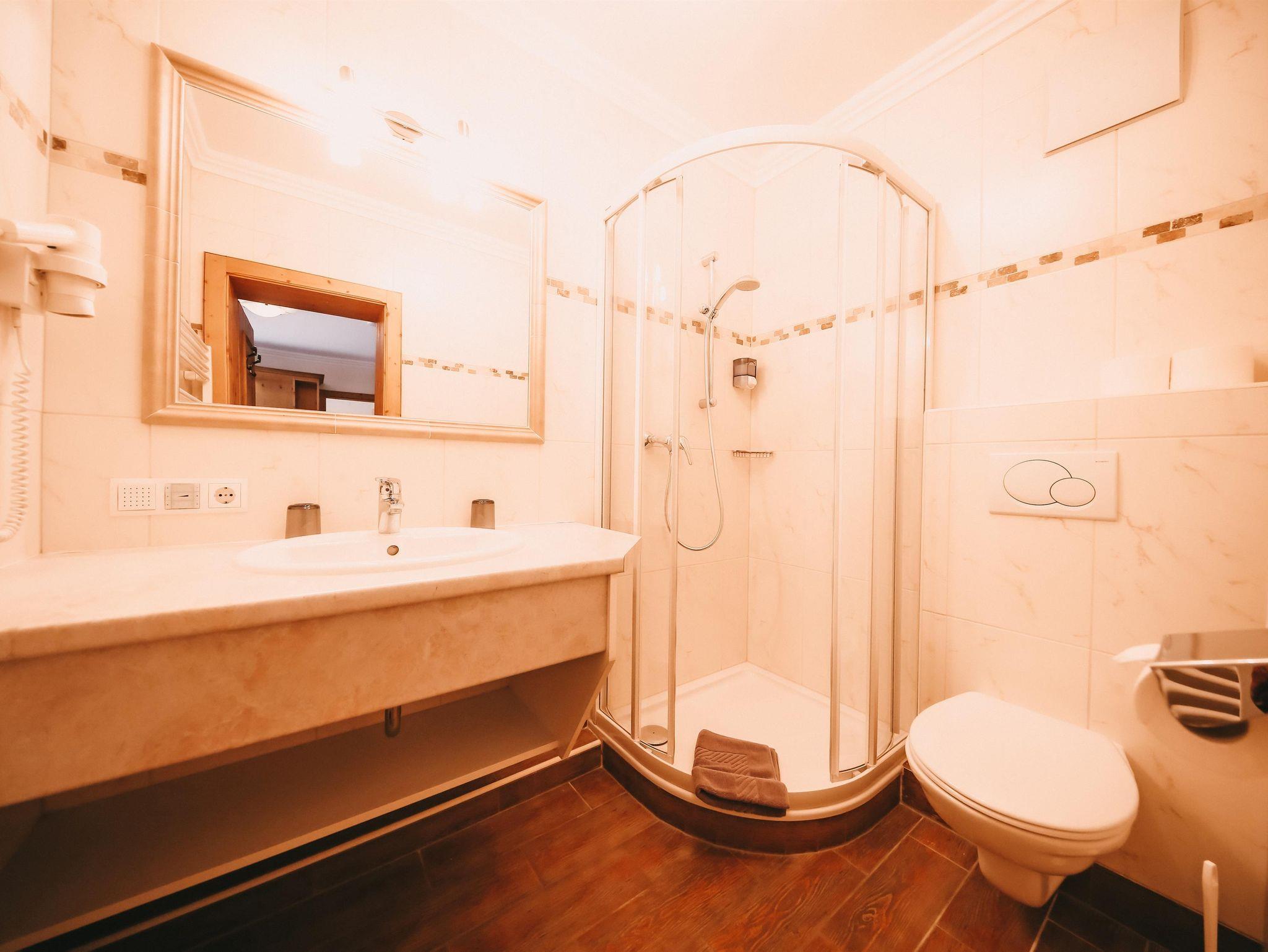 Zwei separate Badezimmer mit Dusche und WC. Ausblick vom Balkon nach Westen mit Dachstein Panorama.