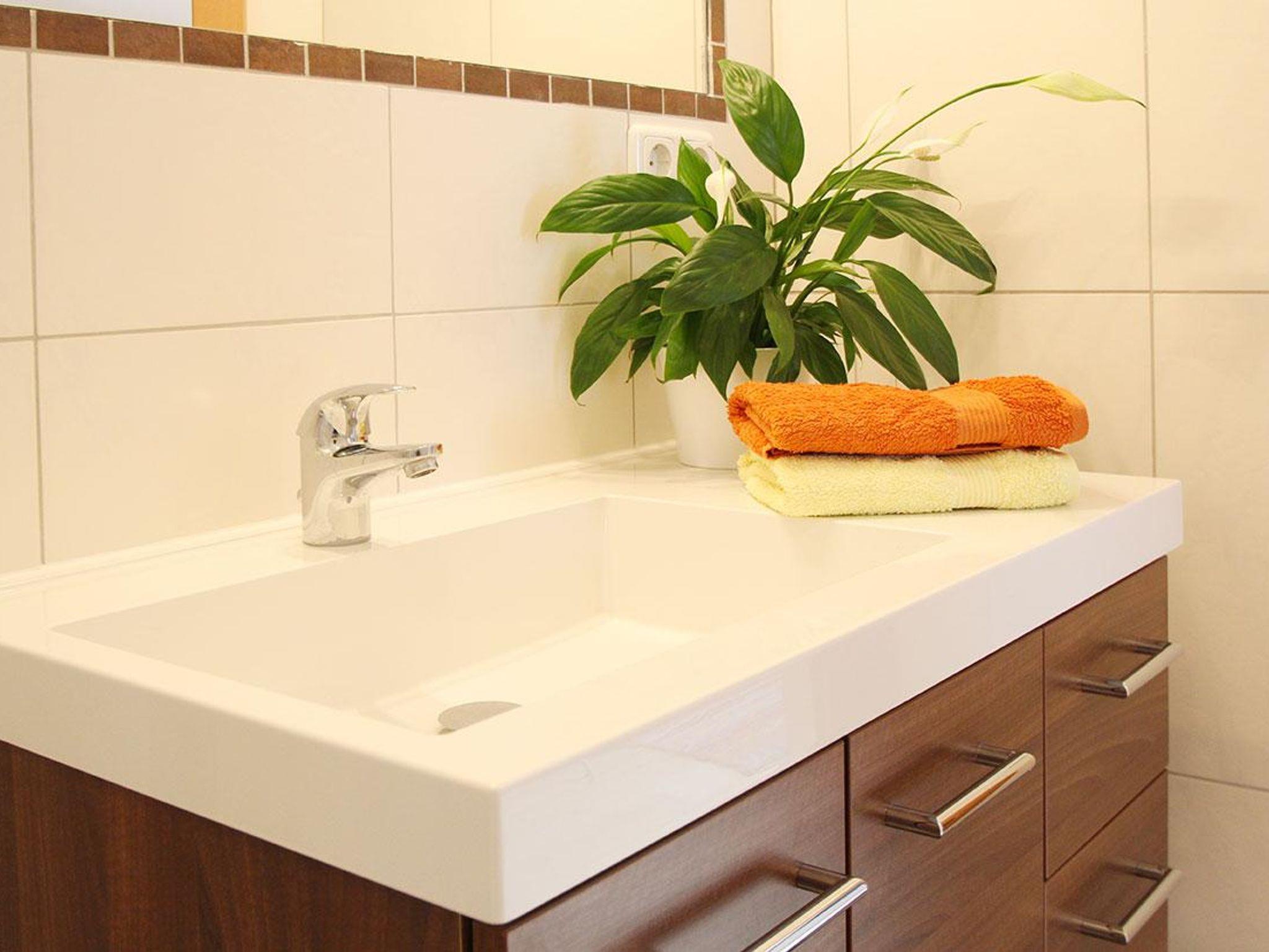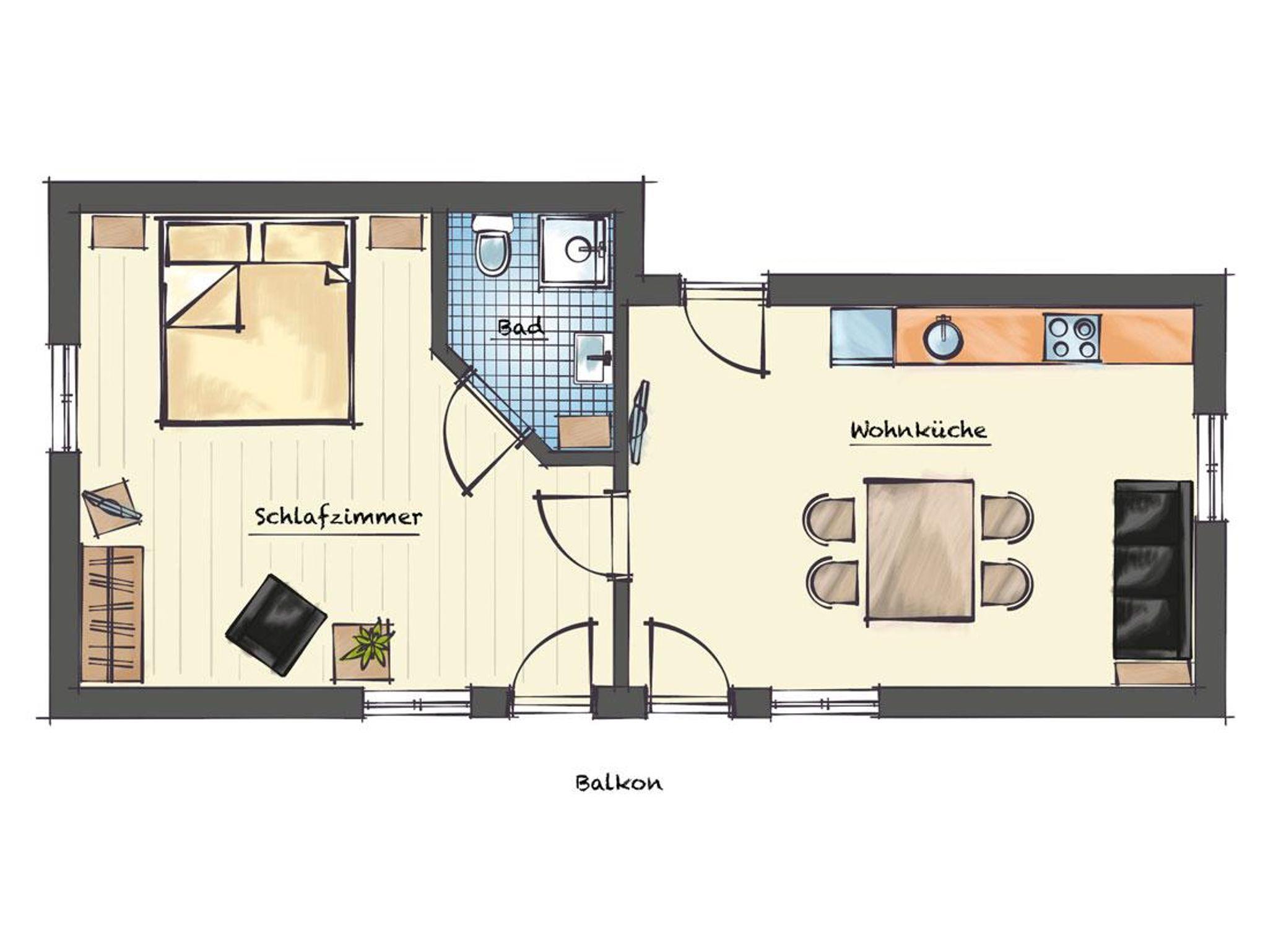 Schlafzimmer, Wohnküche mit großem Schlafsofa einem Badezimmer (Dusche und WC) / Ausstattung: LCD-Screen mit SAT, gratis Internet WLAN, komplett eingerichtete Küche mit Kühlschrank, E-Herd mit Backrohr, Mikrowelle, Geschirrspüler, Kaffeemaschine, Wasserkocher, Geschirr, Kochtöpfe, Handtücher, Bett- und Küchenwäsche. / Dieses Appartement befindet sich im Obergeschoß mit Balkon.