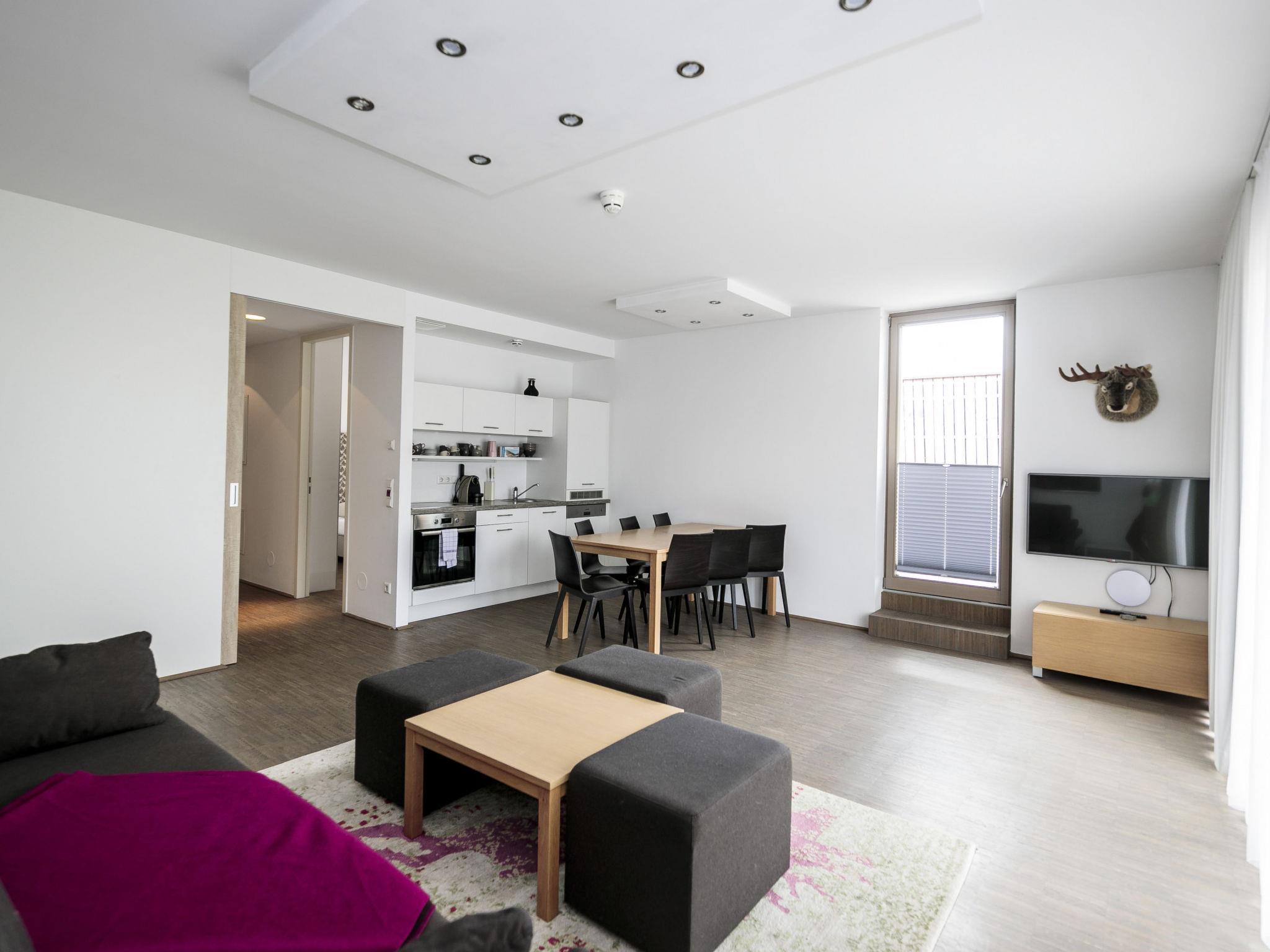 "mit 2 Schlafzimmern,Dachterrasse&Sauna", 3-room apartment 67 m2. Spacious and bright, modern furnishings: living/sleeping room with 1 double sofabed, dining nook and satellite TV (flat screen). 2 double bedrooms. Open kitchen (oven, dishwasher, 4 ceramic glass hob hotplates, toaster, kettle, electric coffee machine). Bath/WC, sep. WC. Terrace 30 m2. Very beautiful view of the mountains and the countryside. Facilities: Internet (WiFi, free). Please note: non-smokers only. The property is one of a type of property or apartment.