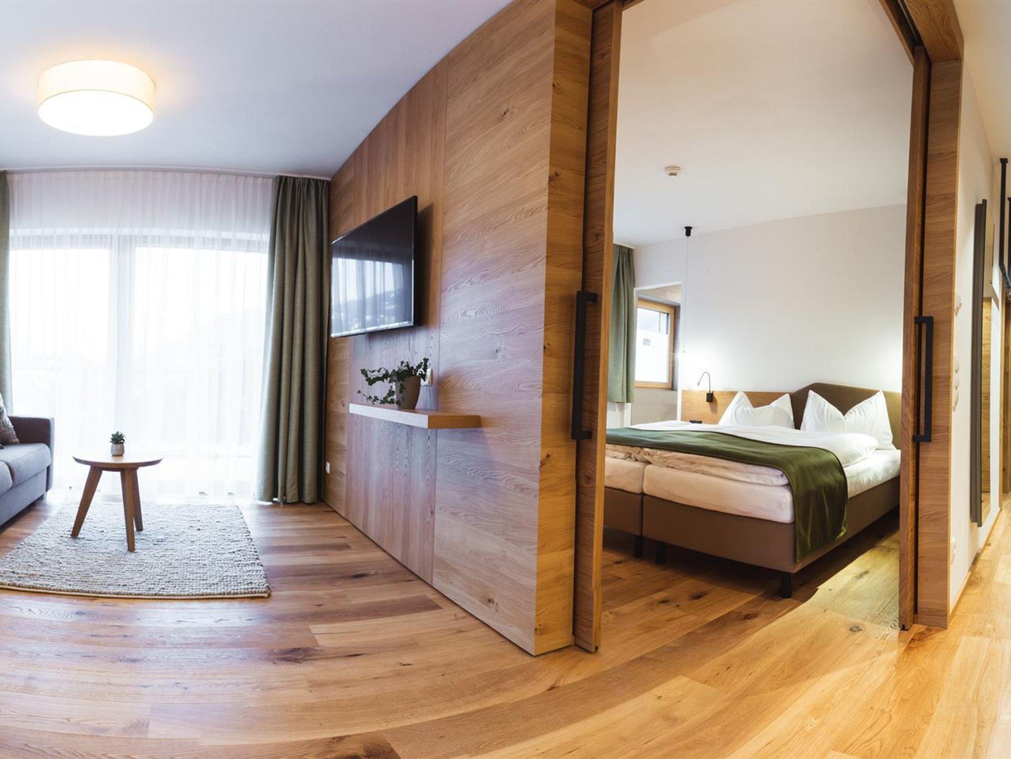 Perfekter Mix aus Holz, großzügigen Glasflächen und modernem Design. Unsere Apartments bieten auf 65m² Raum für bis zu 6 Personen – ideal für Familien oder eine gemeinsame Auszeit mit Freunden.