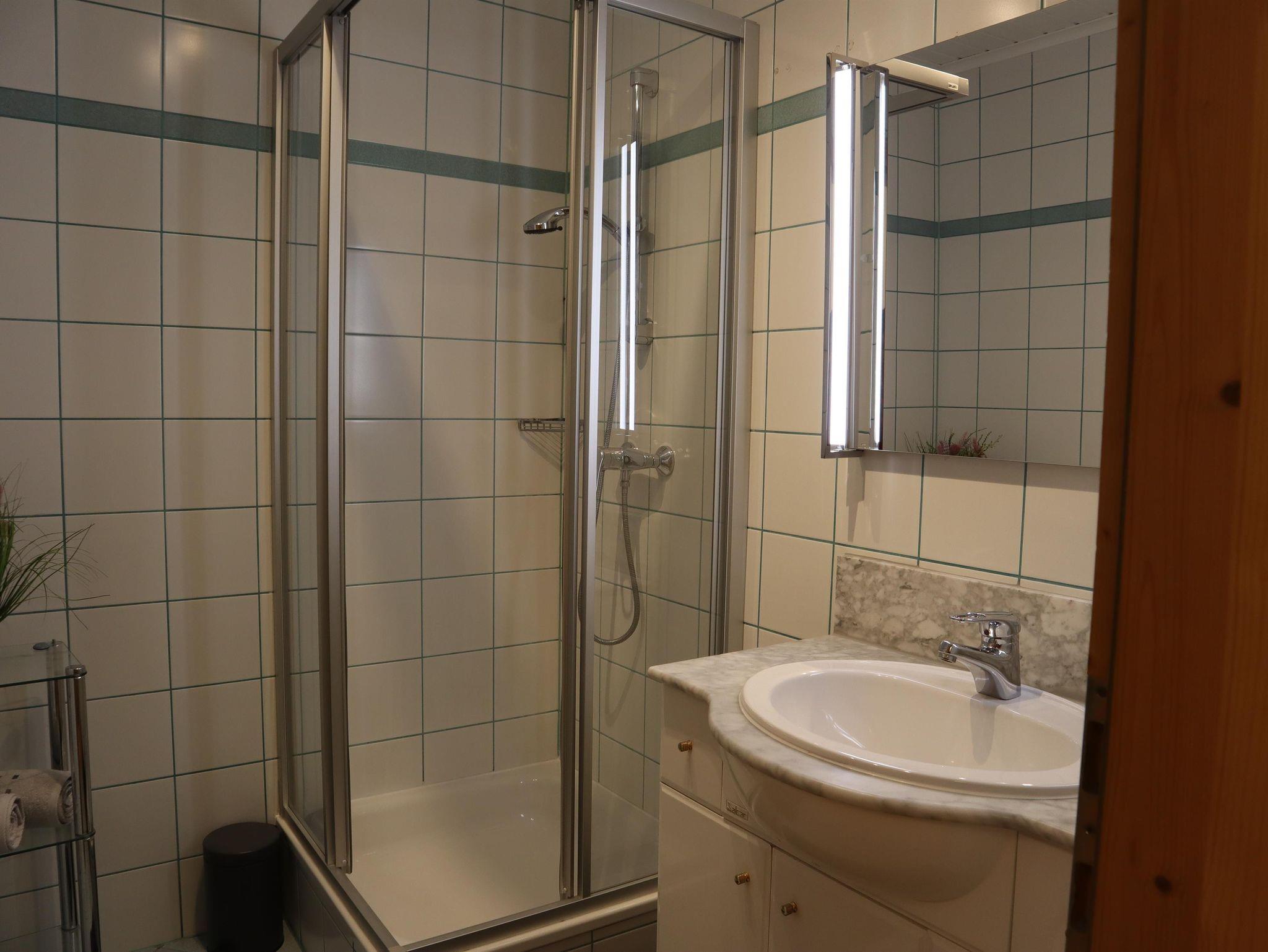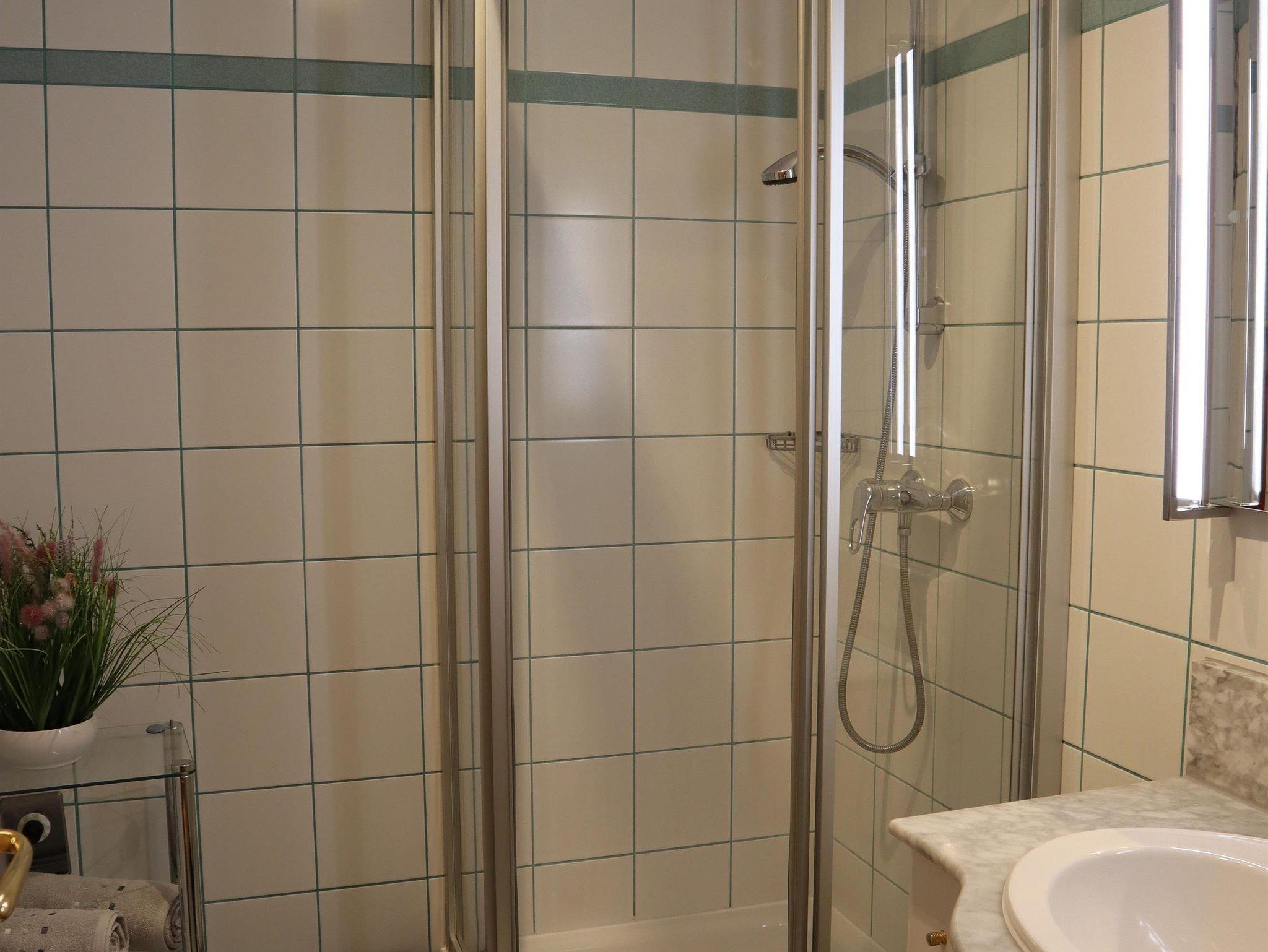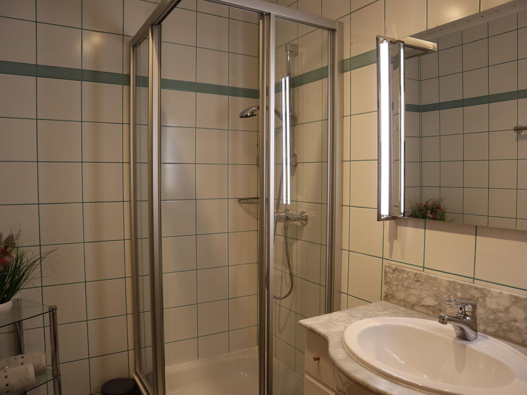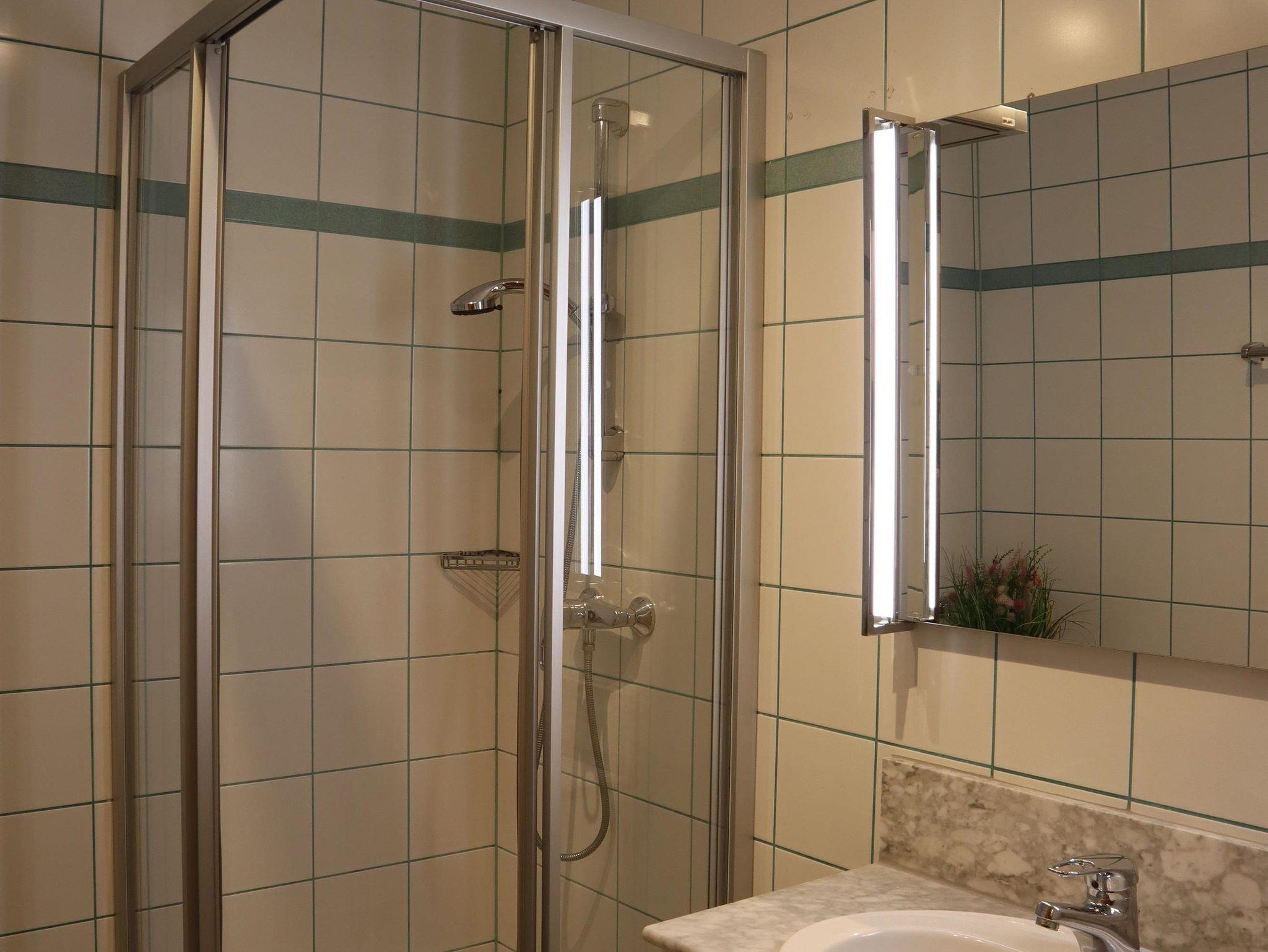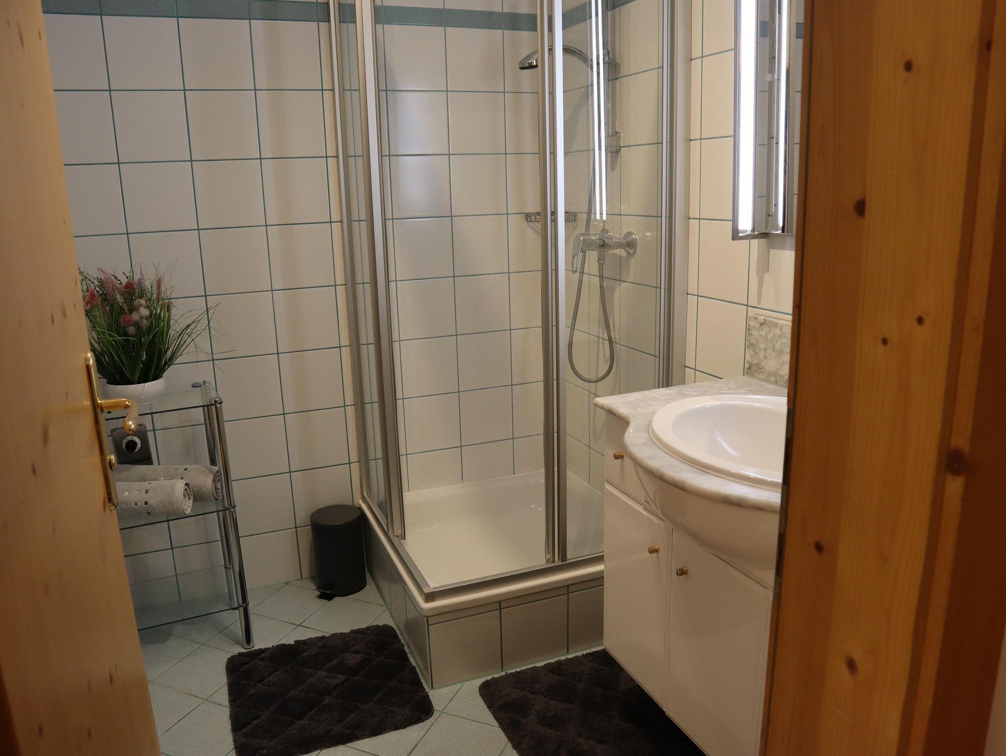 Außerdem gibt es einen Eckbank mit 2 Stühlen, eine ausziehbare Couch (max. 2 Personen) und einen Fernseher in der Wohnküche. Die Wohneinheit bietet auch einen Zugang zum Balkon mit Blick auf die Planai. Das Appartement hat auch 1 Badezimmer mit Dusche, wo auch ein Haarföhn zur Verfügung steht und ein WC.