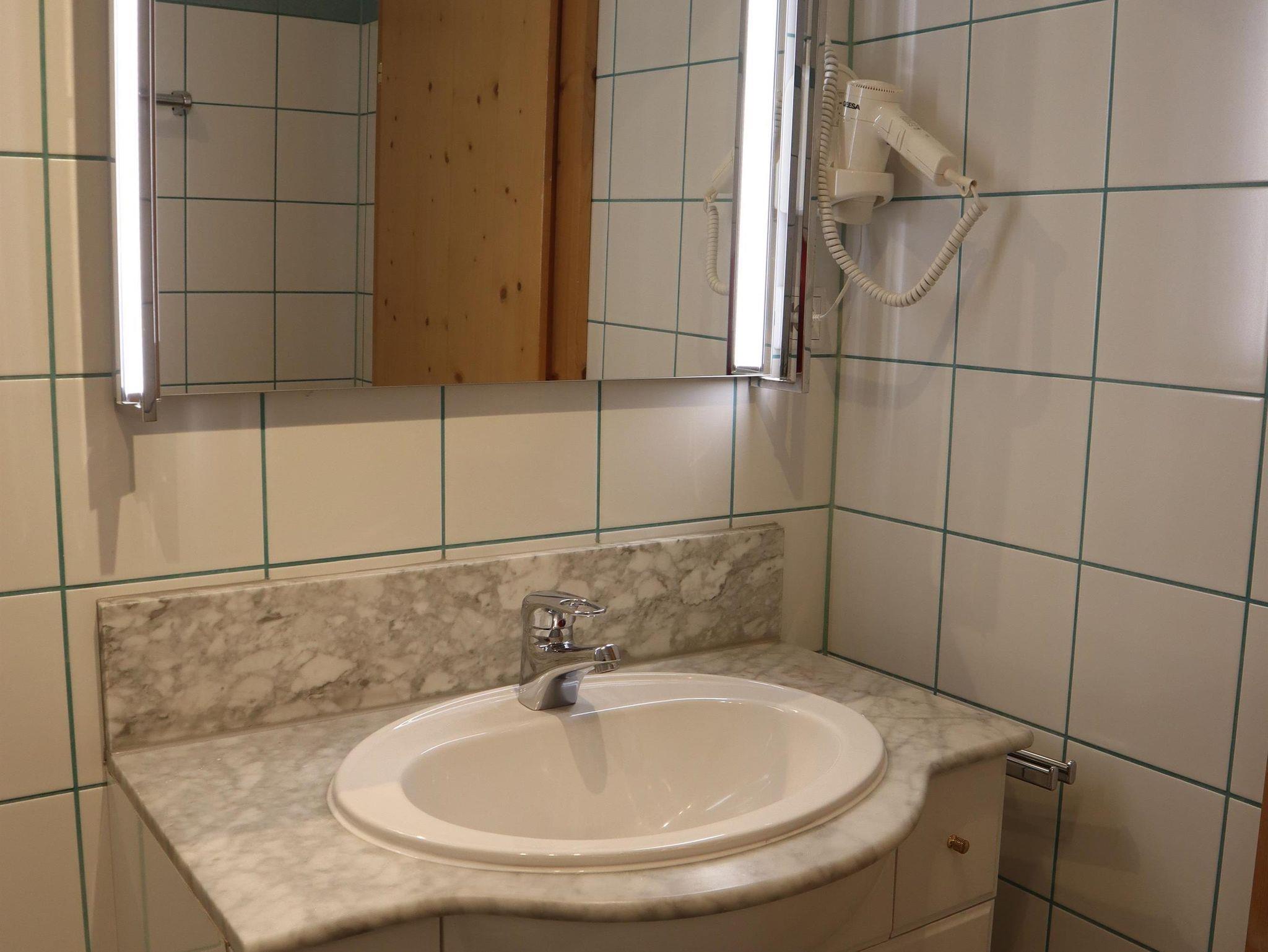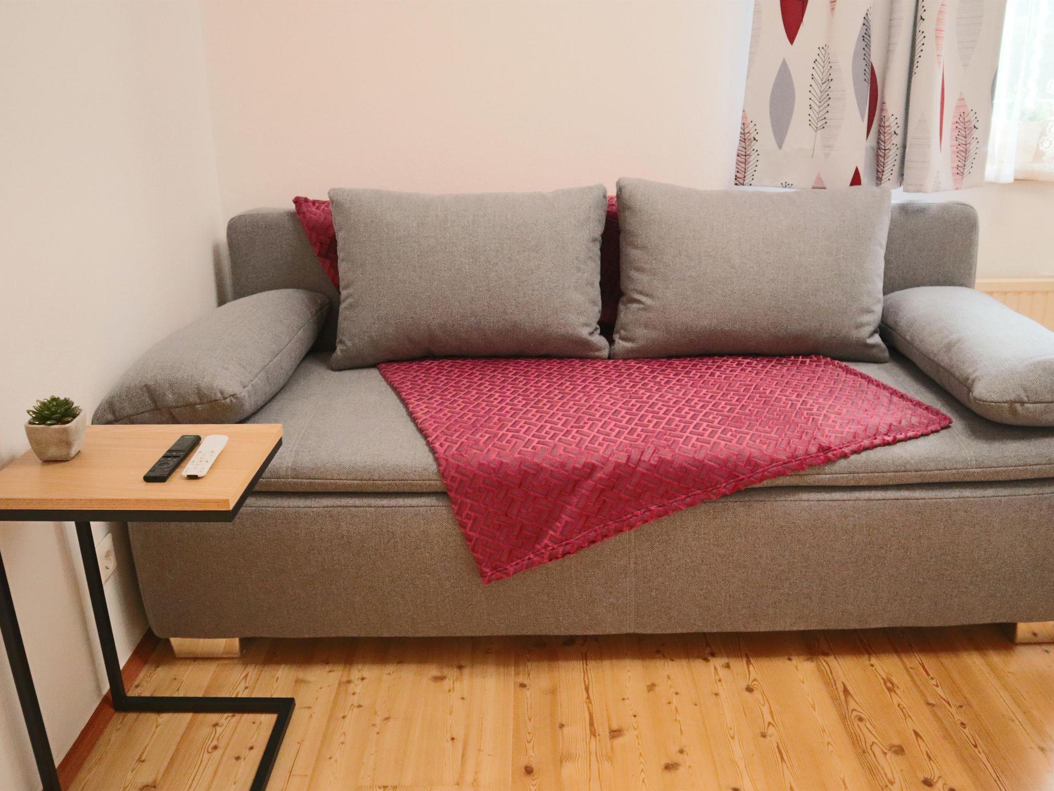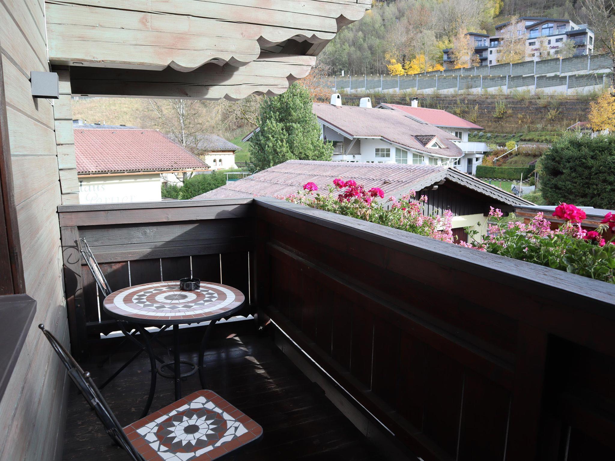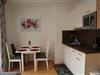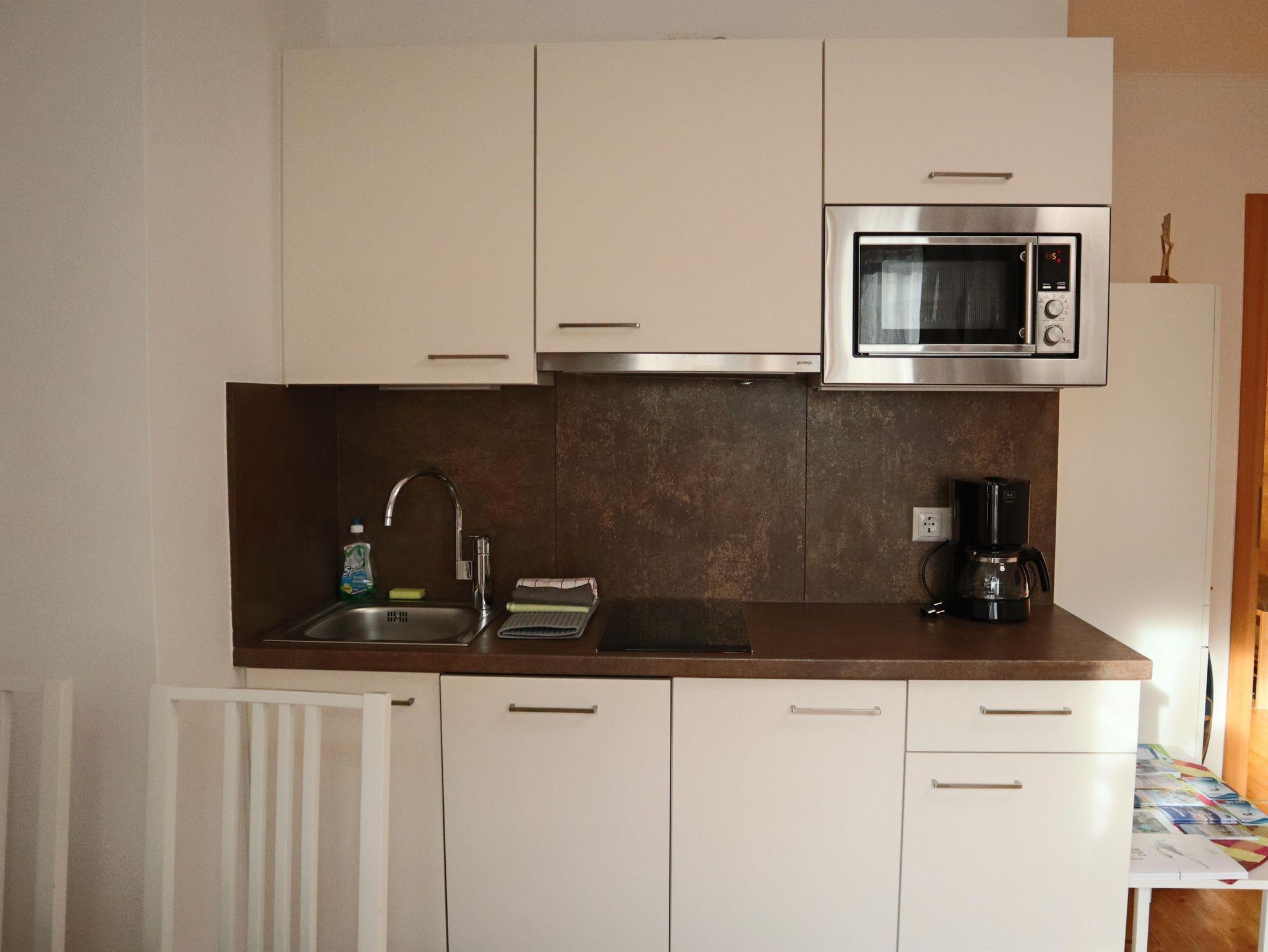 Außerdem gibt es einen Eckbank mit 2 Stühlen, eine ausziehbare Couch (max. 2 Personen) und einen Fernseher in der Wohnküche. Die Wohneinheit bietet auch einen Zugang zum Balkon mit Blick auf die Planai. Das Appartement hat auch 1 Badezimmer mit Dusche, wo auch ein Haarföhn zur Verfügung steht und ein WC.
