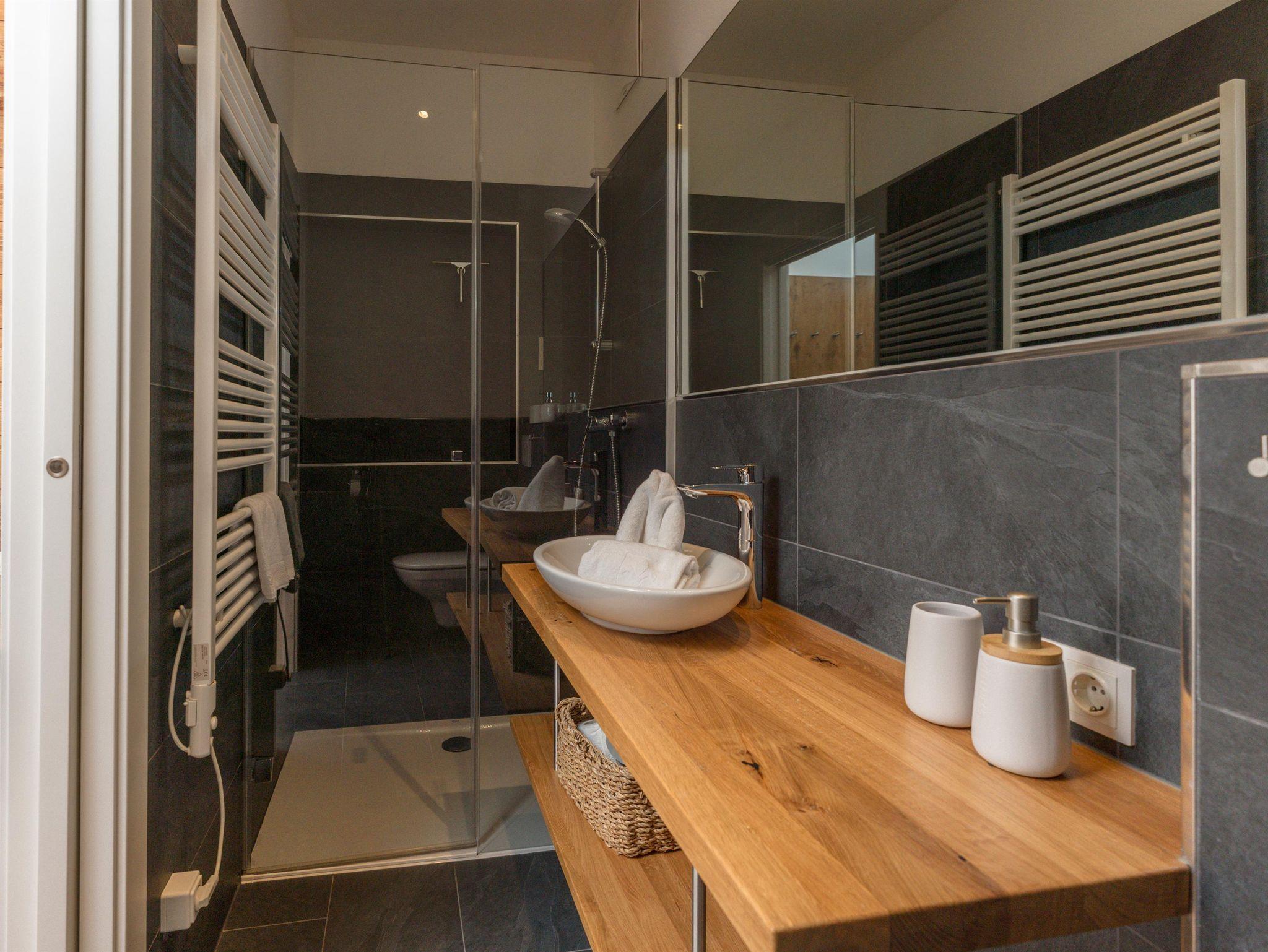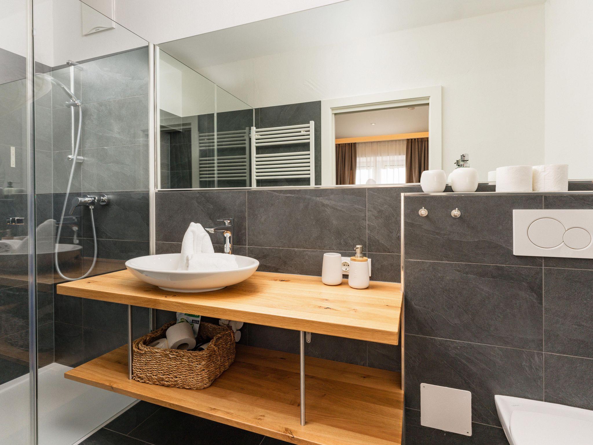- 1 Badezimmer mit Dusche, Doppelwaschtisch sowie Toilette