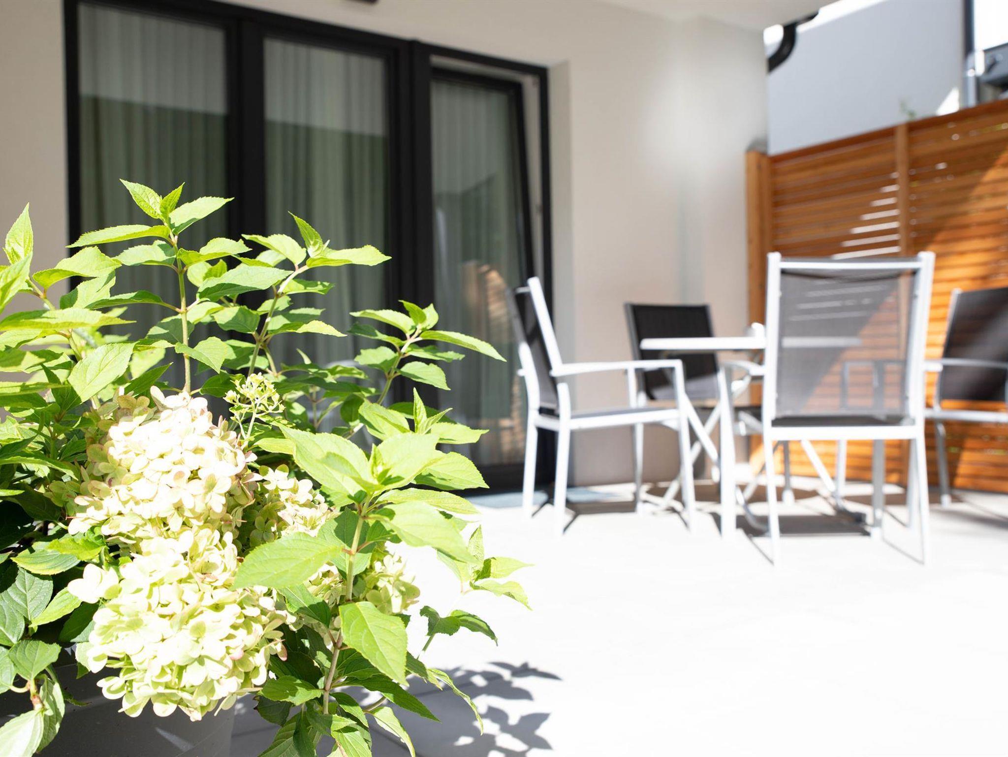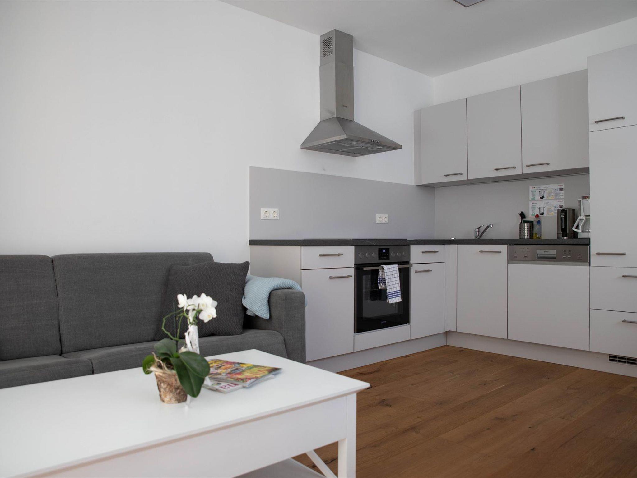 Zeitgemäßes Design, helle Farben, ein Holzboden und eine moderne Ausstattung mit allem was das Herz begehrt machen die Appartements Freiraum zum gemütlichen Refugium mit eigener Terrasse.