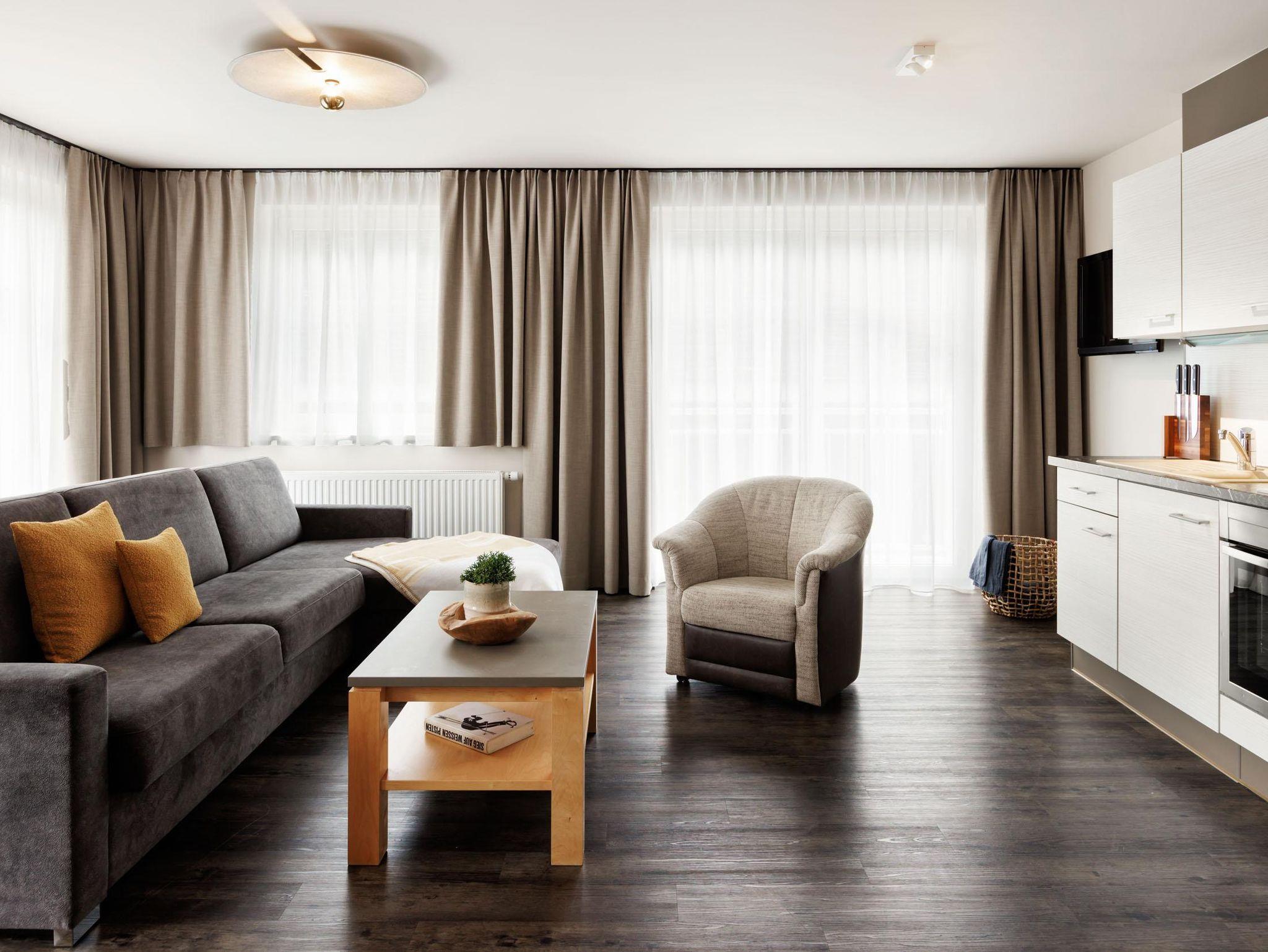 Die Appartements für zwei bis sechs Personen bieten 55 bis 100?m² Wohnfläche mit ein bis zwei Schlafzimmern, geräumigem Wohnbereich mit Schlafsofa (Matratzenfunktion, Größe 170x200), Bad (stets separates WC), WLAN, teils Balkon oder Terrasse und vollausgestatteter Küche. Jede Einheit verfügt außerdem über eine moderne Infrarotkabine. Unser Haus bietet zudem einen Lift.