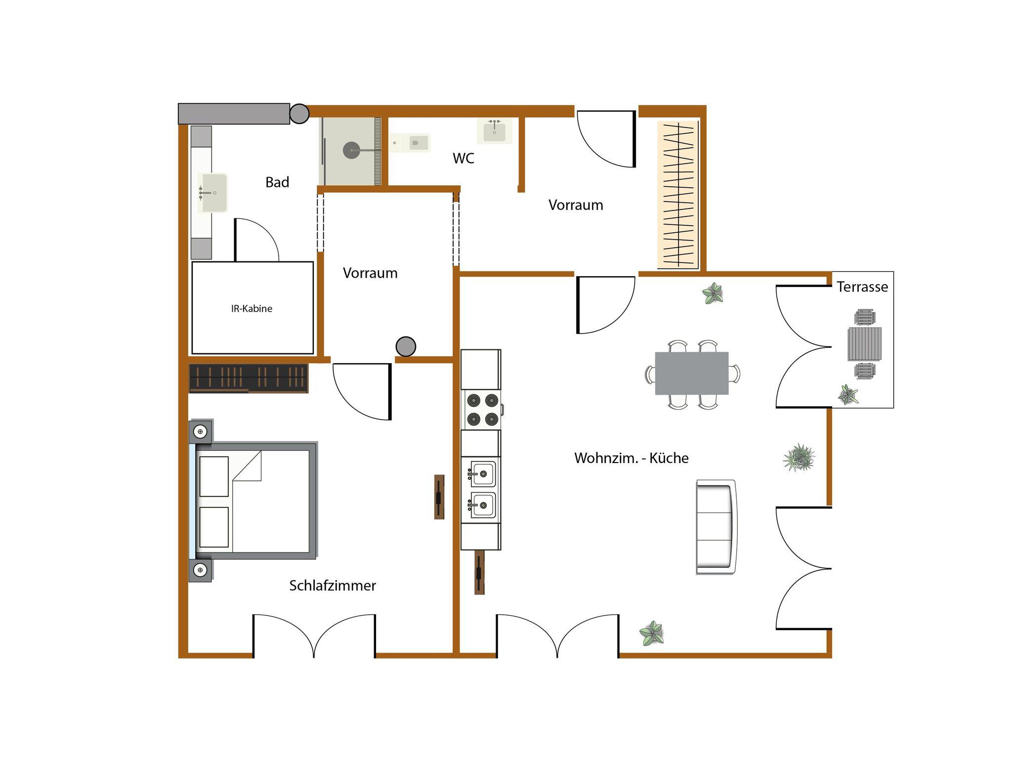 Unsere Ferienwohnung besteht aus, 1 Schlafraum mit 2 Betten, welche sowohl als Doppelbett, wie auch als 2 Einzelbetten verwendet werden können. Im Wohnraum befindet sich ein ausziehbares Sofa (Größe 170 x 200 cm). Wohnraum wie auch Schlafraum sind mit einem Flat TV ausgestattet. Die Wohnung verfügt weiters über eine Infrarotkabine, 1 Badezimmer sowie WC und Kochgelegenheit.