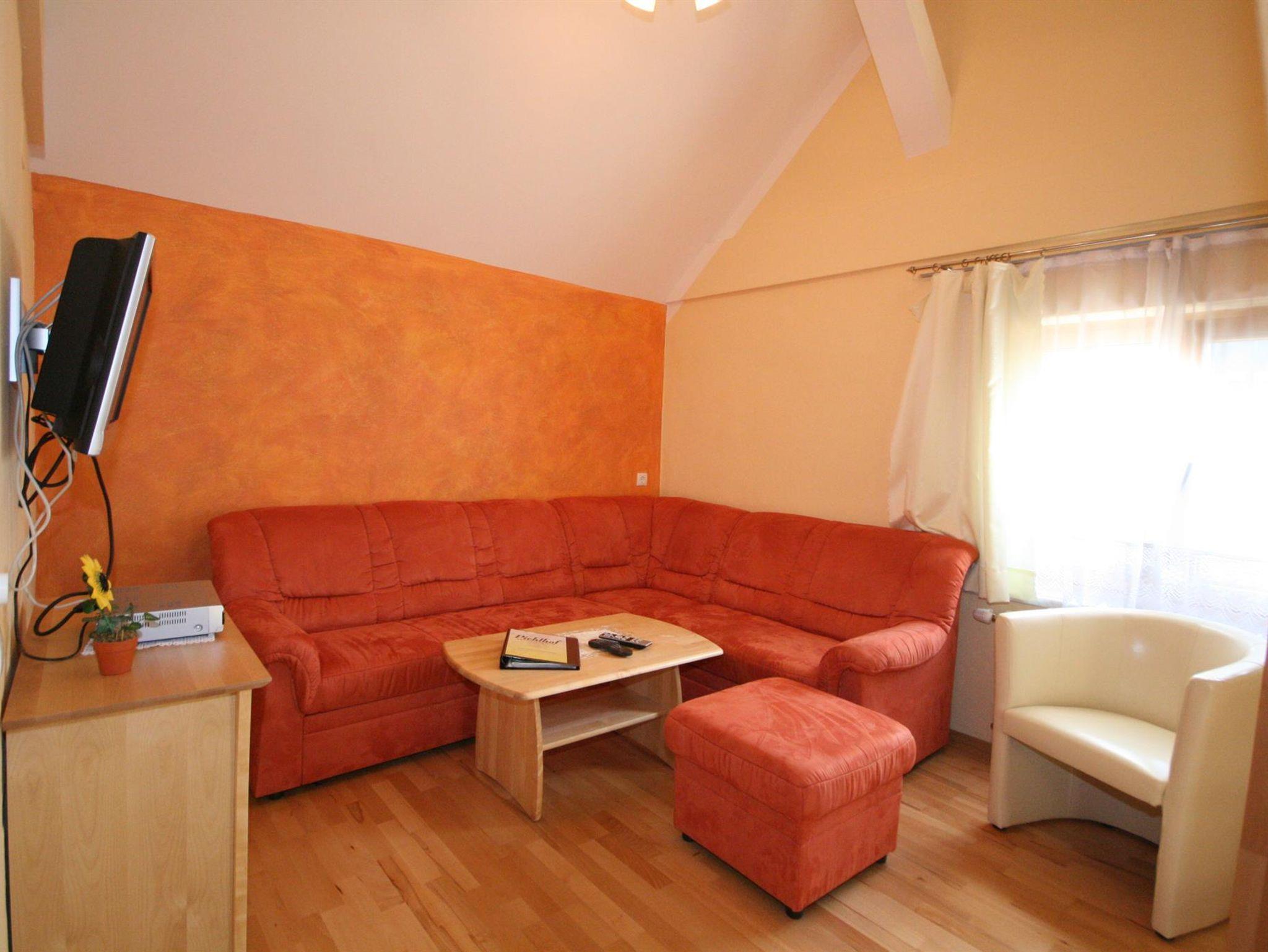 Im Wohnraum finden Sie einen Esstisch mit Eckbank, eine Sitzecke und einen Fernseher mit Sat-TV-Anschluss.