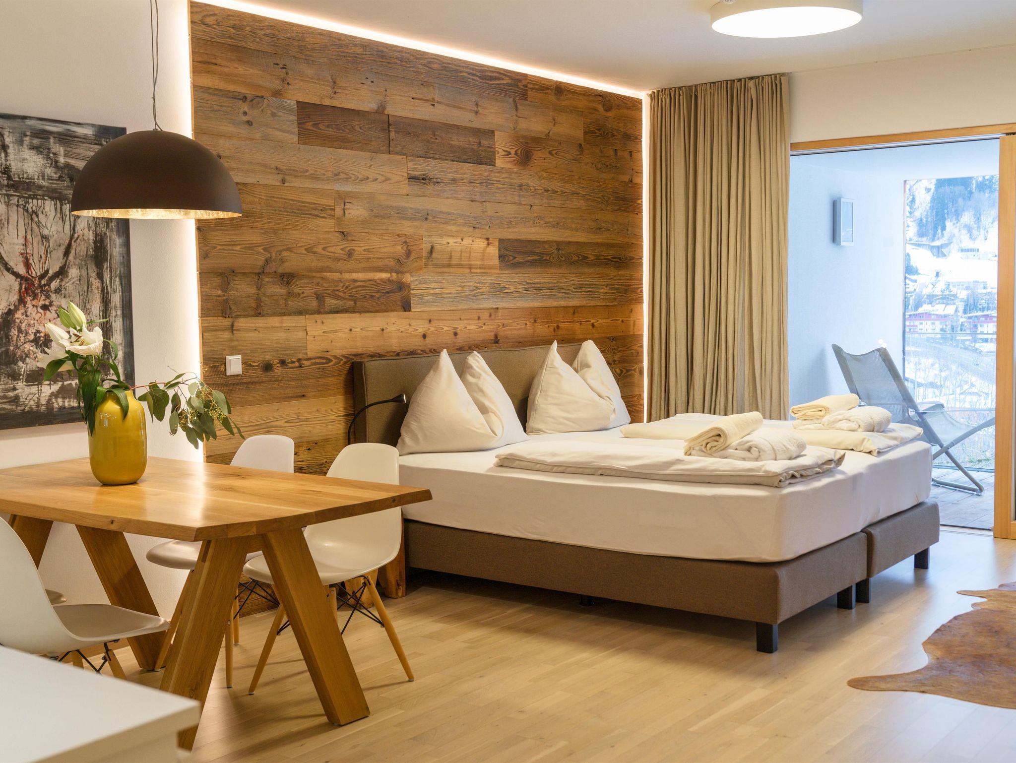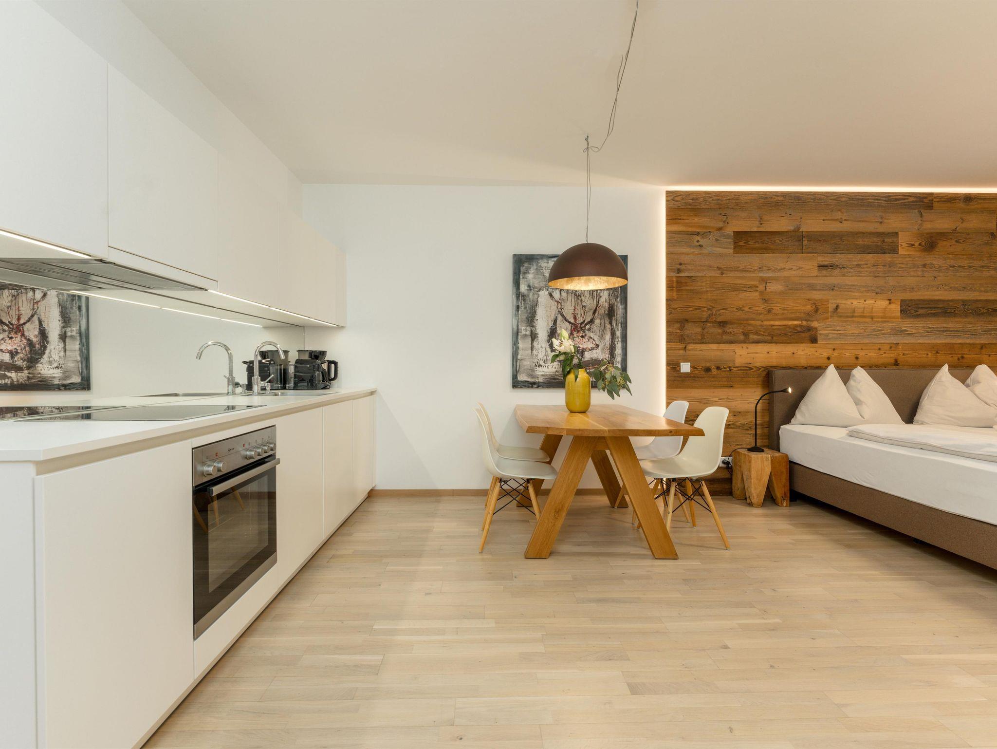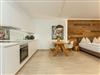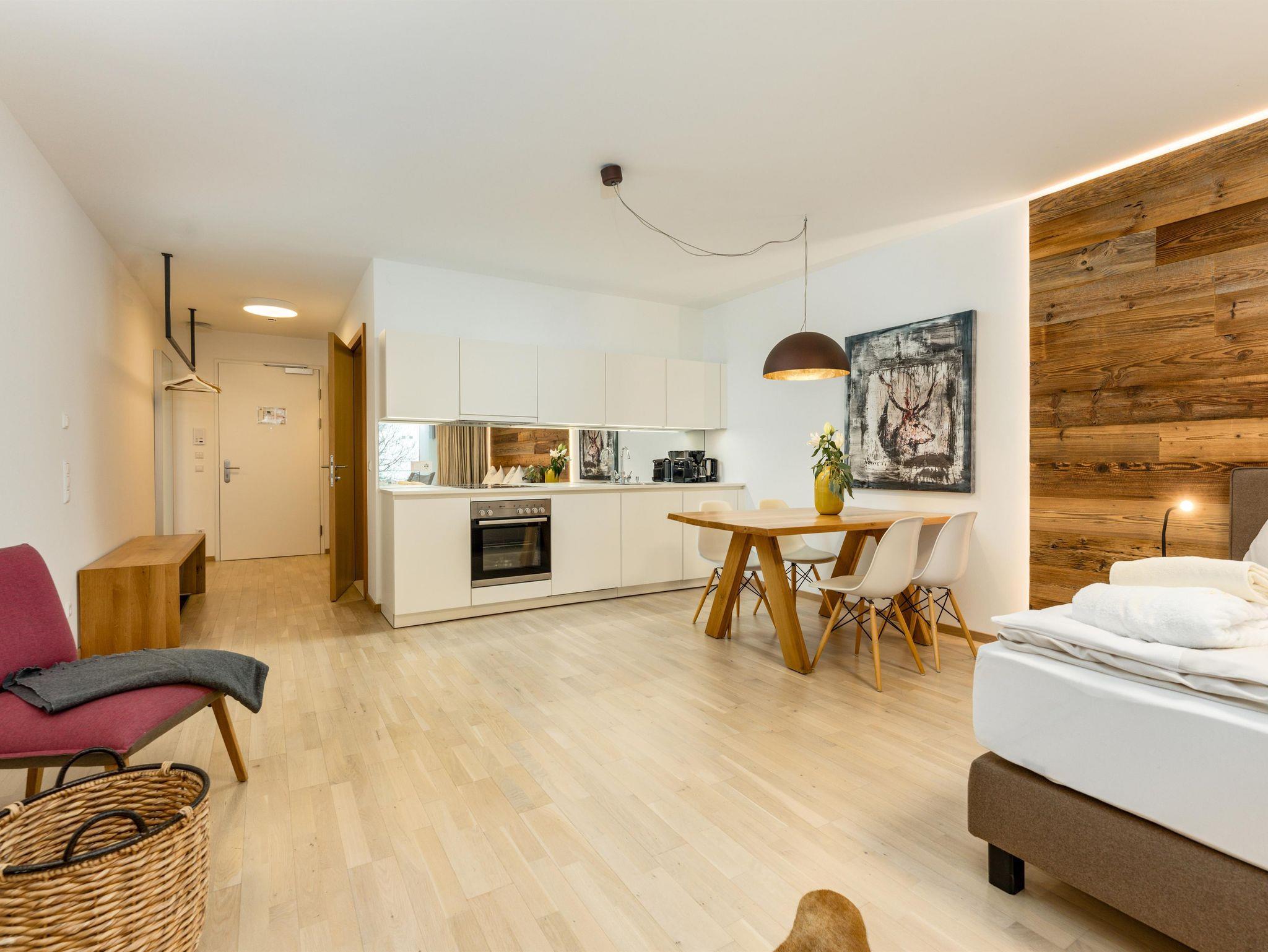 3 miteinander verbunden Häuser 38 servicierte Appartements, von 40m² Studios, Appartements mit einem, zwei oder drei Schlafzimmern bis hin zu 130m² Penthäusern, herrlichen Ausblick und Top Ausstattung inklusive! Die hochwertige Grundausstattung der Appartements mit heimischen Materialen wie Holz, Stein und Glas vermitteln ein modernes Wohlfühlambiente mit viel Licht und Aussicht, - eine Symbiose aus purem Lebensgefühl und Kraftplatz an der Sonne. Komplett ausgestattete Designküchen, großzügige Wohnräume zum Teil mit offenem Kamin, moderne & stylische Möbel, kostenfreies WLAN, Kabel TV in allen Schlaf- und Wohnräumen sowie moderne und lichtdurchflutete Badezimmer, lassen für den Gast, der seine private Freiheit schätzt, keine Wünsche offen .