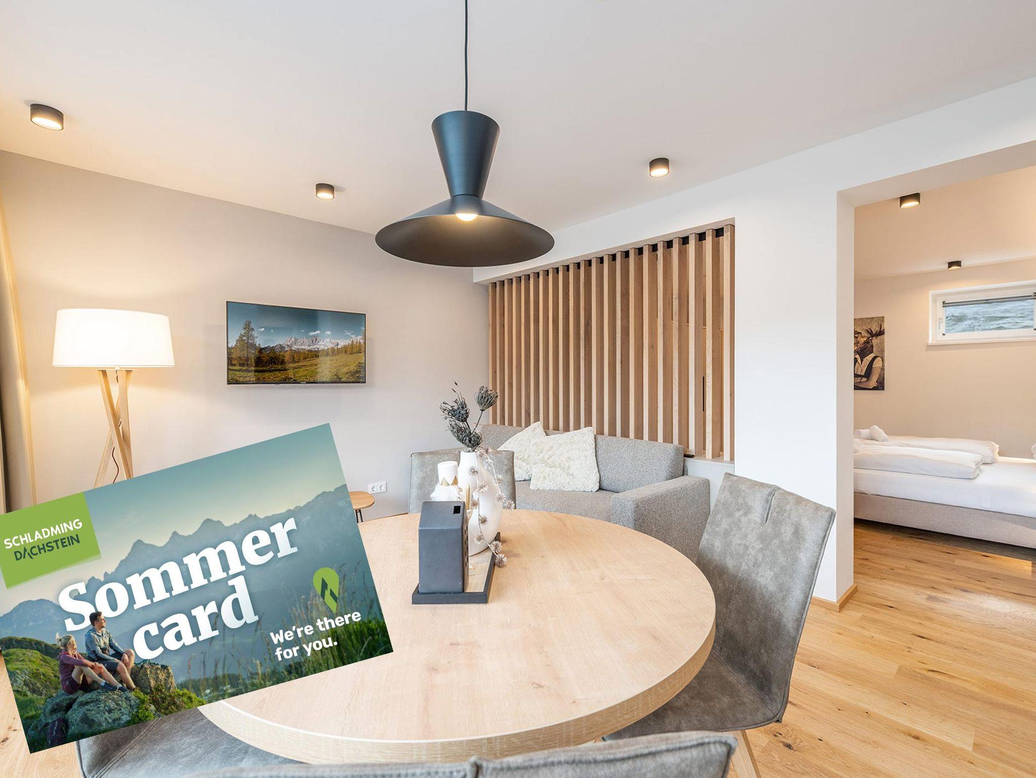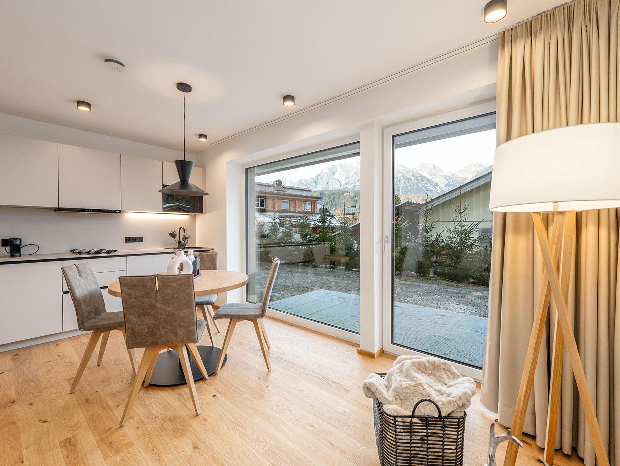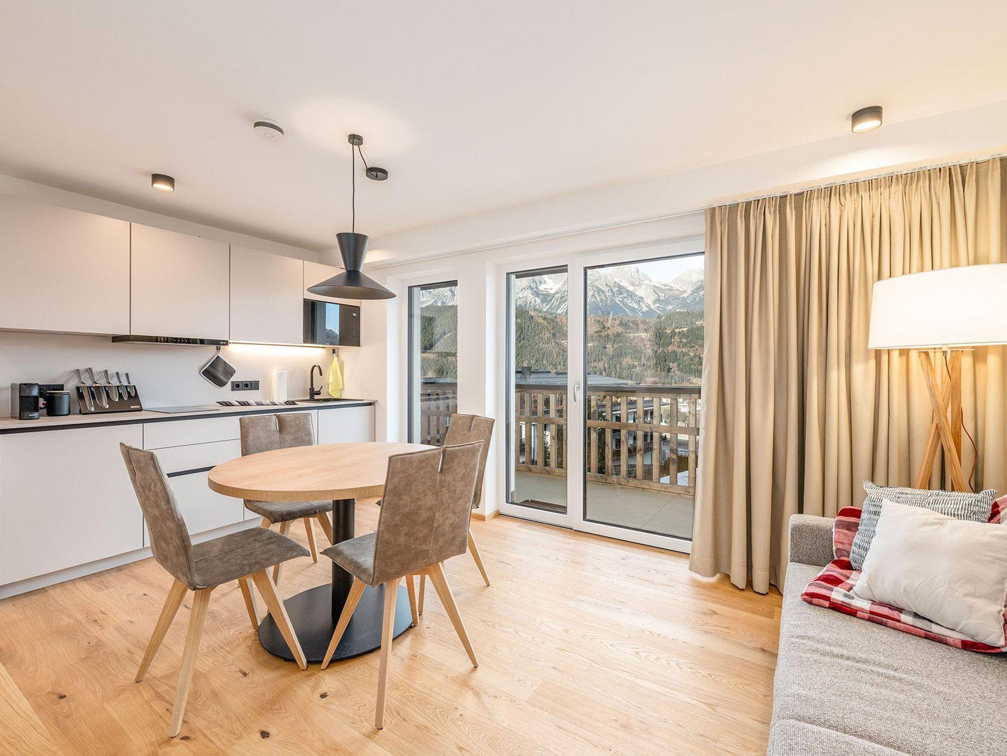 Alle Apartments überzeugen durch geschmackvolle, hochwertige Einrichtung, klare Raumkonzepte und eine angenehme Wohnatmosphäre. Großzügige Fensterflächen eröffnen eindrucksvolle Ausblicke auf die Schladminger Bergwelt – mit Panorama auf das Dachsteinmassiv, die Scheichenspitz und das Guttenberghaus. Je nach Einheit genießen Sie diese Aussicht von einem Balkon oder einer Terrasse – teils hoch über den Dächern der Stadt.