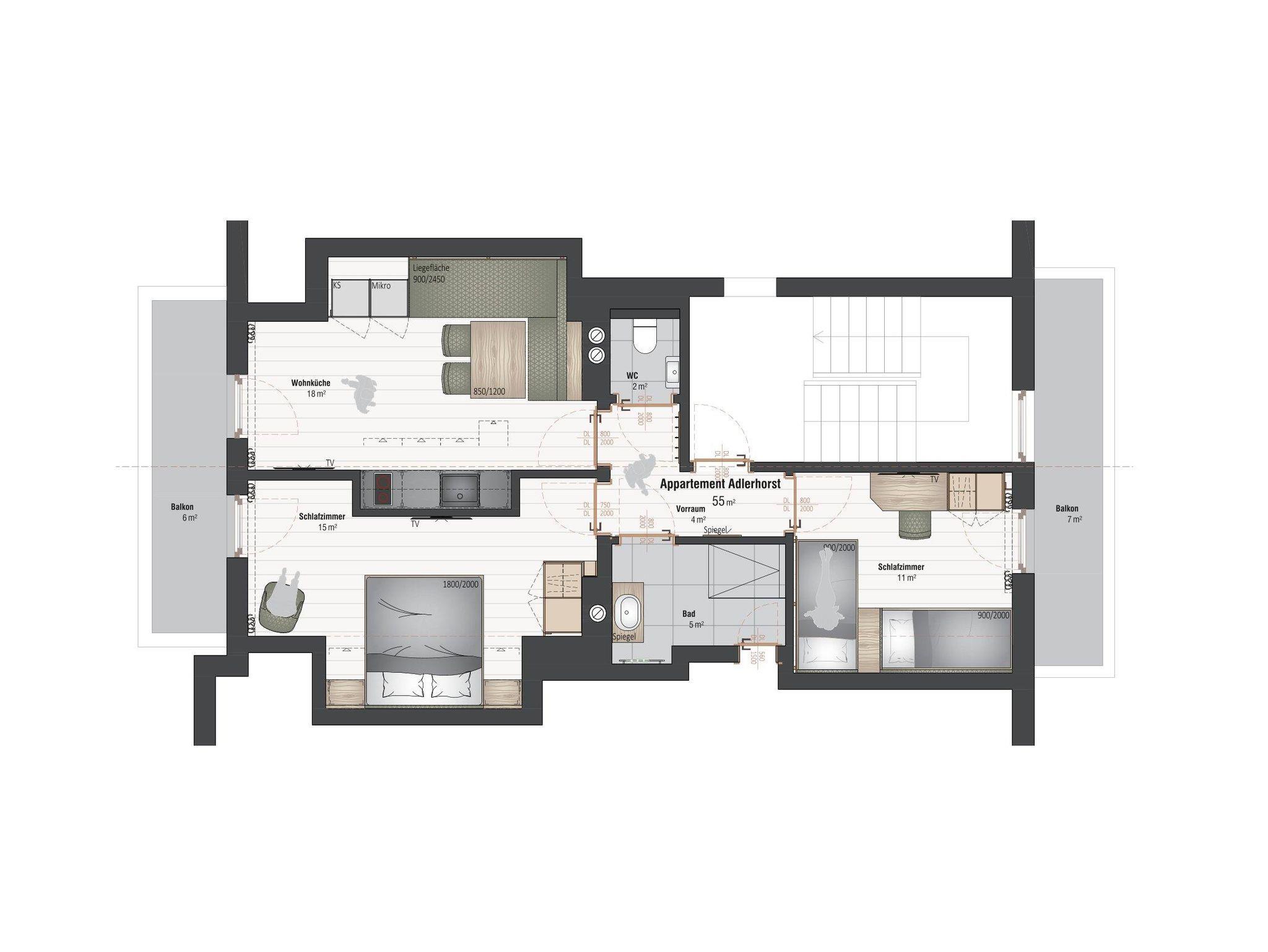 Dieses Appartement Adlerhorst liegt im zweiten Stock. Super Blick nach vorne in die Berge Richtung Reiteralm, ins Ennstal und natürlich zu den Gemsen und zum Wild. Bitte beachten: Diese Ferienwohnung hat eine Dachschräge, der eine mags der andere nicht! Das große Appartement verfügt über einen Vorraum, eine Wohnküche mit Essgelegenheit, ein Schlafzimmer mit Doppelbett, ein Schlafzimmer mit 2 separat stehenden Betten, ein separates WC sowie ein Bad mit Dusche. Beide Schlafzimmer haben Zugang zu einem Balkon. In der Wohnküche befindet sich ausserdem die Option für eine 5 Person zum schlafen.