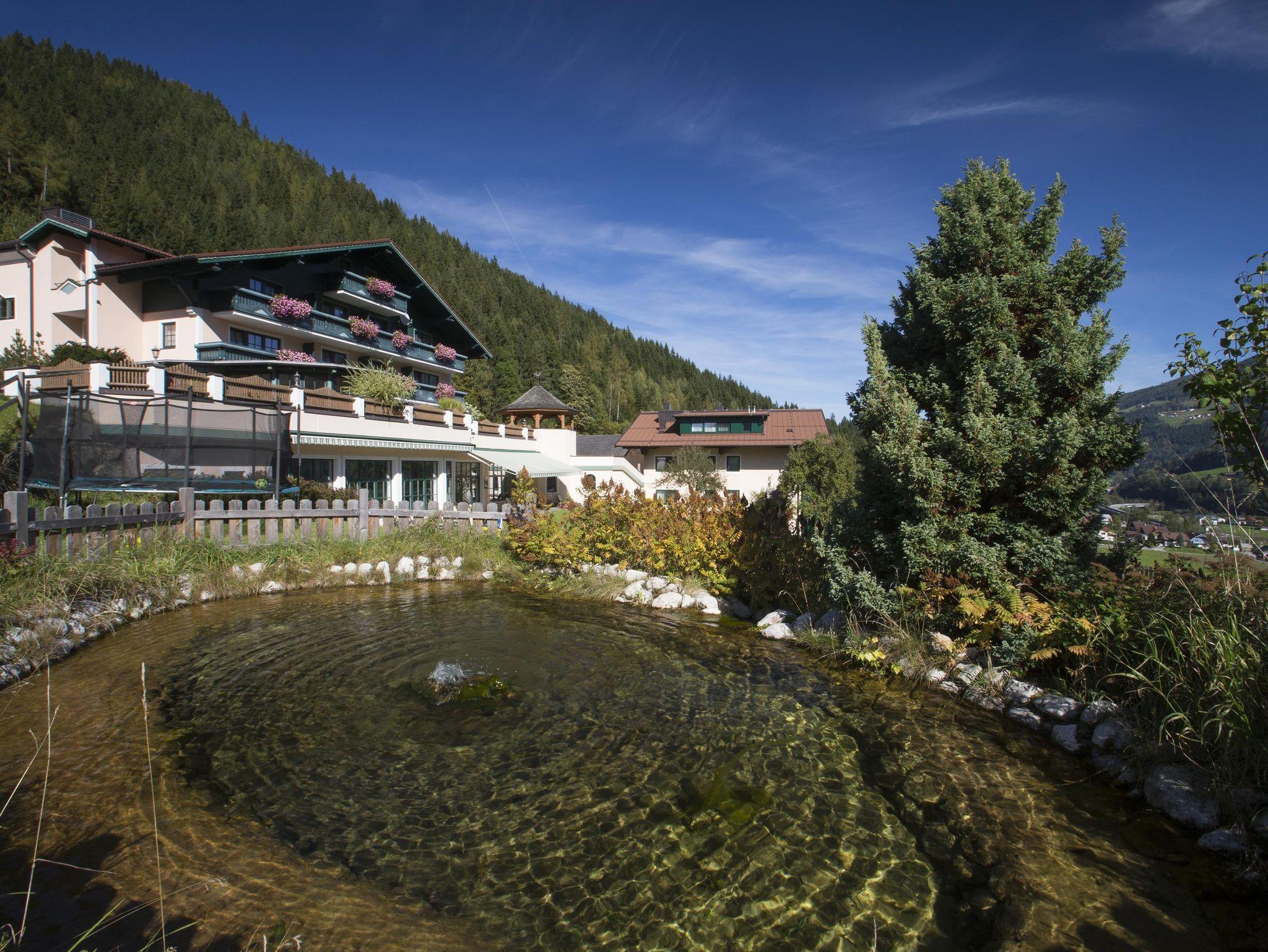 Unser familienfreundliches Wanderhotel befindet sich in herrlicher Sonnenlage mit Blick auf unsere Schladminger Bergwelt. Wir bieten Ihnen komfortable Doppelzimmer und Familien-Suiten an. Kulinarisch verwöhnen wir Sie mit steirischen Schmankerln und internationaler Küche, dabei wird auf hohe Qualität auch mit Bio-Produkten geachtet. Erholung pur finden Sie in unserer Wellnesslandschaft mit Erlebnis-Hallenbad, Sauna (Dampfbad, Hüttensauna, Tepidarium)Fitness und Massage. Unsere großzügig angelegte Gartenanlage mit Schwimmbiotop, Kneippanlage und Sonnenterrasse laden zum Verweilen ein. Kinderprogramm Juli/August, Reiten auf unseren Isländer Pferden, Fischen, geführte Wanderungen gehören zu unserem Angeboten. Laufstrecken, Wanderwege, Radwege direkt vorm Hotel. Sommercard. Schibushaltestelle im Winter direkt vor der Haustüre. * Attraktive Winterpauschalen * Frühlingspackages * Tolle Sommer-Familienangebote * Herbstwanderwochen * Mountain-Bike Pauschalen