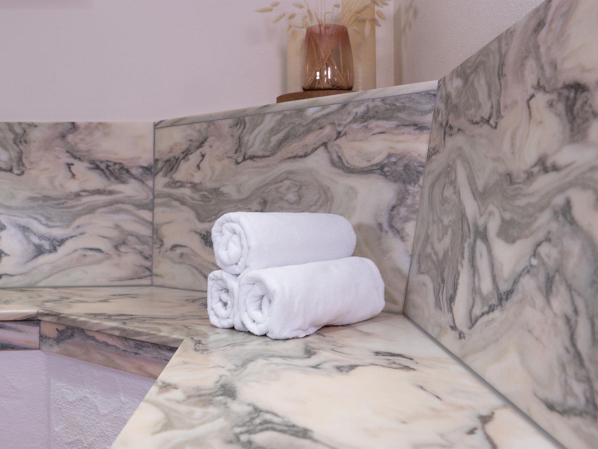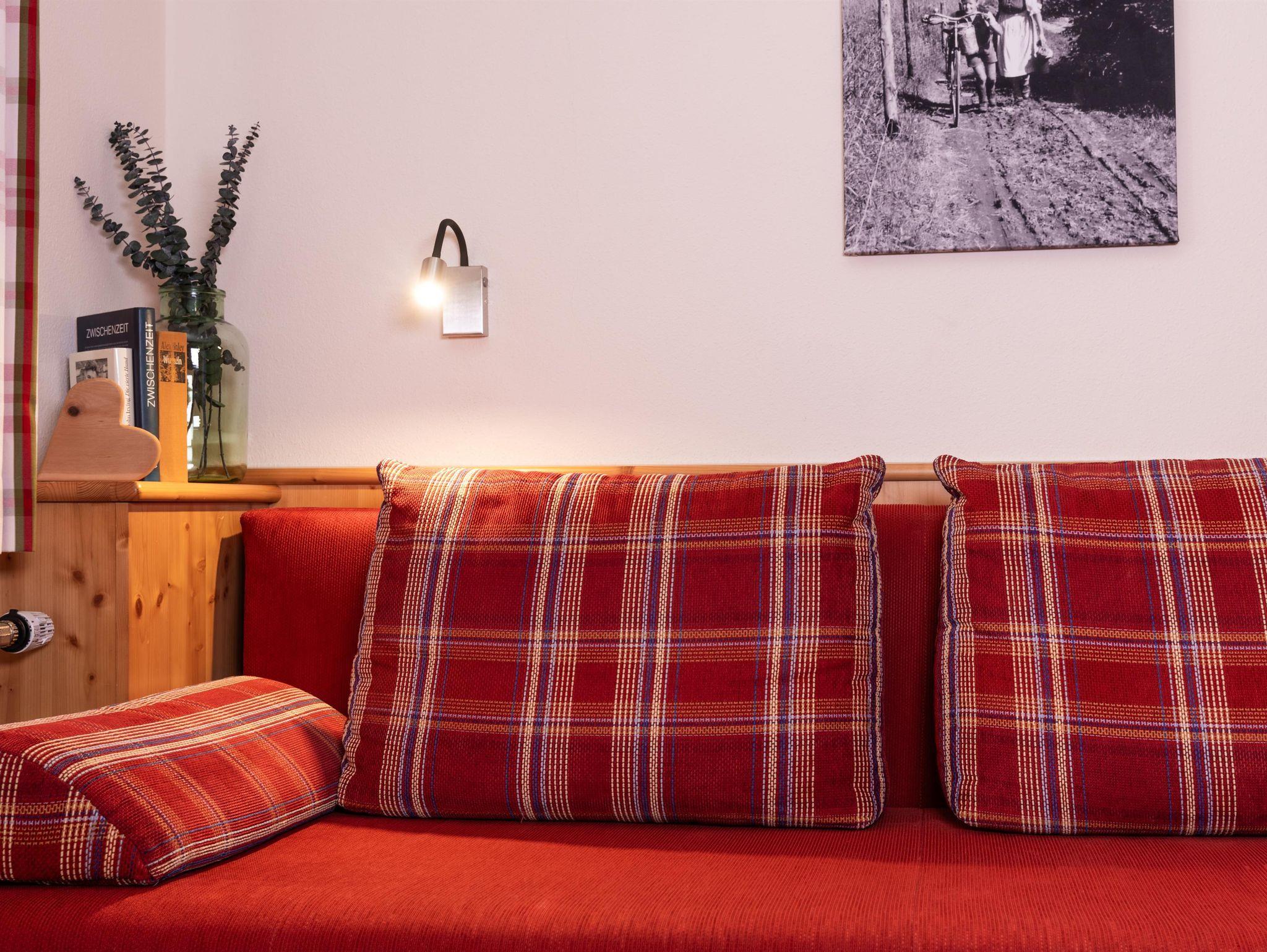 Bei der Einrichtung der Zimmer wurde bewusst darauf geachtet, Materialien aus der Region zu integrieren. Die Möbel wurden aus heimischem Fichtenholz gefertigt. Die Bäder wurden mit Fliesen in Holzoptik und Marmor aus der Region gestaltet und das Sofa aus dem typischen Schladminger Loden verleiht dem Zimmer ein gemütliche Atmosphäre.