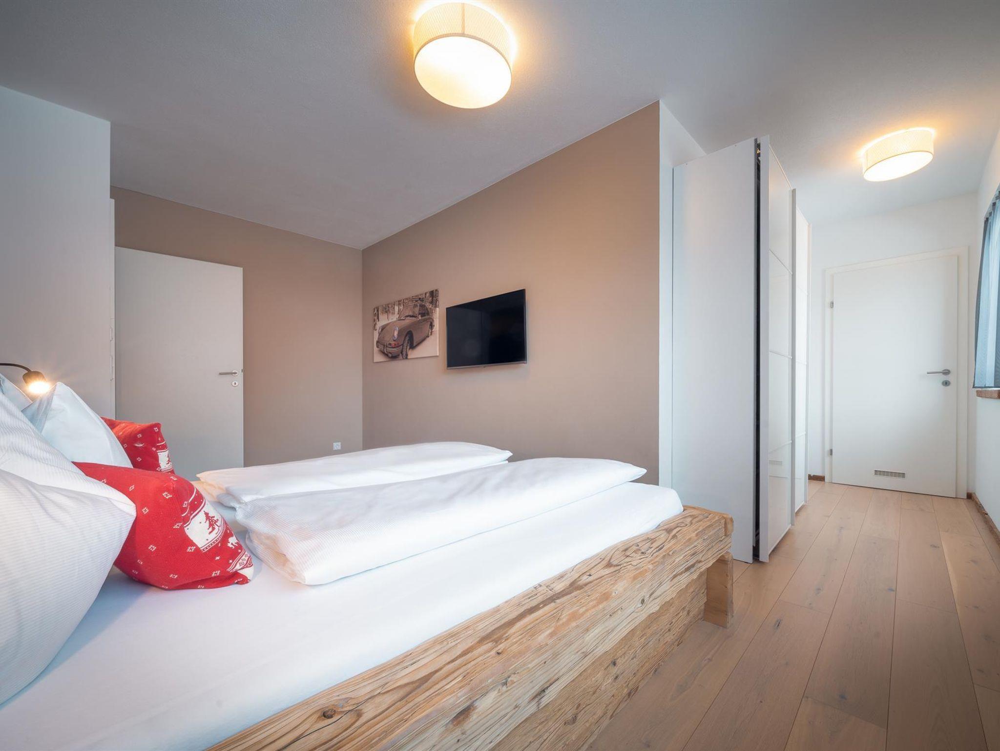 Das 65 m² Appartement liegt im 1. Stock des Appartementhauses und bietet Platz für bis zu 6 Personen. Die großzügigen Räumlichkeiten überzeugen mit einer top Ausstattung, Geschmack und viel Komfort. Die Wohnfläche verteilt sich in eine großzügige Wohnküche mit Sofa (auch als Schlafsofa für 2 Personen nutzbar), TV, Esstisch und eine voll ausgestattete Küche. Vom Wohnraum ist auch der 11 m² Südbalkon mit Balkonmöbel und Bergblick erreichbar. Weiteres verfügt das Appartement über zwei separate Schlafzimmer, beide mit Doppelbett und TV ausgestattet. Das Badezimmer bietet eine Dusche, einen Waschtisch, ein WC, Radio und Fön.
