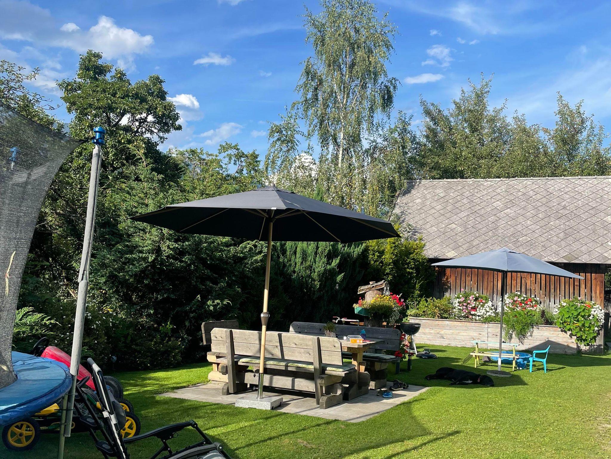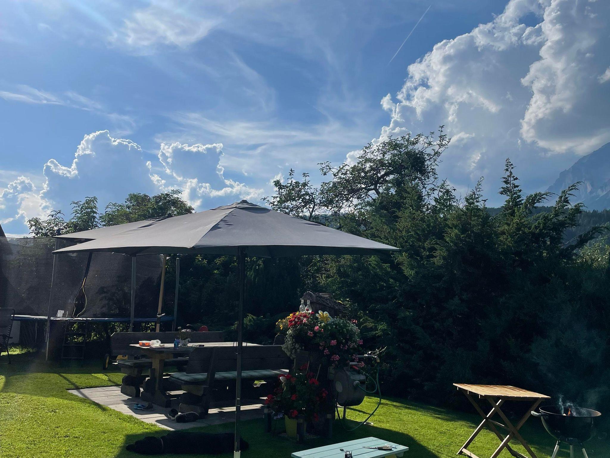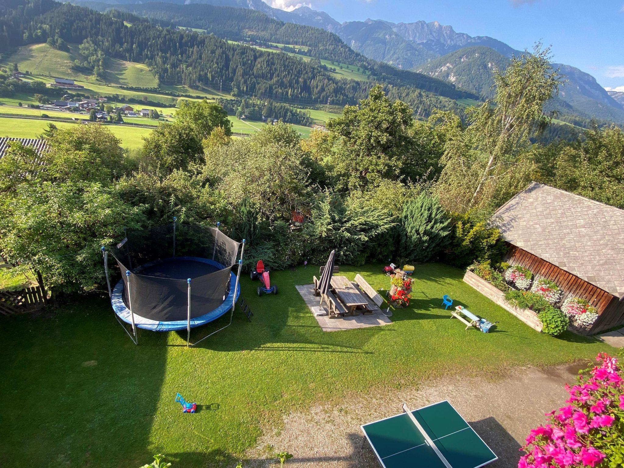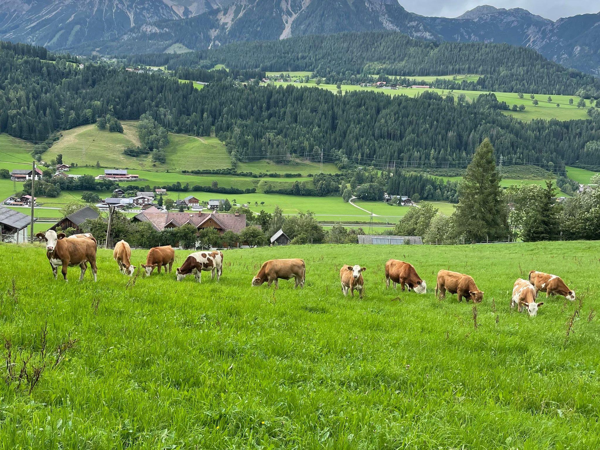 Die leicht erhöhte Lage bietet eine beeindruckende Sicht über das Ennstal auf das gegenüberliegende Dachsteinmassiv.