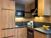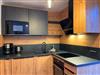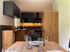 Im Wohnbereich befinden sich ein großes Schlaf Sofa, eine voll ausgestattete Küche und ein Essbereich.