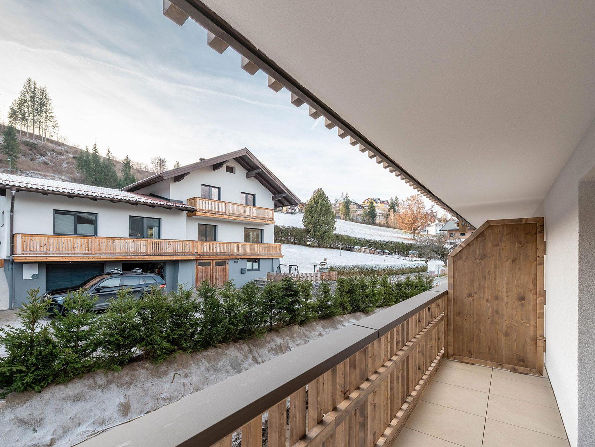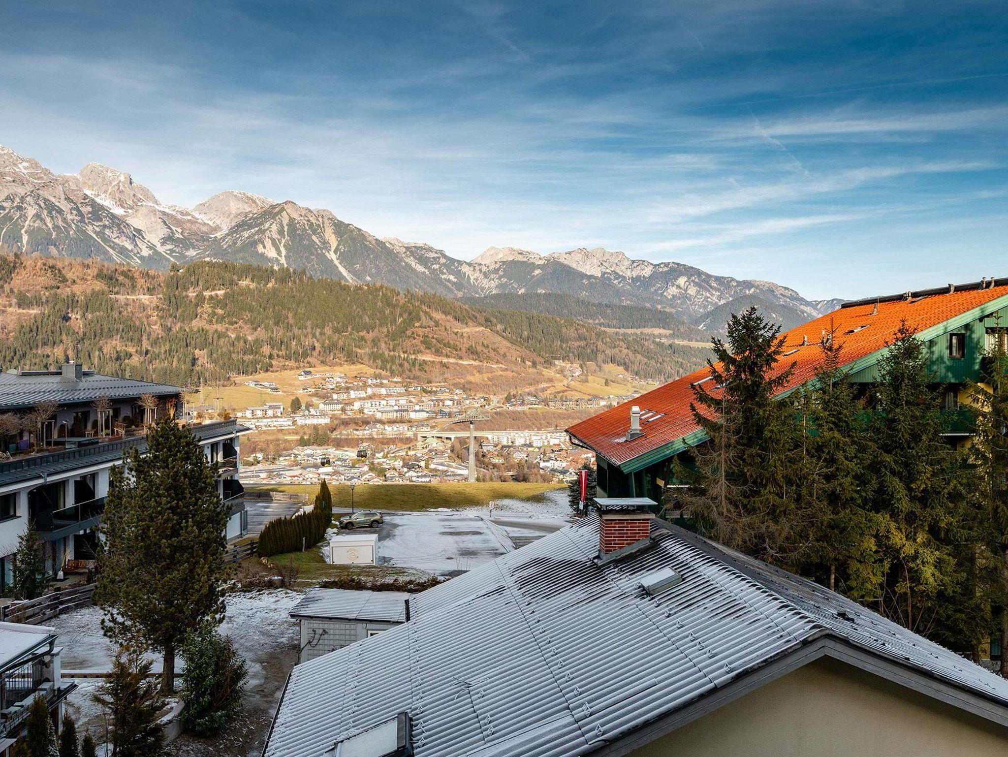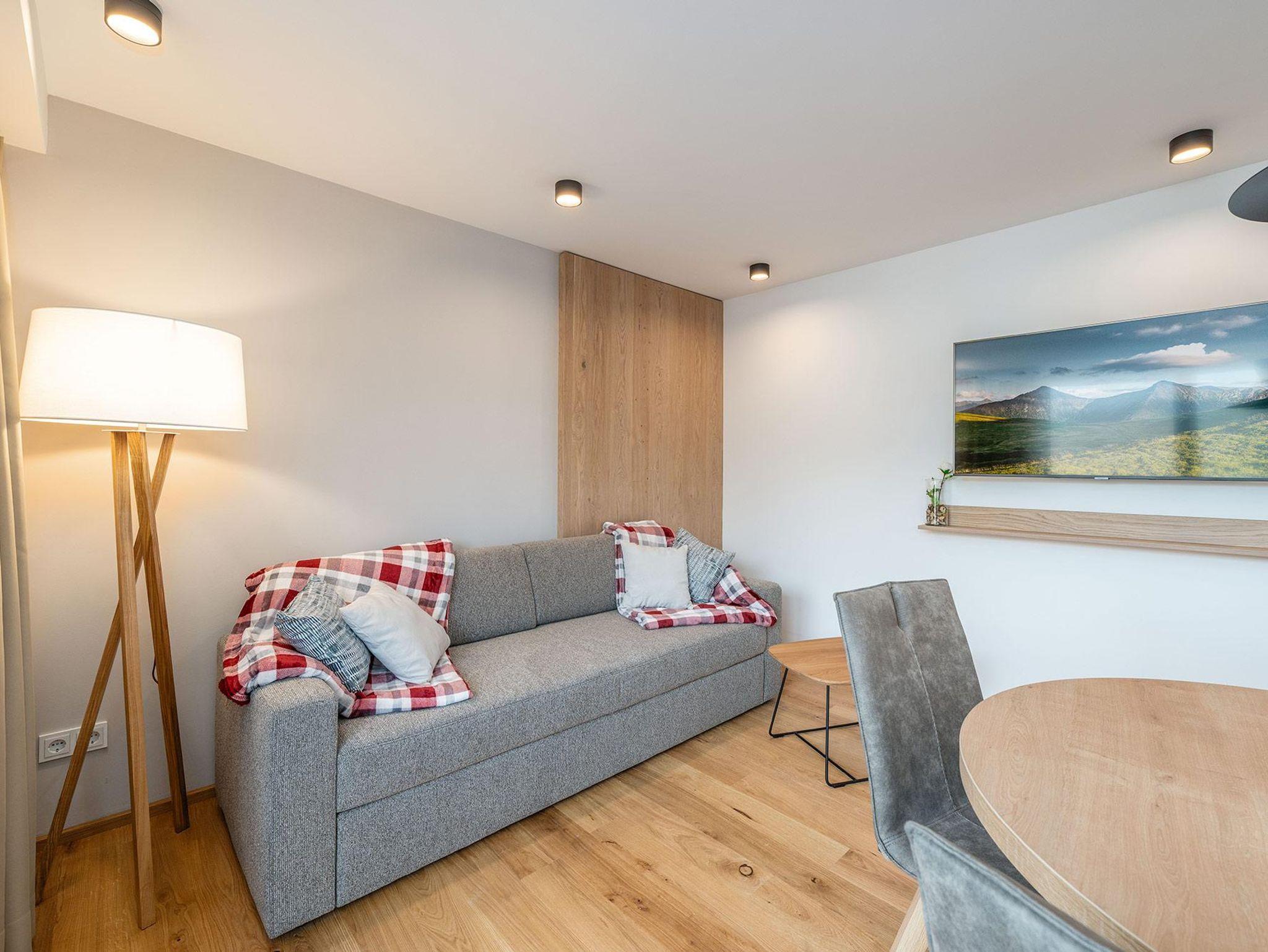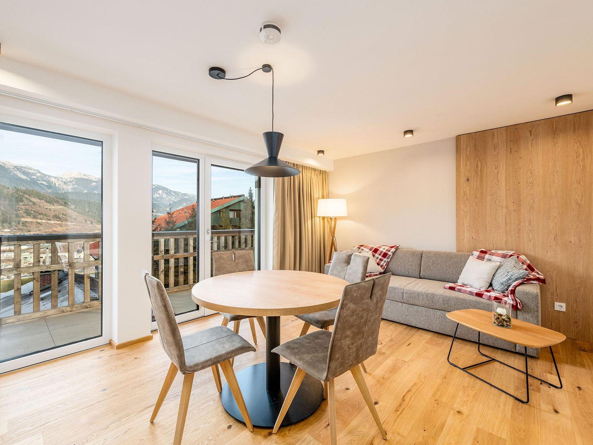 Das Schlafzimmer verfügt über ein komfortables 180-cm-Doppelbett, während im Wohn-/Essbereich ein hochwertiges Schlafsofa zusätzlichen Platz für bis zu zwei Personen bietet. Der Balkon eröffnet einen eindrucksvollen Blick über die Dächer von Schladming hinweg auf die umliegende Bergwelt.