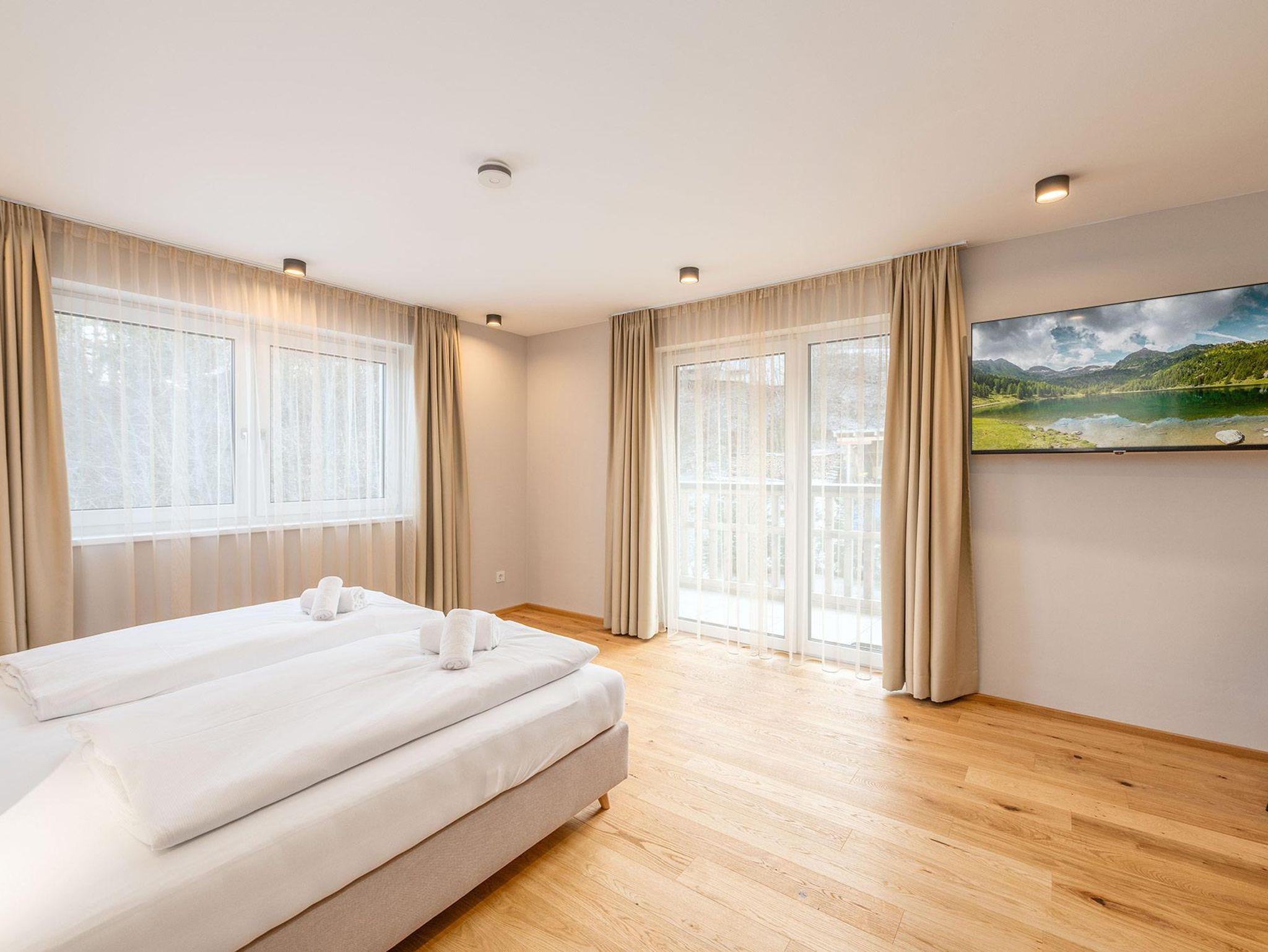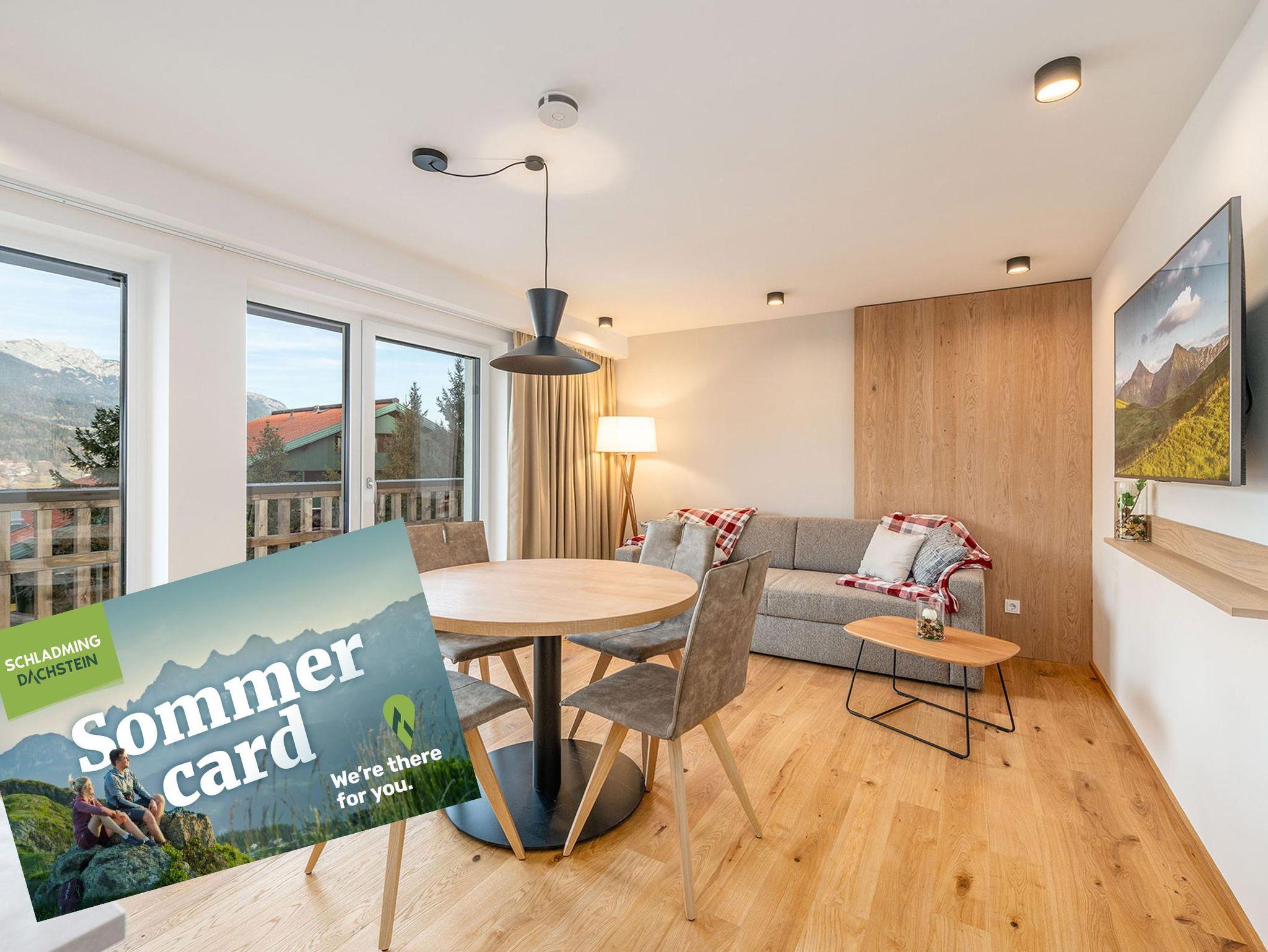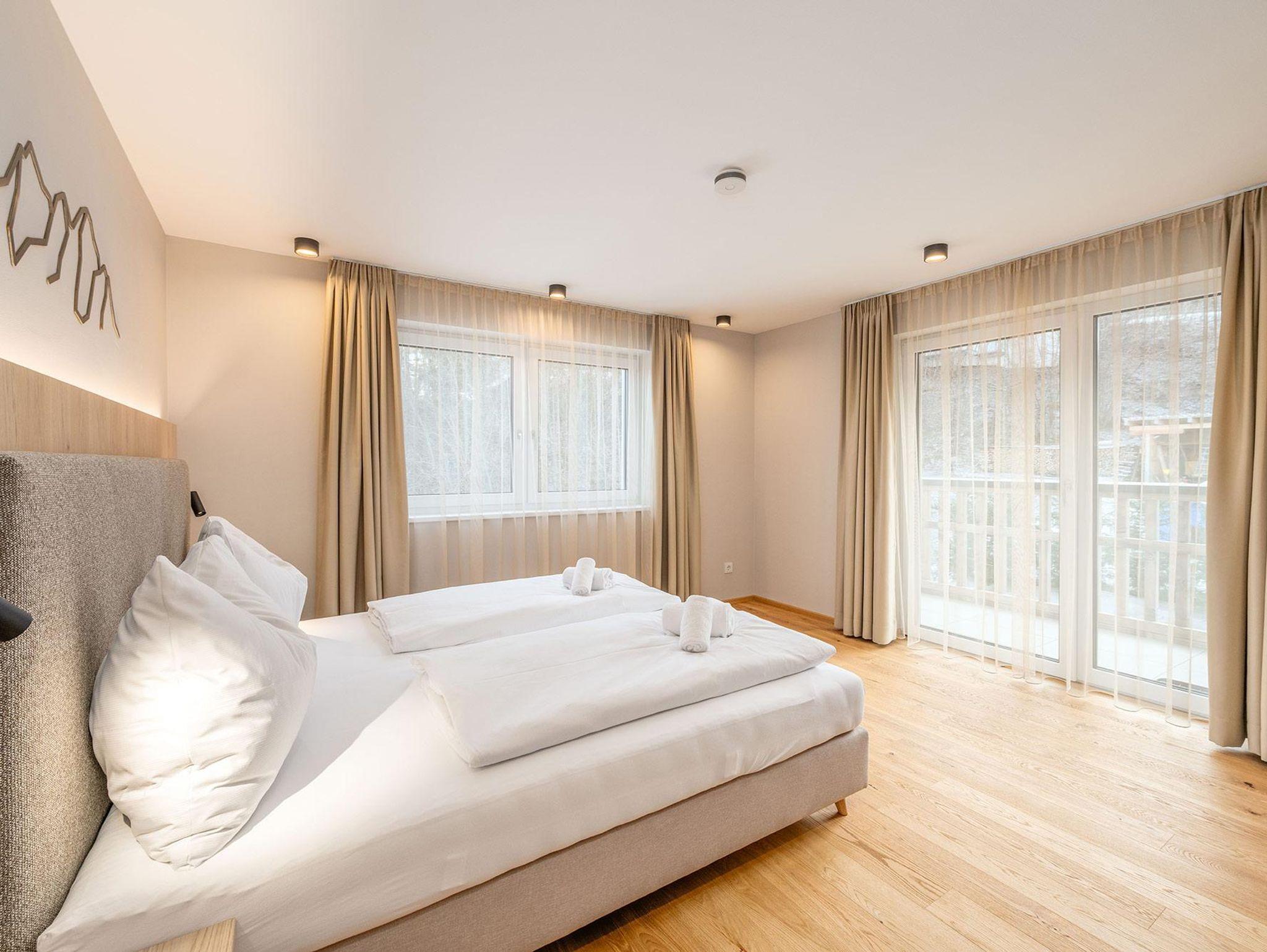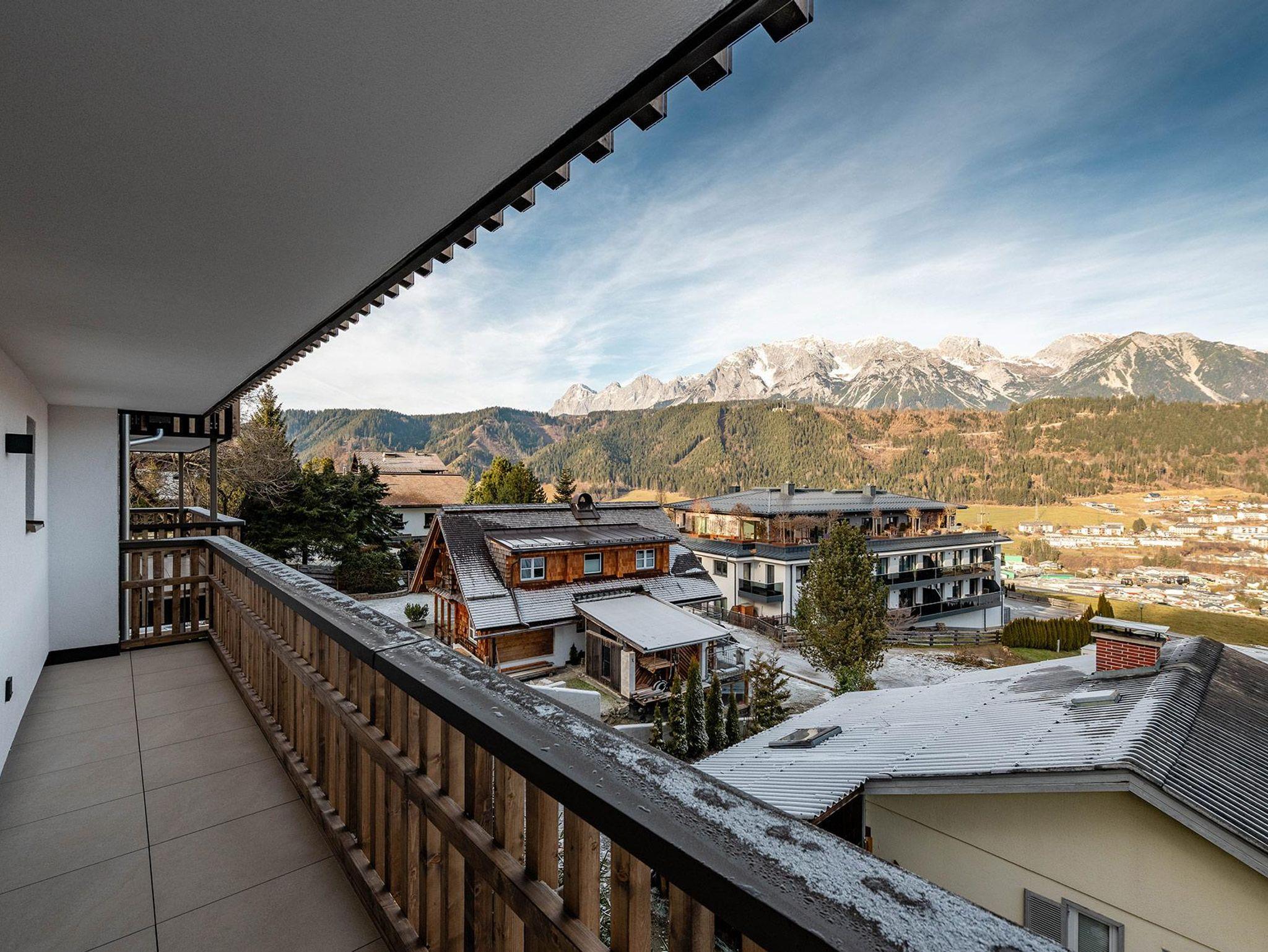 Alle Apartments überzeugen durch geschmackvolle, hochwertige Einrichtung, klare Raumkonzepte und eine angenehme Wohnatmosphäre. Großzügige Fensterflächen eröffnen eindrucksvolle Ausblicke auf die Schladminger Bergwelt – mit Panorama auf das Dachsteinmassiv, die Scheichenspitz und das Guttenberghaus. Je nach Einheit genießen Sie diese Aussicht von einem Balkon oder einer Terrasse – teils hoch über den Dächern der Stadt.