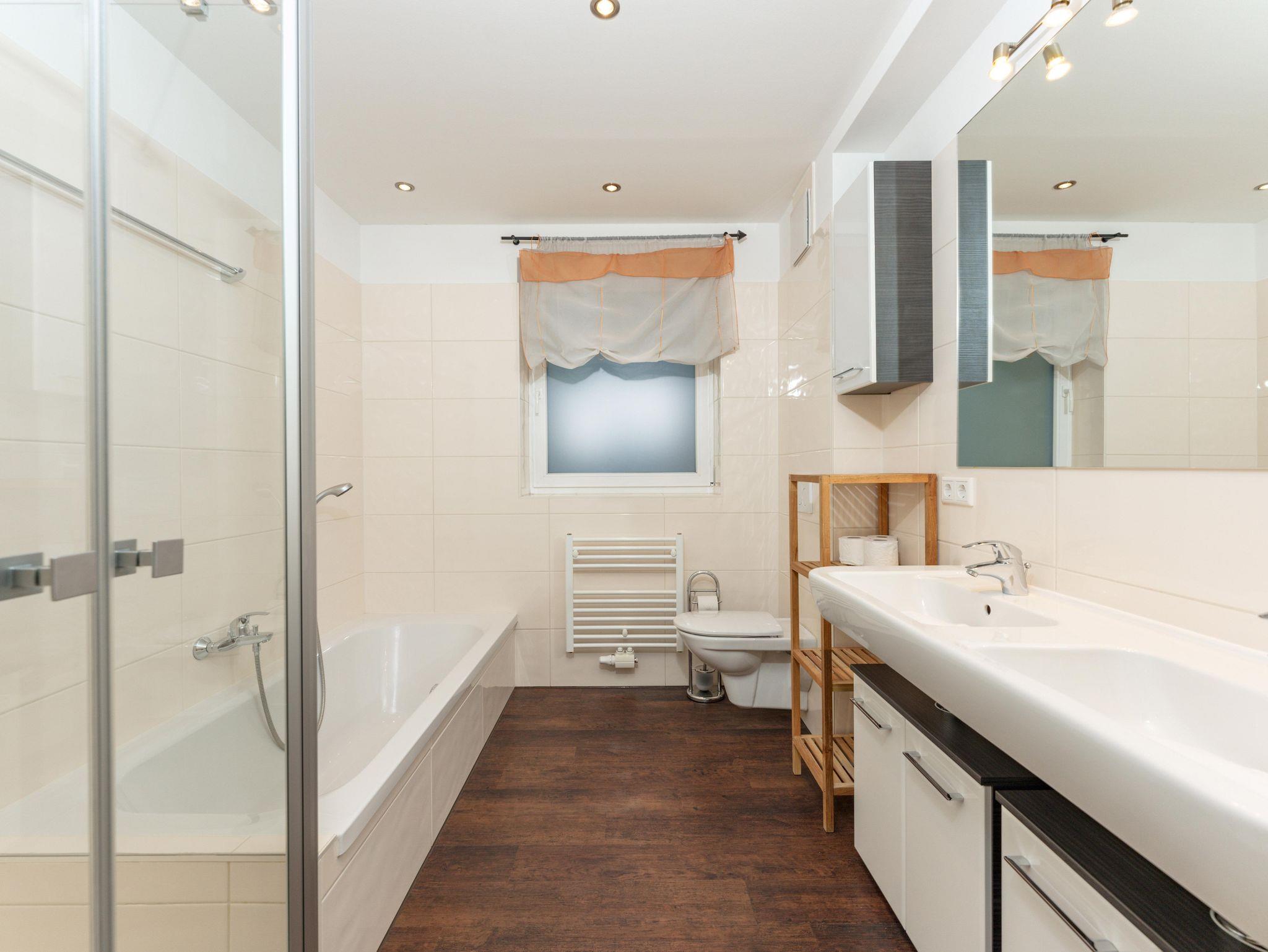 - 1 Bad mit Doppelwaschtisch, Badewanne und Dusche, WC