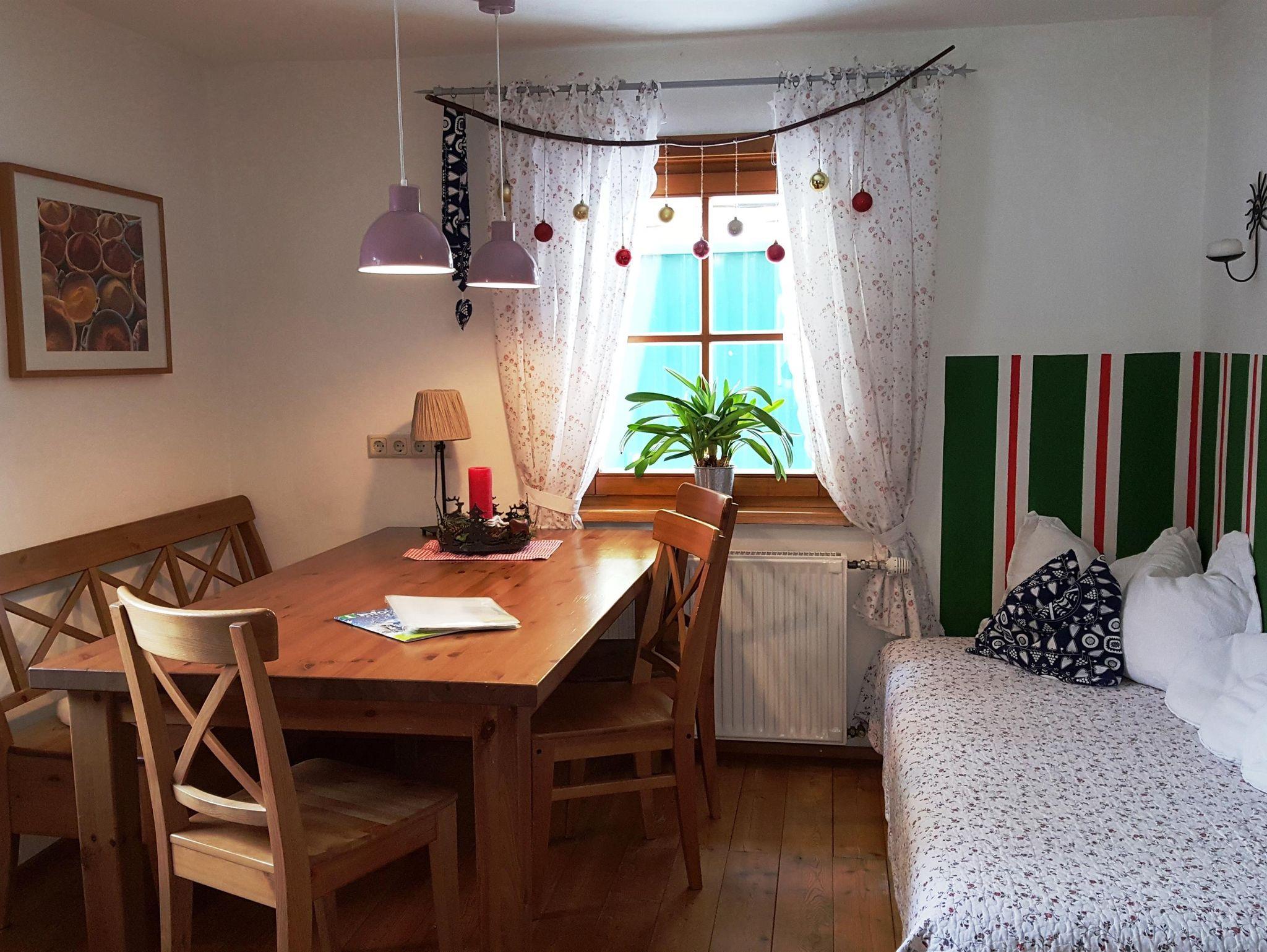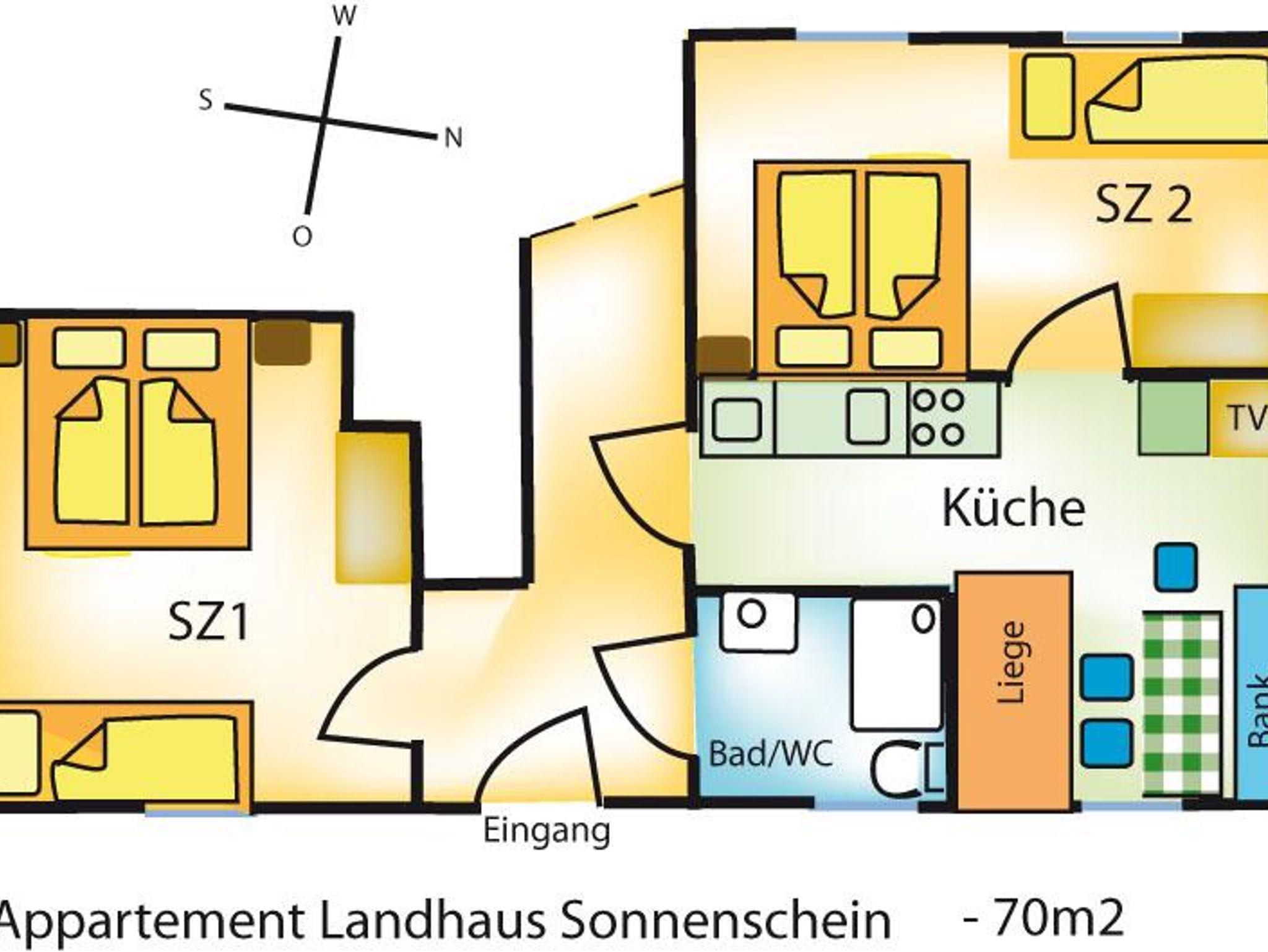 Das 70 m² große Appartement mit separatem Eingang bietet eine Wohnküche, zwei Schlafzimmer mit je einem Doppel- und Einzelbett sowie einen großzügigen Vorraum.