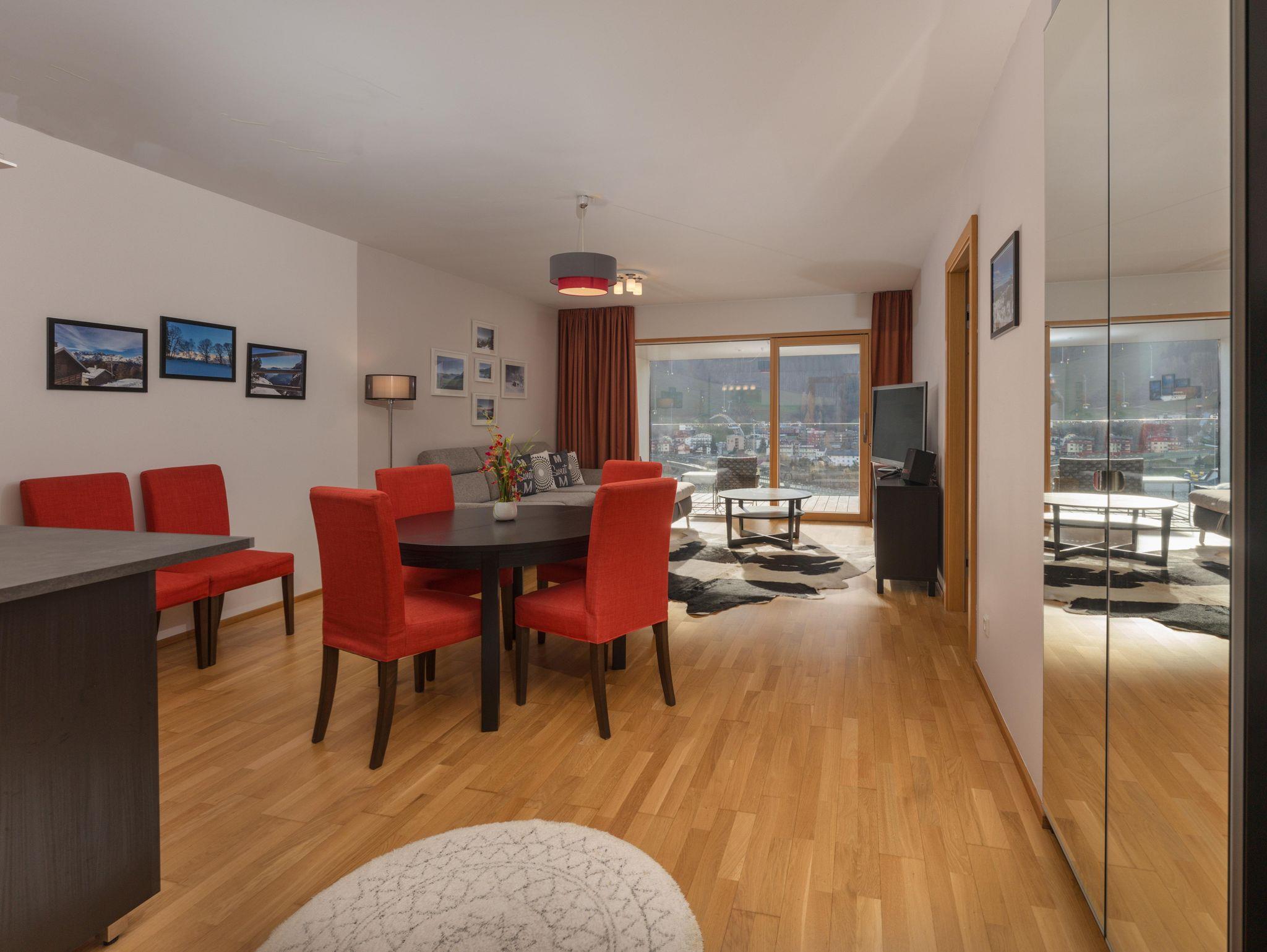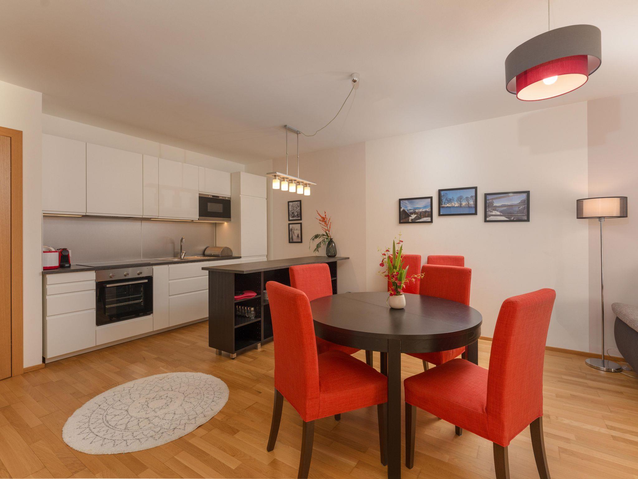 Zu dem Appartement gehört eine Loggia, ausgerichtet nach Süden, die vom Wohnraum sowie von einem Schlafzimmer aus zugänglich ist. Kostenfreies WLAN & Kabel TV lassen für den Gast keine Wünsche offen