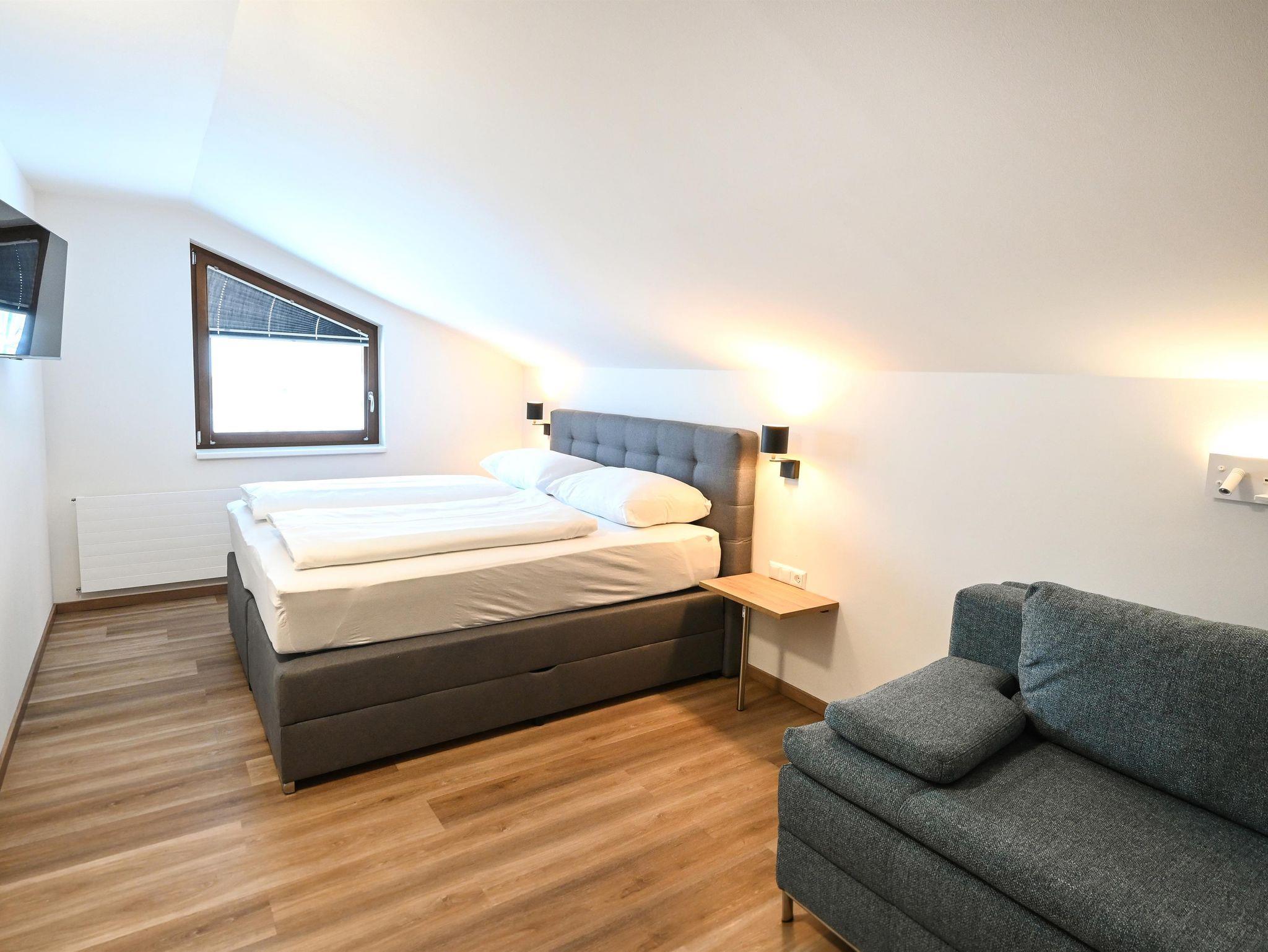 Im Schlafzimmer befindet sich ein Doppelbett und ein Doppelschlafsofa. Zusätzlich gibt es im Wohnbereich eines der Appartements ein Einzelschlafsofa.