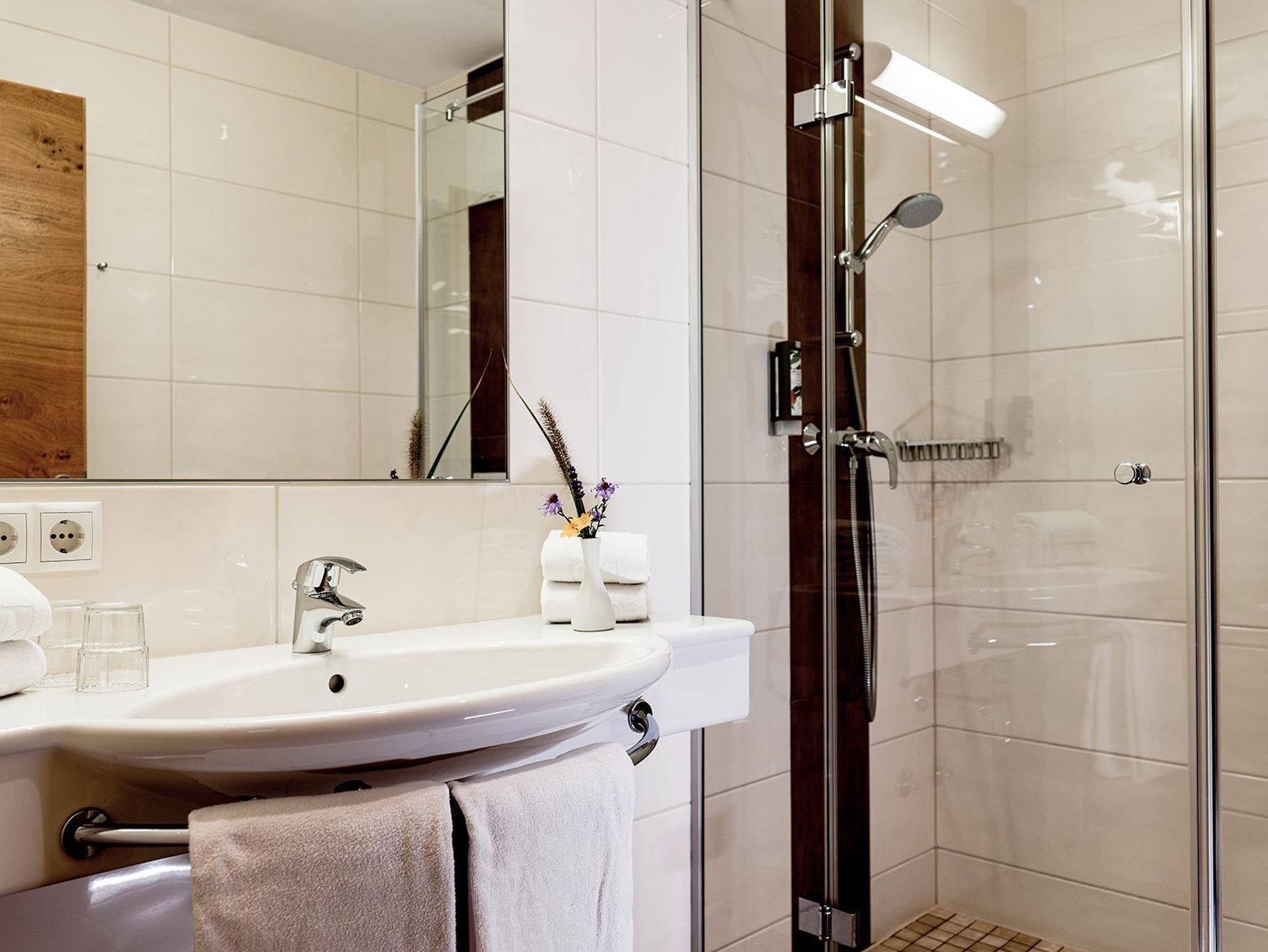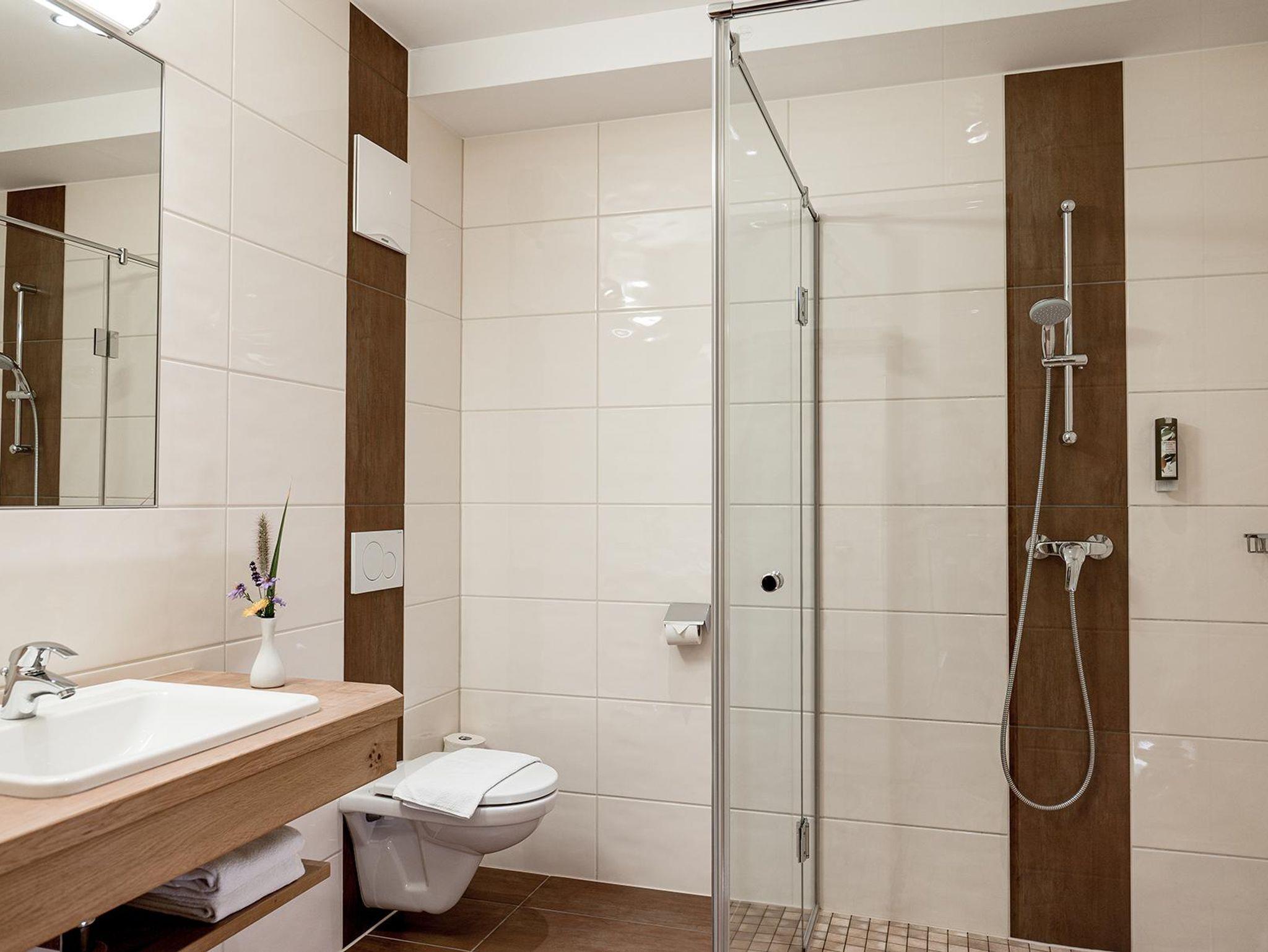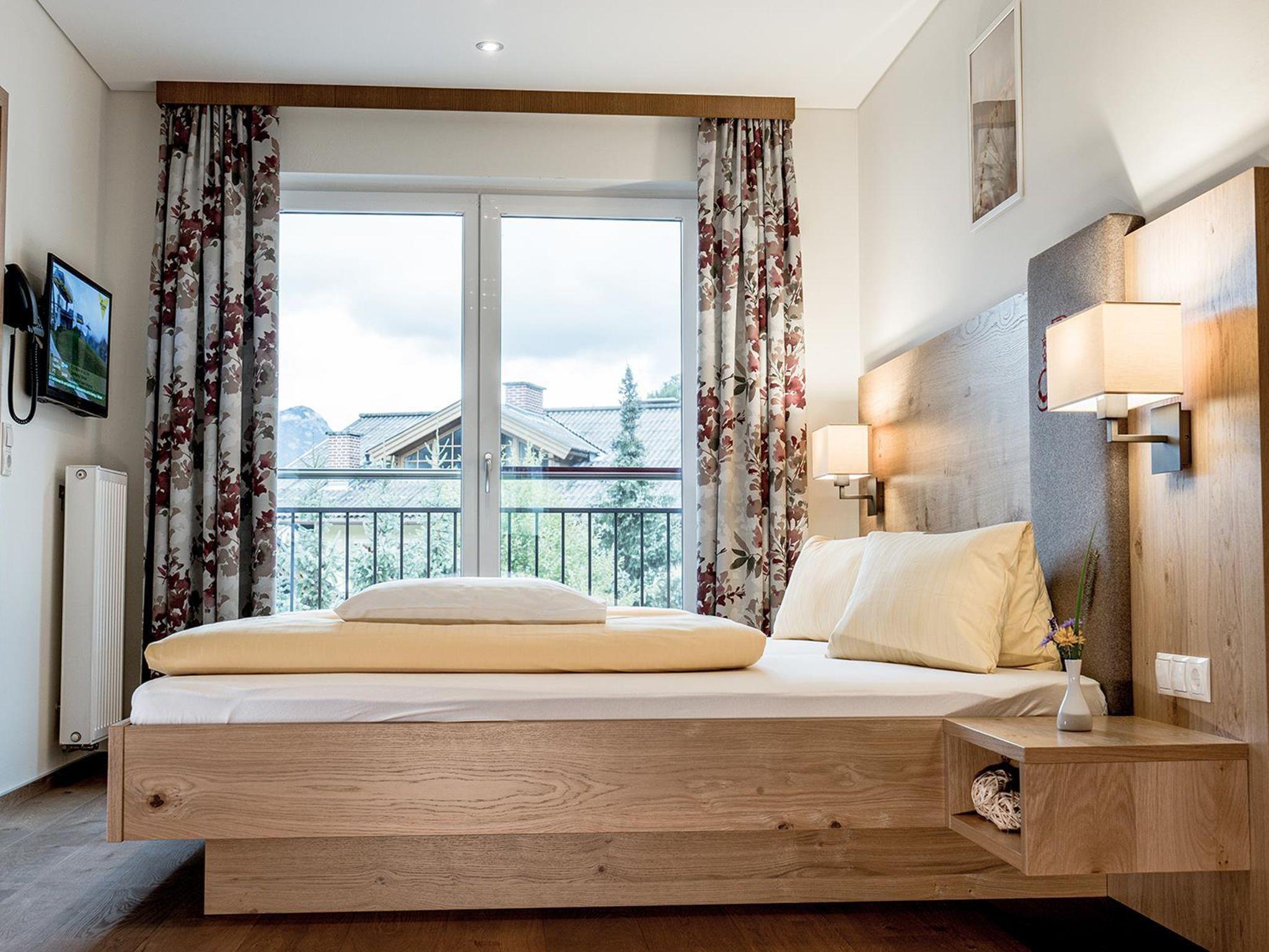 Doppelzimmer mit ca. 22 m². Die Doppelzimmer verfügen über ein Doppelbett, 1 Badezimmer mit Dusche und WC. Alle Appartements und Zimmer sind mit Telefon, TV, Safe, Föhn und WLAN Internet ausgestattet.