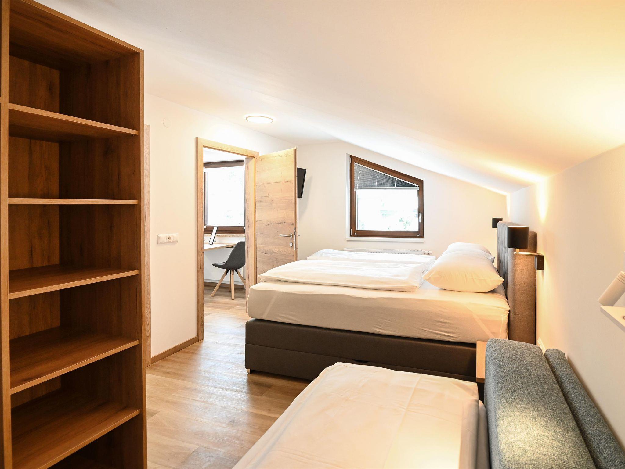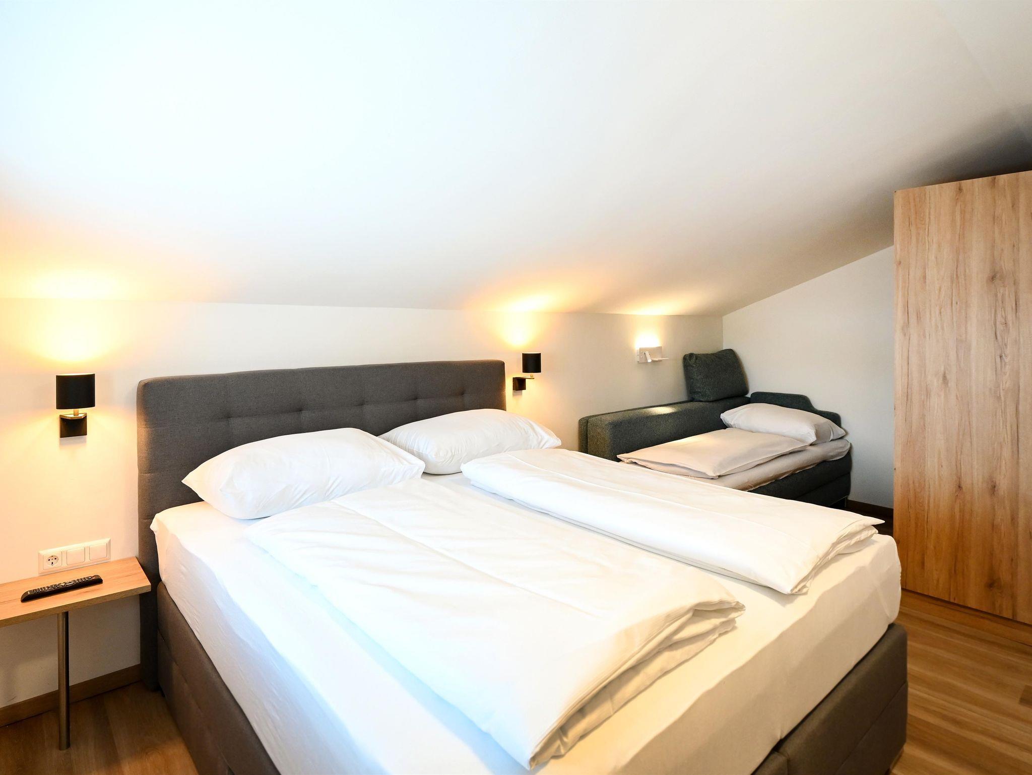 Im Schlafzimmer befindet sich ein Doppelbett und ein Doppelschlafsofa. Zusätzlich gibt es im Wohnbereich eines der Appartements ein Einzelschlafsofa.