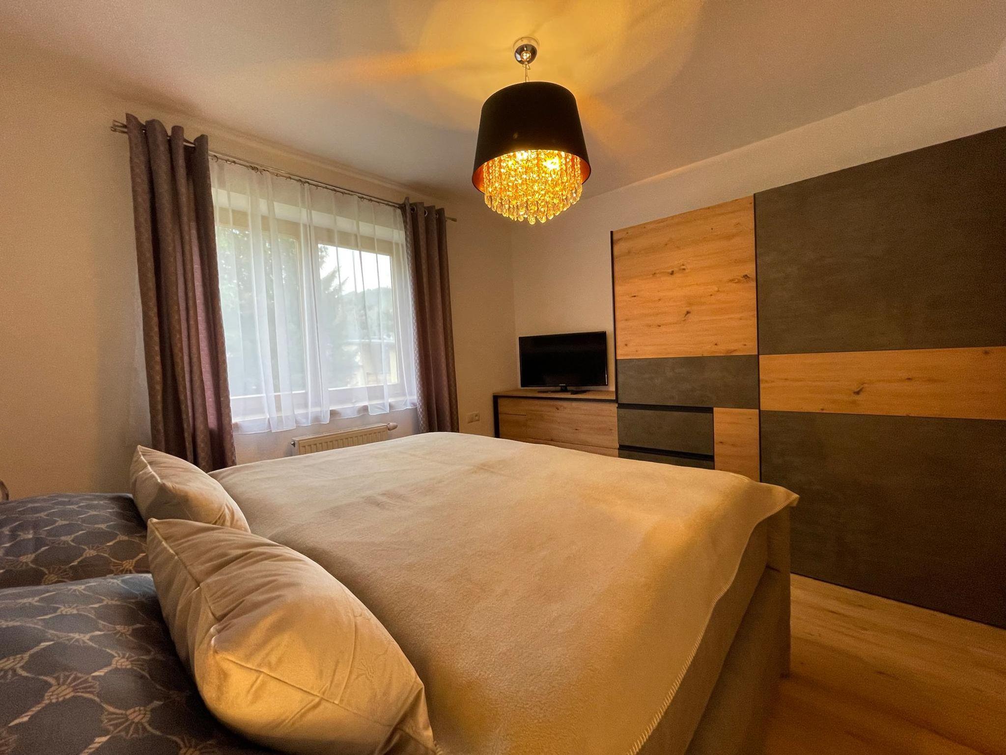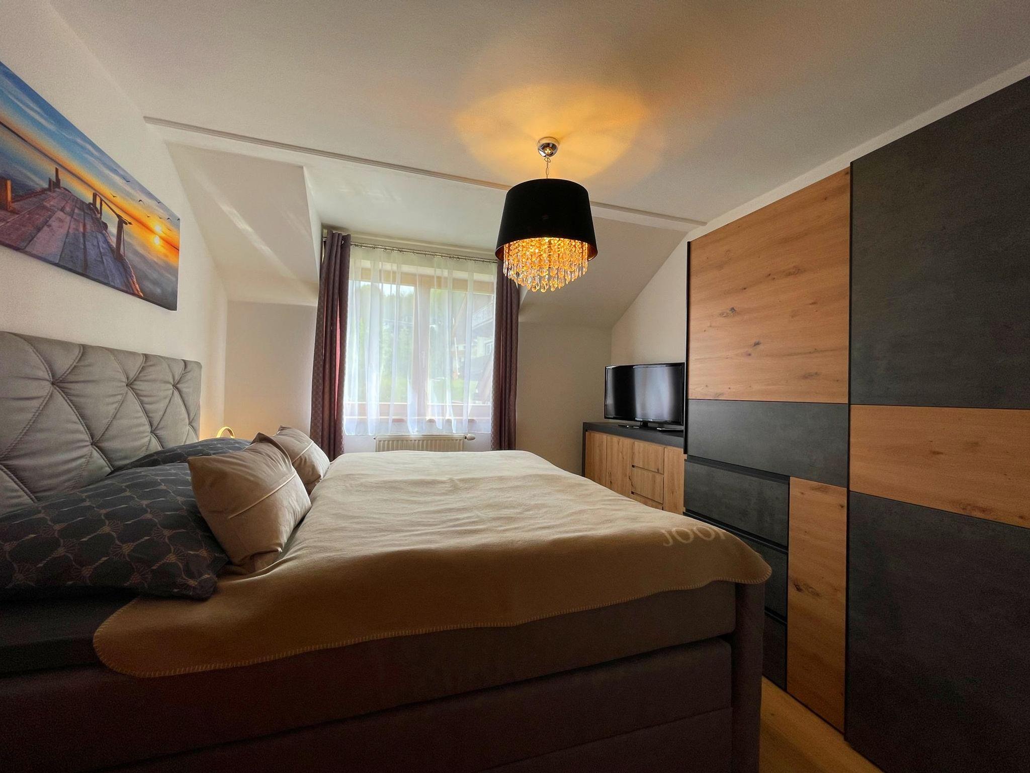 Das Apartment verfügt über 2 Schlafzimmer mit je einem großen Boxspringbett sowie Schwebetürenschränke, Boards und TV Geräten.