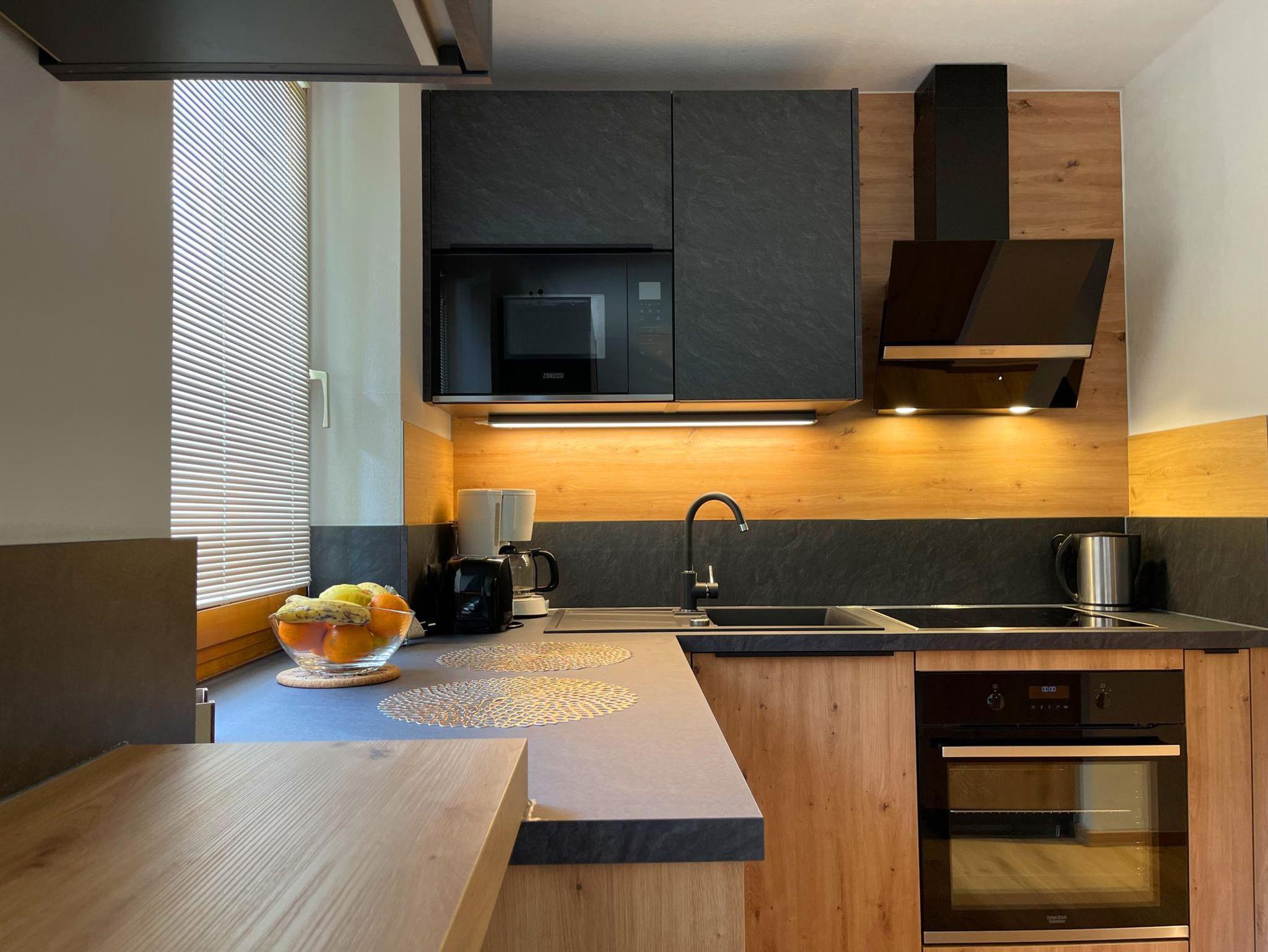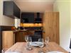 Im Wohnbereich befinden sich eine voll ausgestattete Küche und ein Essbereich.