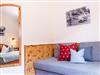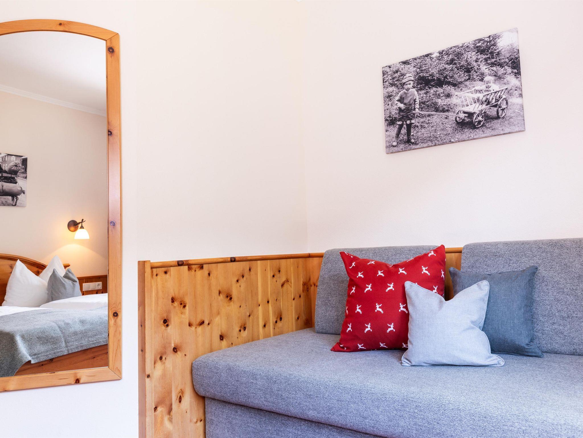 Die Bäder wurden mit Fliesen aus Sölker Marmor gestaltet und das Sofa aus dem typischen Schladminger Loden verleiht dem Zimmer eine gemütliche Atmosphäre.
