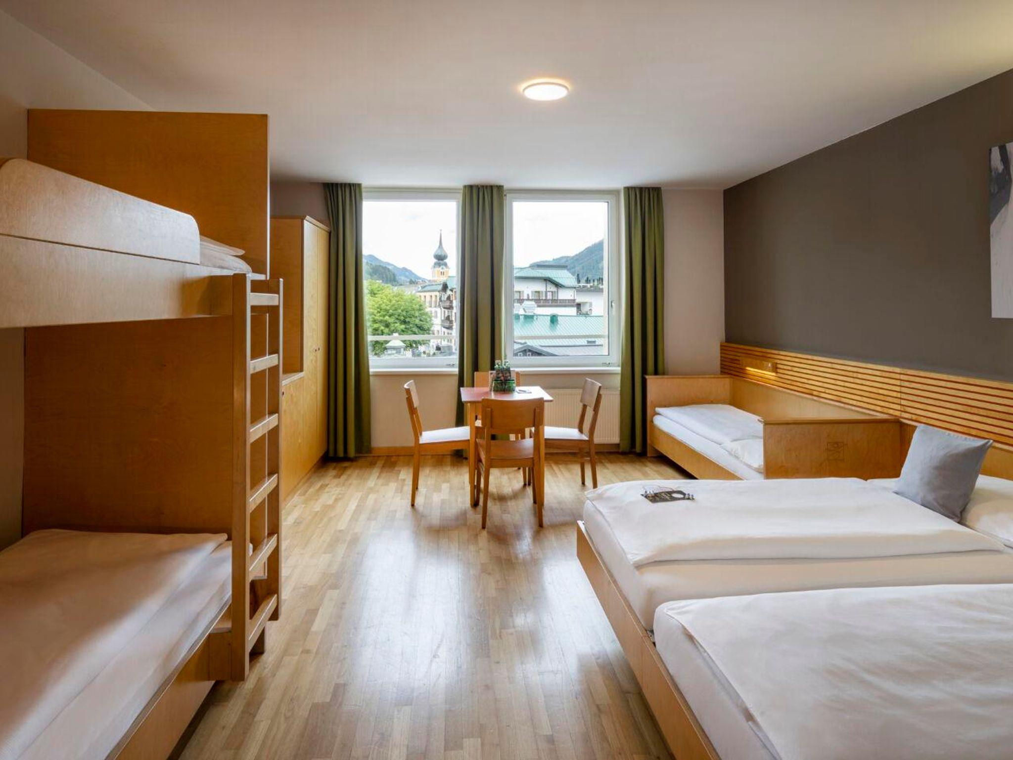 Helle und freundliche Zimmer mit flexiblen Bettensystemen (Doppel-, Einzel-, Sofa-, und Etagenbetten), funktionelle Einrichtung aus natürlichen und regionalen Rohstoffen. Badezimmer mit Dusche/WC