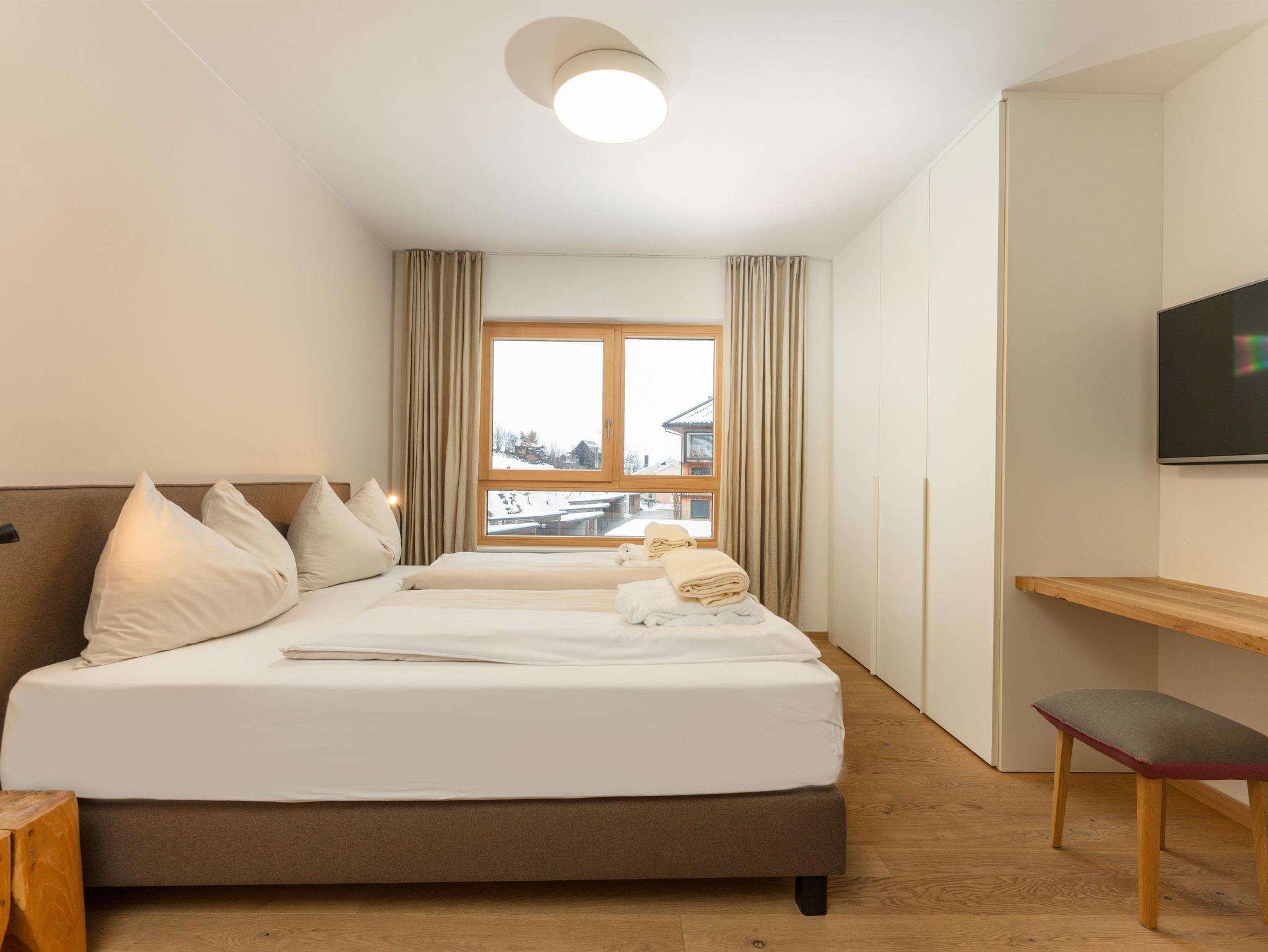 3 miteinander verbunden Häuser 38 servicierte Appartements, von 40m² Studios, Appartements mit einem, zwei oder drei Schlafzimmern bis hin zu 130m² Penthäusern, herrlichen Ausblick und Top Ausstattung inklusive! Die hochwertige Grundausstattung der Appartements mit heimischen Materialen wie Holz, Stein und Glas vermitteln ein modernes Wohlfühlambiente mit viel Licht und Aussicht, - eine Symbiose aus purem Lebensgefühl und Kraftplatz an der Sonne. Komplett ausgestattete Designküchen, großzügige Wohnräume zum Teil mit offenem Kamin, moderne & stylische Möbel, kostenfreies WLAN, Kabel TV in allen Schlaf- und Wohnräumen sowie moderne und lichtdurchflutete Badezimmer, lassen für den Gast, der seine private Freiheit schätzt, keine Wünsche offen .