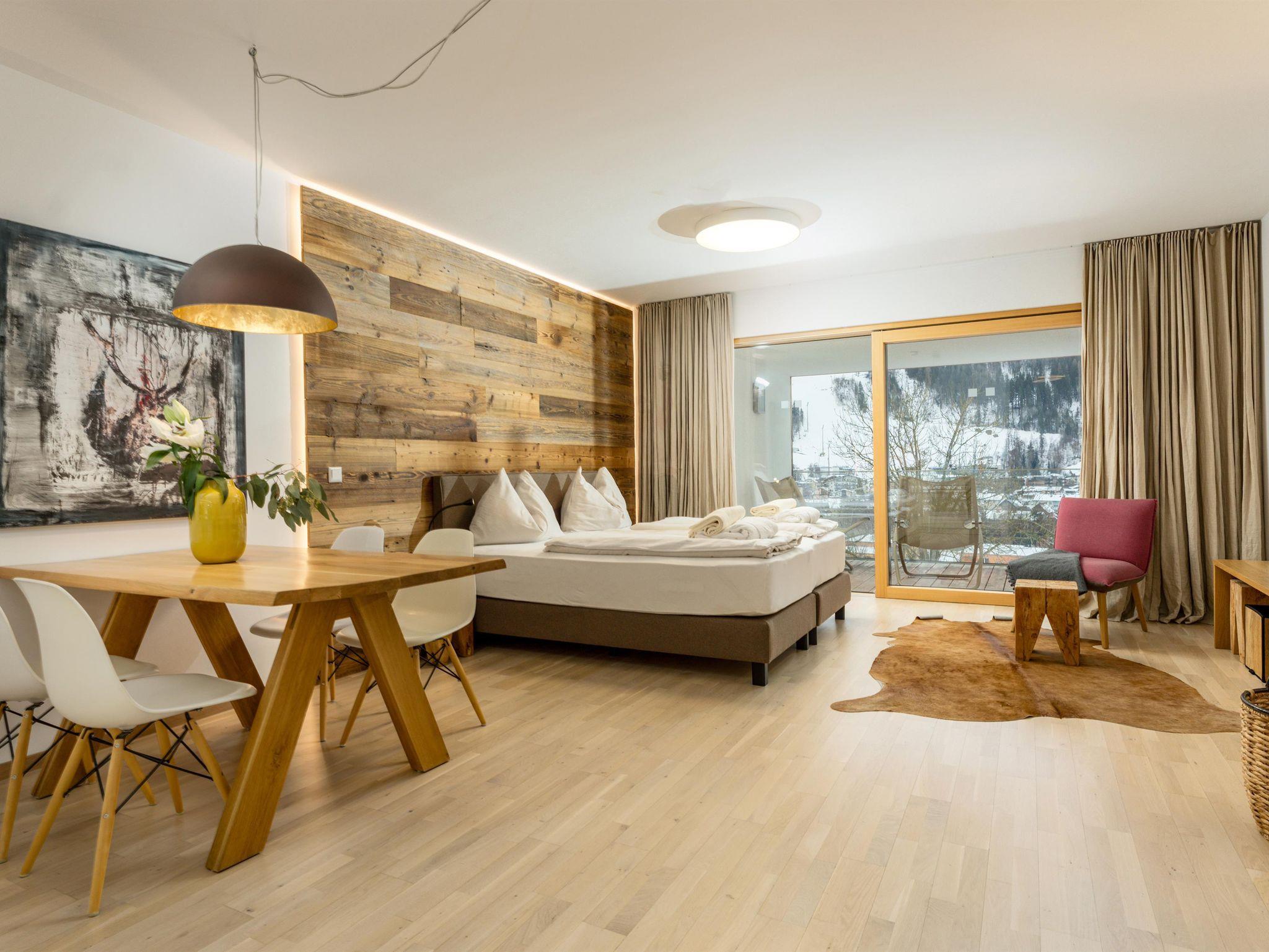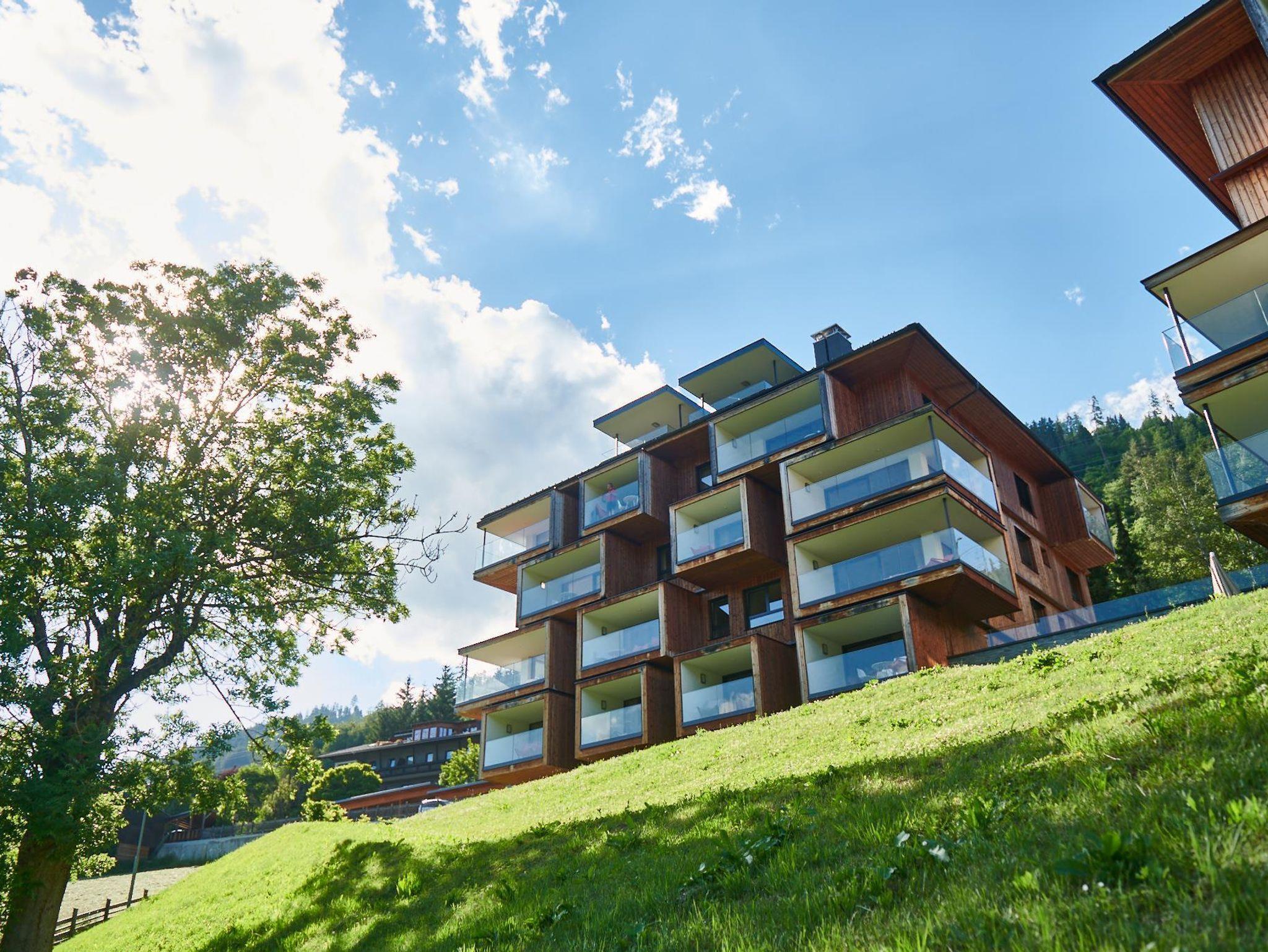 3 miteinander verbunden Häuser 38 servicierte Appartements, von 40m² Studios, Appartements mit einem, zwei oder drei Schlafzimmern bis hin zu 130m² Penthäusern, herrlichen Ausblick und Top Ausstattung inklusive! Die hochwertige Grundausstattung der Appartements mit heimischen Materialen wie Holz, Stein und Glas vermitteln ein modernes Wohlfühlambiente mit viel Licht und Aussicht, - eine Symbiose aus purem Lebensgefühl und Kraftplatz an der Sonne. Komplett ausgestattete Designküchen, großzügige Wohnräume zum Teil mit offenem Kamin, moderne & stylische Möbel, kostenfreies WLAN, Kabel TV in allen Schlaf- und Wohnräumen sowie moderne und lichtdurchflutete Badezimmer, lassen für den Gast, der seine private Freiheit schätzt, keine Wünsche offen .