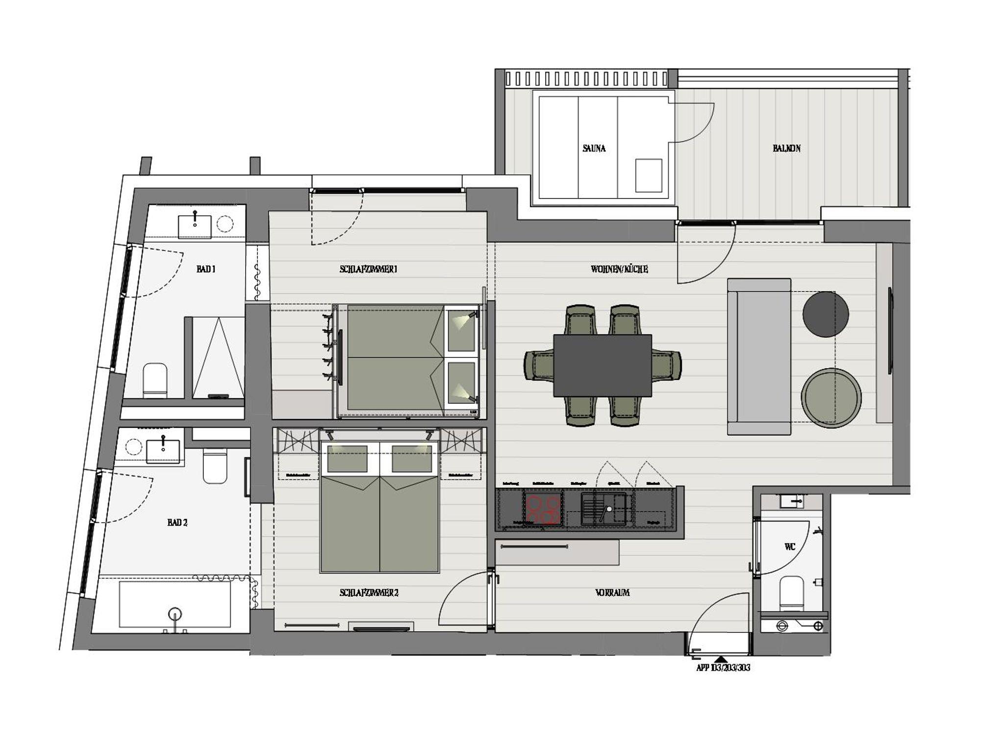 In der Grand Suite lebt man auf großem Fuß. Vier bis sechs Personen finden in den zwei Schlafzimmern und der großen Wohnküche locker Platz. Und gegen morgendliche Warteschlangen helfen zwei vollausgestattete Badezimmer und drei WC‘s. Auf der Loggia sorgen die private Sauna und die Wärmelampe für heiße Nächte.