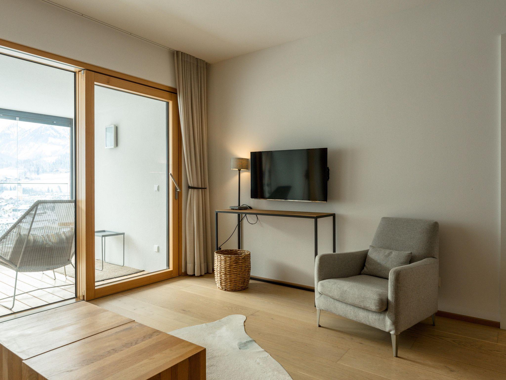 3 miteinander verbunden Häuser 38 servicierte Appartements, von 40m² Studios, Appartements mit einem, zwei oder drei Schlafzimmern bis hin zu 130m² Penthäusern, herrlichen Ausblick und Top Ausstattung inklusive! Die hochwertige Grundausstattung der Appartements mit heimischen Materialen wie Holz, Stein und Glas vermitteln ein modernes Wohlfühlambiente mit viel Licht und Aussicht, - eine Symbiose aus purem Lebensgefühl und Kraftplatz an der Sonne. Komplett ausgestattete Designküchen, großzügige Wohnräume zum Teil mit offenem Kamin, moderne & stylische Möbel, kostenfreies WLAN, Kabel TV in allen Schlaf- und Wohnräumen sowie moderne und lichtdurchflutete Badezimmer, lassen für den Gast, der seine private Freiheit schätzt, keine Wünsche offen .